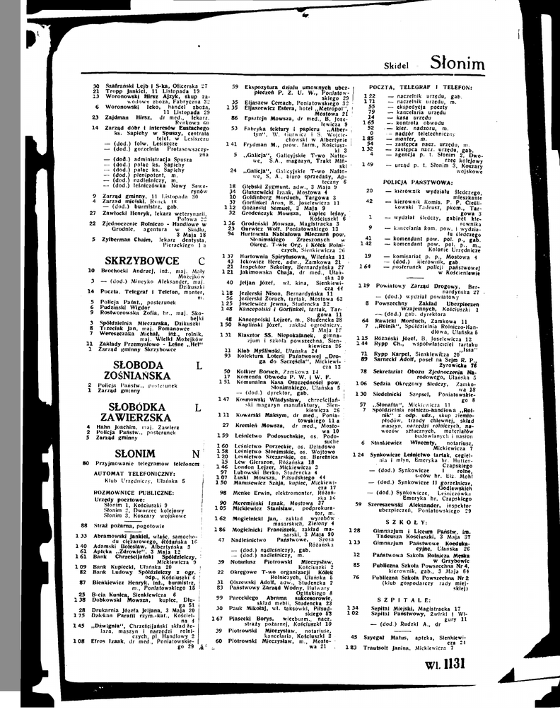 skidei 30 21 13 Szafrański Lejb I S-ka, Oficerska 27 T r o p p Jankiel, 11 Listopada 19 W o r o n o w s k i Hirsz A j z y k , skup za w o d o w y z b o ż a , Fabryczna 32 6 Woronowski icko, handel zboża, 1 1 Listopada 29 23 Zajdman Hirsz, dr m e d . , lekarz, >,>..A • Rynkowa 60 14 Z a r z ą d d ó b r I Interesów Eustachego k s . Sapiehy w Spuszy, centrala telef. w Lesiszczu — ( d o d . ) f o l w . Lesiszcze — ( d o d . ) gorzelnia Protasowszczyzna — ( d o d . ) administracja Spusza — ( d o d . ) patac ks. Sapiehy — ( d o d . ) patac k s . Sapiehy — ( d o d . ) plenipotent, m . — ( d o d . ) nadleśniczy, rn. — ( d o d . ) leśniczówka N o w y Sewe rynów 9 Z a r z ą d g m i n n y , 11 Listopada 30 4 Z a r z ą d rrnelskl. Rynek 48 — ( d o d . ) b u r m i s t r z , gab. 27 Zawlocki H e n r y k , lekarz w e t e r y n a r i i . Porowa 22 22 Zjednoczenie Rolniczo - Handlowe w Grodnie, agentura w Skidlu, 3 Maja 18 5 Zylberman Chaim, lekarz dentysta, Pierackiego 1 a - Słonim POCZTA, TELEGRAF I T E L E F O N : Ekspozytura działu umownych ubez pieczeń P. Z. U . W . , P o n i a t o w 122 — naczelnik urzędu, gab. skiego 29 171 ' — naczelnik urzędu, m . Eljaszew Cemach, Poniatowskiego 32 55 — ekspedycja poczty Eljaszewicz Estera, hotel „ M e t r o p o l " , 79 135 — kancelaria urzędu Mostowa 2 1 14 — kasa urzędu 86 Epsztejn Mowsza, d r m e d . , B . Jose 163 — kontrola obwodu lewicza 9 — kier. nadzoru, m . 53 Fabryka t e k t u r y I papieru „Alber — nadzór teletechniczny t y n " , W . Ourwicz I S. W o j c i e 183 — monter, m . chowski w Albertynie 54 1 4 1 Frydman M . , p r o w . f a r m . , Kościusz — zastępca nacz. urzędu, m.' 132 — zastępca nacz. urzędu, gab. ki 3 4 — agencja p . t . Słonim 2, D w o „ G a l i c j a " , Galicyjskie T - w o Nafto rzec kolejowy we, S.A., magazyn, T r a k t M i ń 149 — urząd p . t . Słonim 3, Koszary ski 24 „ G a l i c j a " , Galicyjskie T - w o N a f t o wojskowe w e , S. A . , biuro s p r z e d a ż y , A p POLICJA P A Ń S T W O W A : teczny 6 18 Głębski Z y g m u n t , ' a d w . , 3 M a j a 9 34 Głuszewickl I z a a k , Mostowa 4 — kierowaik wydziału śledczego 10 Ooldinberg Morduch, T a r g o w a 3 mieszkanie 37 Oorflnkel A r o n , B. Joselewicza 11 — kierownik Komis. P. P. Cieśli1 1 2 Gożansld Samuel, 3 M a j a 9 pkoui., Tar 32 Orodeńczyk M o w s z a , gowa 3 kupiec leśny, — wydział śledczy, gabinet k i e Kościuszki 6 I 1 3 6 Grodeński Mowsza, Magistracka 3 rownika 23 Ourwicz W o l f , Poniatowskiego 13 kancelaria k o m . p o w . I w y d z i a 9 4 H a r t o w n i a N a b i a ł o w a Mleczarń p o w . łu śledczego 41 Słonimskiego Zrzeszonych w — komendant p o w . p o l . p . , gab. 142 O k r ę g . T - w i e O r g . i Kółek R o l n i — komendant p o w . p o l . p . , m . , czych, Sienkiewicza 26 Kolonie Urzędnicze 1 3 7 H a r t o w n i a Spirytusowa, Wileńska 1 1 I 19 komisariat p. p . , Mostowa 4 43 Ickowicz Harc, a d w . . Zamkowa 21 ( d o d . ) k i e r o w n i k , gab. 2 1 Inspektor Szkolny, Bernardyńska 27 I — posterunek policji państwowej 10 Brochocki A n d r z e j , i n ż . , m a j . Mały 1 2 1 Jakimowska C h a j a , dr m e d . , U ł a ń w Kościenlewie Możejków ska 30 3 — ( d o d . ) M i n e y k o Aleksander, m a j . j 40 Jeljan J ó z e f , wł. kina, Sienkiewi 1 1 9 Powiatowy Zarząd Drogowy, Ber Dzikuszkl j cza 44 1 4 Poczta. Telegraf i Telefon, monter, nardyńska 27 1 1 8 Jezierski Nison, Bernardyńska 1 1 m: 56 Jezierski Ż o r a c h , t a r t a k , Mostowa 63 — ( d o d . ) wydział p o w i a t o w y 5 Policja P a ń s t . , posterunek 1 2 5 Joselewicz Jewna, Studencka 32 8 Powszechny Zakład Ubezpieczeń 6 Pudzlńskt W i g d o r 1 4 8 Kancepolski I Oorfinkeł, tartak, T a r Wzajemnych, Kościuszki 1 9 R os tworów ska Z o f i a , h r . , m a j . Sko- | gowa 11 — ( d o d - ) gab. dyrektora bejki 48 Kancepolski Lejzer, m . , Studencka 28 3 Spółdzielnia Mleczarska, Dzikuszkl 6 4 Rawicki M o r d u c h , Zamkowa 11 zakład ogrodniczy, 1 5 0 Kapliński J ó z e f , 8 Trzeciak Jan, m a j . Romanowce 3 M a j a 17 I 7 „ R o l n i k " , Spółdzielnia Rolniczo-Han7 Wereszczaka M i c h a ł , Inż., rolnik, Klasztor SS. Niepokalanek. gimna d t o w a , Ułańska 5 maj. Wielki Możejków z j u m I szkoła powszechna, Sien 1 1 5 Różański Józef, B . Joselewicza 12 1 1 Z a k ł a d y Przemysłowo - Leśne „ H e l " kiewicza 26 1 4 4 Rypp C h . , współwłaściciel t a r t a k u 1 Z a r z ą d gminny Skrzybowce Klub M y ś l i w s k i , Ułańska 24 „Issa" Kolektura L o t e r i i P a ń s t w o w e j „ D r o 7 1 Rypp Karpel, Sienkiewicza 20 ga do S z c z ę ś c i a " , M i ć k i e w i 89 Sarnecki A d o l f , poseł na Sejm R. P., cza 13 Zyrowicka 76 50 Kołkier B o r u c h , Zamkowa 14 78 Sekretariat Obozu Zjednoczenia Na 17 Komenda Obwodu P. W . I W . F . 1 5 1 Komunalna Kasa Oszczędności p o w . rodowego, Ułańska 5 2 Policja P a ń s t w . , posterunek Słonimskiego, Ułańska 5 1 0 6 Sędzia O k r ę g o w y śledczy, Zamko 1 Z a r z ą d gminny — ( d o d . ) d y r e k t o r , gab. 130 wa 18 147 Kosmowski W ł a d y s ł a w , chrześcijań Siedelnicki Szr-pscI, Poniatowskie ski magazyn m a n u f a k t u r y , Sien go 8 kiewicza 26 [ „ S ł o n a f t a " , Mickiewicza 11 1 U Kowarski M a k s y m , dr m e d . , Ponia- I Spółdzielnia rolniczo-handlowa „ R o l towakiego l l a n i k " z odp. udz., skup ziemio 2 7 Kremien Mowsza, dr med., Mosto 4 Hahn Joachim, m a j . Zawierz płodów, trzody chlewnej, skład wa 10 2 Policja P a ń s t w . , posterunek maszyn, narzędzi rolniczych, n a 1 5 9 Leśnictwo Podosuchskie, os. Podo5 Zarząd gminny wozów sztucznych, materiałów suche ' budowlanych i nasion 1 6 0 Leśnictwo Porzeckie, os. Dziadowo Stankiewicz Wincenty, notariusz, 1 5 8 Leśnictwo Słonimskie, os. W o j t o w o Mickiewicza 7 1 2 0 L e ś n i c t w o Szczarskle, os. Bereźnica Synkowicze Leśnictwo t a r t 