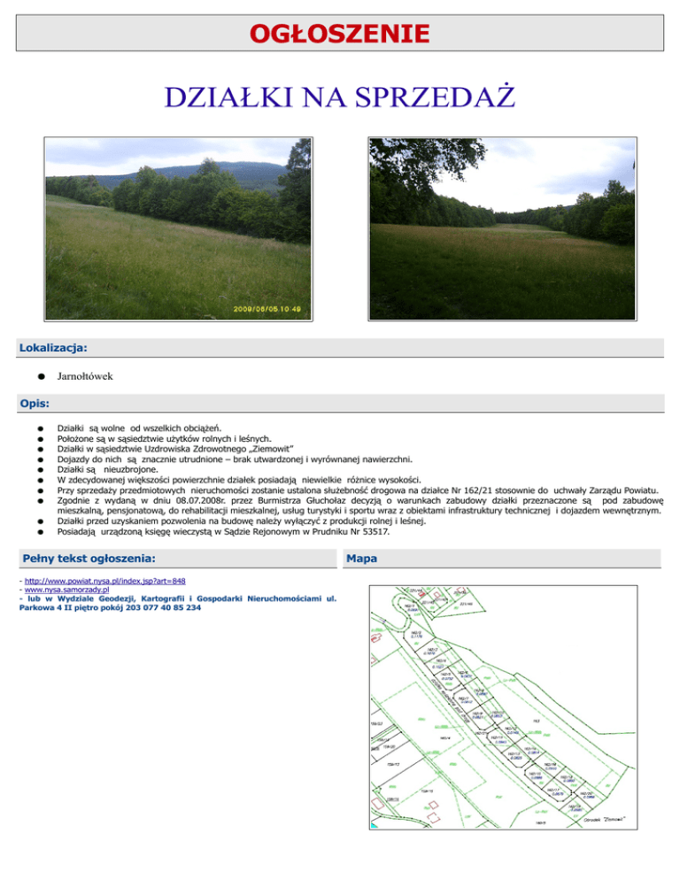 OGŁOSZENIE DZIAŁKI NA SPRZEDAŻ Lokalizacja: ● Jarnołtówek Opis: ● ● ● ● ● ● ● ● ● ● Działki są wolne od wszelkich obciążeń. Położone są w sąsiedztwie użytków rolnych i leśnych. Działki w sąsiedztwie Uzdrowiska Zdrowotnego „Ziemowit” Dojazdy do nich są znacznie utrudnione – brak utwardzonej i wyrównanej nawierzchni. Działki są nieuzbrojone. W zdecydowanej większości powierzchnie działek posiadają niewielkie różnice wysokości. Przy sprzedaży przedmiotowych nieruchomości zostanie ustalona służebność drogowa na działce Nr 162/21 stosownie do uchwały Zarządu Powiatu. Zgodnie z wydaną w dniu 08.07.2008r. przez Burmistrza Głuchołaz decyzją o warunkach zabudowy działki przeznaczone są pod zabudowę mieszkalną, pensjonatową, do rehabilitacji mieszkalnej, usług turystyki i sportu wraz z obiektami infrastruktury technicznej i dojazdem wewnętrznym. Działki przed uzyskaniem pozwolenia na budowę należy wyłączyć z produkcji rolnej i leśnej. Posiadają urządzoną księgę wieczystą w Sądzie Rejonowym w Prudniku Nr 53517. Pełny tekst ogłoszenia: - http://www.powiat.nysa.pl/index.jsp?art=848 - www.nysa.samorzady.pl - lub w Wydziale Geodezji, Kartografii i Gospodarki Nieruchomościami ul. Parkowa 4 II piętro pokój 203 077 40 85 234 Mapa Dodatkowe informacje: działka Nr 162/1 o pow. 0,0991 ha, k.m.6. Stanowi ona las klasy IV. wywoławcza wynosi 30 077 zł netto cena klasy IVb, V i Ps. kl.III. cena wywoławcza wynosi - 31 265,00 zł netto działka Nr 162/2 o pow. 0,1176 ha, k.m.6. Stanowi ona grunt orny klasy V. diałka Nr 162/12 o pow. 0,0748 ha, k.m.6. Stanowi ona grunt orny klasy cena wywoławcza wynosi - 35 256,00 zł netto IVb, i Ps. kl.III. cena wywoławcza wynosi - 25 223,00 zł netto działka Nr 162/3 o pow. 0,1070 ha, k.m.6. Stanowi ona grunt orny klasy IVb, grunty zadrzewione i zakrzewione Lz-RIVb, grunty orne kl. V, Ps. Kl III. działka Nr 162/13 o pow. 0,0825 ha, k.m.6. Stanowi ona grunt orny klasy cena wywoławcza wynosi - 32 078,00 zł netto IVb, V i Ps. kl.III. cena wywoławcza wynosi - 30 525,00 zł netto działka Nr 162/4 o pow. 0,1027 ha, k.m.6. Stanowi ona grunt orny klasy IVb, grunty zadrzewione i zakrzewione Lz-RIVb, grunt orny kl. V, Ps. Kl.III. działka Nr 162/14 o pow. 0,0814 ha, k.m.6. Stanowi ona grunty cena wywoławcza wynosi - 30 789,00 zł netto zadrzewione i zakrzewione Lz-R.IVb oraz Ps. kl.III. cena wywoławcza wynosi - 27 448,00 zł netto działka Nr 162/5 o pow. 0,0752 ha, k.m.6. Stanowi ona grunt orny klasy IVb. działka Nr 162/15 o pow. 0,0886 ha, k.m.6. Stanowi ona grunty orne kl. V i cena wywoławcza wynosi - 27 824,00 zł netto Ps. kl.III. cena wywoławcza wynosi - 32 782,00 zł netto działka Nr 162/6 o pow. 0,0831 ha, k.m.6. Stanowi ona grunt orny klasy IVb, grunty zadrzewione i zakrzewione Lz-RIVb, grunt orny kl. V, Ps. Kl.III. działka Nr 162/16 o pow. 0,0910 ha, k.m.6. Stanowi ona grunty cena wywoławcza wynosi - 28 021,00 zł netto zadrzewione i zakrzewione Lz-R.IVb oraz Ps. kl.III. cena wywoławcza wynosi - 30 685,00 zł netto działka Nr 162/7 o pow. 0,0812 ha, k.m.6. Stanowi ona grunt orny klasy IVb. działka Nr 162/17 o pow. 0,0879 ha, k.m.6. Stanowi ona grunty orne kl. V cena wywoławcza wynosi - 30 044,00 zł netto oraz Ps. kl.III. Cena wywoławcza wynosi - 32 523,00 zł netto działka Nr 162/8 o pow. 0,0897 ha, k.m.6. Stanowi ona grunt orny klasy IVb, grunty zadrzewione i zakrzewione Lz-RIVb, Ps. kl.III. działka Nr 162/18 o pow. 0,0880 ha, k.m.6. Stanowi ona grunty cena wywoławcza wynosi - 30 247,00 zł netto zadrzewione i zakrzewione Lz-RIVb oraz Ps. kl.III. cena wywoławcza wynosi - 29 674,00 zł netto działka Nr 162/9 o pow. 0,0821 ha, k.m.6. Stanowi ona grunt orny klasy Vb oraz pastwisko kl. III. działka Nr 162/19 o pow. 0,0980 ha, k.m.6. Stanowi ona grunty orne kl. cena wywoławcza wynosi - 30 377,00 zł V, ł. kl. V oraz Ps. kl.III. cena wywoławcza wynosi - 36 260,00 zł netto działka Nr 162/10 o pow. 0,0853 ha, k.m.6. Stanowi ona grunt orny klasyIVb, grunty zadrzewione i zakrzewione Lz-RIVb, Ps. kl.III. działka Nr 162/20 o pow. 0,0986 ha, k.m.6. Stanowi ona grunty orne cena wywoławcza wynosi - 28 763,00 zł netto zadrzewione i zakrzewione Lz- RIVb oraz Ps. kl.III. cena wywoławcza wynosi - 33 248,00 zł netto działka Nr 162/11 o pow. 0,0845 ha, k.m.6. Stanowi ona grunt orny Przetargi na ww działki odbędą się w siedzibie Starostwa Powiatowego w Nysie, Wydział Geodezji, Kartografii i Gospodarki Nieruchomościami przy ul. Parkowej 4, II piętro, pokój Nr 208 wg harmonogramu przedstawionego niżej: dz. dz. dz. dz. dz. dz. dz. dz. dz. dz. Nr Nr Nr Nr Nr Nr Nr Nr Nr Nr 162/1 162/2 162/3 162/4 162/5 162/6 162/7 162/8 162/9 162/10 - 16.07. 2009 r. 16.07. 2009 r. 16.07. 2009 r. 16.07. 2009 r. 16.07. 2009 r. 16.07. 2009 r. 16.07. 2009 r. 16.07. 2009 r. 16.07. 2009 r. 16.07. 2009 r. - godz. - godz. - godz. - godz. - godz. - godz. - godz. - godz. - godz. - godz. 09:00 09:30 10:00 10:30 11:00 11:30 12:00 12:30 13:00 13:30 dz. dz. dz. dz. dz. dz. dz. dz. dz. dz. Nr Nr Nr Nr Nr Nr Nr Nr Nr Nr 162/11 162/12 162/13 162/14 162/15 162/16 162/17 162/18 162/19 162/20 - 16.07. 2009 r. 16.07. 2009 r. 17.07. 2009 r. 17.07. 2009 r. 17.07. 2009 r. 17.07. 2009 r. 17.07. 2009 r. 17.07. 2009 r. 17.07. 2009 r. 17.07. 2009 r. - godz. godz. godz. godz. godz. godz. godz. godz. godz. godz. 14:00 14:30 09:00 09:30 10:00 10:30 11:00 11:30 12:00 12:30 Wadium w wysokości 10% ceny wywoławczej należy wpłacić w gotówce w kasie Starostwa przy ul. Moniuszki 9-10 lub na konto Starostwa Powiatowego w Nysie BS w Otmuchowie O/Nysa nr 26 8872 1026 0031 4947 2000 0360 w terminie do dnia 10 lipca 2009r. Za datę wniesienia wadium uważa się datę wpływu środków pieniężnych na rachunek Starostwa Powiatowego w Nysie. Osoba, która wygra przetarg ponosi również koszty przygotowania nieruchomości do sprzedaży, które wynoszą dla każdej z działek po 1474,20 zł. Do wylicytowanej ce