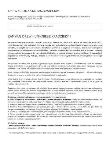 KPP W GRODZISKU MAZOWIECKIM Źródło: http://kppgrodzisk.policja.waw.pl/pgm/aktualnosci/3763,ZAMYKAJ-DRZWI-UNIKNIESZ-KRADZIEZY.html Wygenerowano: Piątek, 3 marca 2017, 12:32 Strona znajduje się w archiwum. ZAMYKAJ DRZWI- UNIKNIESZ KRADZIEŻY ! Zwykle działają w podobny sposób. Wybierają lokale, w których drzwi nie są zamknięte na klucz. Jeśli domownicy nie usłyszeli intruza, wtedy ten wchodzi do środka. Zabiera leżące na wierzchu torebki, kluczyki od samochodu, telefony, portfele i szybko wychodzi. Grodziscy policjanci przypominają o zamykaniu drzwi mieszkań i domów, nawet gdy cała rodzina jest w środku. Złodziej nie potrzebuje dużo czasu by nas okraść. Zadbajmy o mienie własne, a także sąsiada. W sytuacjach zagrożenia informujmy Policję. Razem możemy skutecznie wyeliminować przestępców z naszego otoczenia. Nasze domy lub mieszkania, w których zgromadzony jest dorobek wielu lat pracy, stanowi łakomy kąsek dla złodzieja. Okazją do kradzieży mogą być otwarte drzwi lub okna podczas chwilowej nieobecności lokatorów, a nawet gdy wszyscy domownicy są w środku, ale zajęci lub śpiący nie słyszą co się dzieje w drugim pokoju lub przy drzwiach. Jedną z metod pozbawienia właściciela wartościowych przedmiotów są tzw. kradzieże „na śpiocha” – sprawca działa gdy domownicy w nocy są w domu, śpią, a drzwi mieszkania lub domu są otwarte. Wielu złodziei działa również w środku dnia. Przestępcy często obserwują zachowanie lokatorów, sprawdzają ich zwyczaje. Gdy już wiedzą, że dana osoba nie zamyka drzwi na klucz, wchodzą do środka. Niezauważeni kradną to, co znajduje się najbliżej drzwi wejściowych. Złodzieje wykorzystują również czas, gdy właściciel domu wyjdzie do przydomowego ogródka, zajmie się porządkowaniem swoich posesji. Niestety nie wszyscy mają świadomość, że pozostawienie otwartych drzwi domu, nawet na krótko, może spowodować straty. Niebezpieczeństwo stwarzają również częściej otwierane wiosną okna. Grodziscy policjanci radzą jak do minimum ograniczyć te zagrożenia: 1. Zawsze zamykaj drzwi domu i mieszkania, nawet gdy jesteś w środku- zajęty pracami domowymi możesz nie zauważyć i nie usłyszeć, że ktoś wszedł do środka. Często też nie reagujesz sądząc, że to ktoś z domowników. 2. Reaguj na odgłos naciskanej klamki- sprawdzaj kto to robi i natychmiast informuj o takich sytuacjach Policję. 3. Dzwoń na Policję jeżeli zobaczysz nieznajomego, próbującego otwierać drzwi u sąsiada, a wiesz, że nie ma go w domu lub zauważysz podejrzanie zachowujące się osoby na klatce schodowej, przed blokiem lub na parkingu. 4. Uczulaj na takie zagrożenia swoich sąsiadów, zwłaszcza gdy w mieszkaniu zostają osoby starsze lub dzieci. 5. Poznaj swojego sąsiada. Dobrze znający się i zorganizowani sąsiedzi mogą skutecznie przeciwstawić się włamaniom, kradzieżom, rozbojom i chuligaństwu. Porozmawiaj z Twoim sąsiadem o bezpieczeństwie w Waszym miejscu zamieszkania, ustalcie jak zachować „sąsiedzką czujność”: Wychodząc z domu: - zamknij wszystkie drzwi i okna, wychodząc nawet na krótko na własną posesję- złodziej nie potrzebuje wiele czasu, aby wejść do Twojego domu; - nie zostawiaj kluczy w "dobrych schowkach" (pod wycieraczką, za doniczką na oknie, za framugą drzwi) - złodziej zazwyczaj zna te miejsca nie gorzej od Ciebie; - zamknij również okienka piwniczne i innych pomieszczeń gospodarczych, przez które można przedostać się do domu; - wychodząc wieczorem z domu zaciągnij zasłony lub opuść żaluzje i pozostaw włączone światło - stwórz pozory, że w domu ktoś jest; - nie pozostawiaj w drzwiach żadnych kartek typu "wyszłam do Krysi", włamywacz bardzo lubi gwarancje, że w domu nikogo nie ma. Nie ryzykuj niepotrzebnie: - unikaj przechowywania w domu znacznych kwot pieniędzy i wartościowej biżuterii. Takie "dobre schowki" jak szafa z bielizną, doniczka z kwiatami, książki czy cukiernica są bardzo dobrze znane włamywaczom i penetrowane przez nich w pierwszej kolejności; - nie opowiadaj o swoim majątku w miejscach, gdzie mogą Cię słyszeć obcy; - jeżeli wyjeżdżasz na dłużej, przekaż do przechowania cenne dla Ciebie rzeczy osobom godnym zaufania; - zapisz numery fabryczne wartościowych przedmiotów (magnetowid, komputer, telewizor, kamera, video itp.), oznakuj je w indywidualny, trwały sposób, niewidoczny dla złodzieja; -sporządź listę, a jeżeli to możliwe, również dokumentację fotograficzną cennych przedmiotów (biżuteria, antyki, cenne obrazy, stare zegarki itp.) - w przypadku kradzieży zwiększy to znacznie szansę ich odzyskania; - równoległe z zabezpieczeniem mieszkania w zamki, alarmy, podwójne drzwi itp. nie zapomnij o jego ubezpieczeniu w firmie ubezpieczeniowej, aby w przypadku włamania zrekompensować poniesione straty. kz Ocena: 0/5 (0) Tweetnij