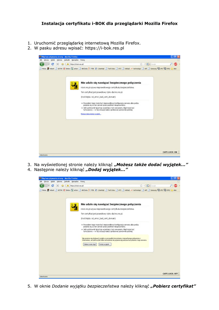 Instalacja certyfikatu i-BOK dla przeglądarki Mozilla Firefox 1. Uruchomić przeglądarkę internetową Mozilla Firefox. 2. W pasku adresu wpisać: https://i-bok.res.pl 3. Na wyświetlonej stronie należy kliknąć „Możesz także dodać wyjątek...” 4. Następnie należy kliknąć „Dodaj wyjątek...” 5. W oknie Dodanie wyjątku bezpieczeństwa należy kliknąć „Pobierz certyfikat” 6. Następnie należy zaznaczyć opcję Zachowaj ten wyjątek na stałe i kliknąć „Potwierdź wyjątek bezpieczeństwa” 7. Certyfikat został zainstalowany, można połączyć się z Wirtualnym Biurem Obsługi Klienta pod adresem i-bok.res.pl