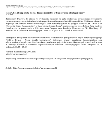 Artykuł pochodzi ze strony http://www.zig.eco.pl/a125_rola_csr_corporate_social_responsibility_w_budowaniu_strategii_firmy.html Rola CSR (Corporate Social Responsibility) w budowaniu strategii firmy 25.08.2009 Zapraszamy Państwa do udziału w wydarzeniu mającym na celu zbudowanie świadomości problematyki zrównoważonego rozwoju i odpowiedzialnego biznesu (Corporate Social Responsibility, CSR) oraz edukacji i inspiracji firm sektora handlu detalicznego i dóbr konsumpcyjnych do podjęcia działań CSR: "Rola CSR (Corporate Social Responsibility) w budowaniu strategii firmy", organizowanym przez Polską Radę Centrów Handlowych, w partnerstwie z PricewaterhouseCoopers oraz Fundacją Kronenberga Citi Handlowy, 15 września br. w Centrum Konferencyjnym Zielna 37, w godz. 9.00 - 17.00, w Warszawie. Szczególnie zależy nam na Państwa uczestnictwie w charakterze prelegentów w części panelu dyskusyjnego "CSR a Rynek - Nowe ścieżki konsumpcji", dotyczącej zmiany oczekiwań konsumenckich oraz odpowiedzialnych społecznie i środowiskowo produktów, pojęcia świadomej konsumpcji, a także roli sektora w edukacji klientów i szerzeniu odpowiedzialnych wzorców konsumpcyjnych. Panel odbędzie się w godzinach 11.45 - 13.45. Kontakt: [email protected] http://www.pwc.com.pl/ Zapraszamy również do udziału w pozostałych sesjach. W załączniku znajdą Państwo pełną agendę. Źródło: http://www.pwc.com.pl/ (http://www.pwc.com.pl/)