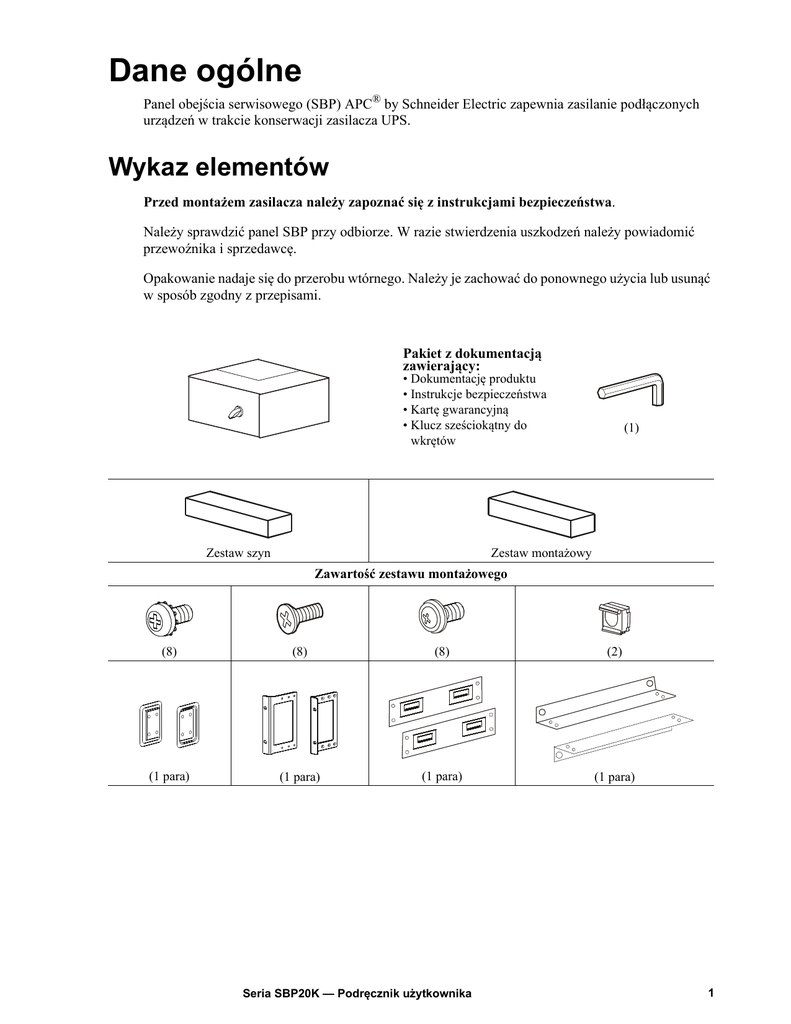 Dane ogólne Panel obejścia serwisowego (SBP) APC® by Schneider Electric zapewnia zasilanie podłączonych urządzeń w trakcie konserwacji zasilacza UPS. Wykaz elementów Przed montażem zasilacza należy zapoznać się z instrukcjami bezpieczeństwa. Należy sprawdzić panel SBP przy odbiorze. W razie stwierdzenia uszkodzeń należy powiadomić przewoźnika i sprzedawcę. Opakowanie nadaje się do przerobu wtórnego. Należy je zachować do ponownego użycia lub usunąć w sposób zgodny z przepisami. Pakiet z dokumentacją zawierający: • Dokumentację produktu • Instrukcje bezpieczeństwa • Kartę gwarancyjną • Klucz sześciokątny do wkrętów Zestaw szyn (1) Zestaw montażowy Zawartość zestawu montażowego (8) (8) (8) (2) (1 para) (1 para) (1 para) (1 para) Seria SBP20K — Podręcznik użytkownika 1 Dane techniczne Parametry elektryczne Model SBP SBP20KP SBP20KRMT4U SBP20KRMI4U Znamionowe napięcie wejściowe Znamionowe napięcie wyjściowe Prąd wejściowy maks. Moc wyjściowa W/VA maks. 200/208/240 VAC 50/60 Hz, 2P+PE 200/208/240 VAC 50/60 Hz, 2P+PE 125 A każda faza 30 000 220/230/240 VAC 50/60 Hz 1P+N+PE 220/230/240 VAC 50/60 Hz, 1P+N+PE 125 A każda faza 30 000 380/400/415 VAC 50/60 Hz, 3P+N+PE 220/230/240 VAC 50/60 Hz, 1P+N+PE 125 A każda faza 30 000 200/208/240 VAC 50/60 Hz, 2P+PE 200/208/240 VAC 50/60 Hz, 2P+PE 125 A każda faza 30 000 220/230/240 VAC 50/60 Hz, 1P+N+PE 220/230/240 VAC 50/60 Hz, 1P+N+PE 125 A każda faza 30 000 380/400/415 VAC 50/60 Hz, 3P+N+PE 220/230/240 VAC 50/60 Hz, 1P+N+PE 125 A każda faza 30 000 Uwaga: W powyższej tabeli zamieszczono wartości parametrów elektrycznych panelu SBP, nie zaś zasilacza UPS. Parametry elektryczne zasilacza UPS mogą być inne. Panel SBP wymaga przewodu o przekroju minimum 25 mm2 i maksimum 50 mm2. Dane techniczne okablowania zasilacza UPS można znaleźć w instrukcji użytkownika zasilacza UPS. Wartości znamionowe parametrów elektrycznych panelu SBP muszą być równe lub większe od wartości dla zasilacza UPS, do którego jest on podłączany. Wyłącznik automatyczny obwodu wejściowego nie może przekroczyć wartości zalecanej dla zasilacza UPS. Obciążenie systemu nie może przekraczać wartości znamionowej obciążenia zasilacza UPS. Na przykład, jeśli używany jest panel SBP 3840 VA z zasilaczem o mocy 3000 VA, maksymalne obciążenie obsługiwane przez system wynosi 3000 VA. Parametry środowiskowe Temperatura Maksymalna wysokość Wilgotność Eksploatacji od 0° do 40°C (od 32° do 104°F) Przechowywania od -15° do 45°C (od -40° do 113°F) Eksploatacji 3 000 m (10 000 stóp) Przechowywania 15 000 m (50 000 stóp) wilgotność względna od 0 do 95%, bez kondensacji pary wodnej Urządzenie przeznaczone jest do użytku w pomieszczeniach zamkniętych. Panel obejścia serwisowego nie powinien być eksploatowany w pomieszczeniach, w których występuje nadmierne zapylenie, lub w których temperatura i wilgotność wykraczają poza zalecane granice. Należy się upewnić, że odpowietrzniki panelu SBP nie są zablokowane. Należy zapewnić odpowiednią wentylację. Zmiany oraz modyfikacje urządzenia nie zaakceptowane w sposób jednoznaczny przez APC mogą spowodować unieważnienie gwarancji. 2 Seria SBP20K — Podręcznik użytkownika Panel przedni by Schneider Electric Normal Load protected Test AC Input Test Normal Bypass UPS Load not protected suo0641a Load not protected Panele tylne Element Opis Wyjścia urządzenia Bezpieczniki obwodu wyjściowego sprzętu Dostęp do podłączenia wejściowych kabli zasilających Dostęp do podłączenia wyjściowych kabli zasilających SBP20KRMI4U SBP20KRMT4U suo0686a suo0687a SBP20KP suo0688a Seria SBP20K — Podręcznik użytkownika 3 Instalacja Konfiguracja stosowa Panel SBP należy umieszczać nad zewnętrznymi pakietami akumulatorowymi i zasilaczem UPS. Poszczególne klamry należy przykręcać do urządzeń czterema śrubami ozdobnymi (dołączonymi do zestawu) (zob. schemat). 4x suo0689a 4x Konfiguracja do montażu w szafie Montaż szyn w szafie Szczegółowe instrukcje dotyczące montażu szyn w znajdują się w dokumentacji dostarczonej w zestawie szyn. Za pomocą ośmiu śrub z łbem płaskim (dołączone do zestawu) zamocuj klamry montażowe do urządzenia. suo0690a Montaż klamer do montażu w szafie 4x 4x Montaż zacisków Za pomocą ośmiu śrub z łbem walcowym (dołączone do zestawu) zamocuj zaciski do urządzenia. suo0696a 4x 4x Montaż w szafie Panel SBP należy umieszczać nad zewnętrznymi pakietami akumulatorowymi i zasilaczem UPS. W dolnym otworze każdej klamry mocującej urządzenie do szafy należy zastosować śrubę ozdobną (dołączoną do zestawu) wkręconą w otwór gwintowany. 4 7 otworów 4x 7 otworów Seria SBP20K — Podręcznik użytkownika suo0691a W górnym otworze każdej klamry mocującej urządzenie do szafy należy użyć nakrętki koszyczkowej oraz śruby ozdobnej (dołączona do zestawu). Konfiguracja do montażu na ścianie Za pomocą ośmiu śrub ozdobnych (dołączone do zestawu) zamocuj klamry do montażu na ścianie do urządzenia (po cztery na każdą klamrę). 4x suo0697a Zamocuj panel SBP do ściany. Wybierz śruby (nie są dołączone do zestawu), odpowiednie do ciężaru urządzenia i materiału ściany, do której zostanie ono zamocowane. 4x Seria SBP20K — Podręcznik użytkownika 5 Podłączenie okablowania do panelu obejściowego zasilania Podłączenie panelu do instalacji elektrycznej musi być wykonane przez elektryka z uprawnieniami. Należy wykonać instalacje zgodnie z obowiązującymi normami elektrycznymi krajowymi i lokalnymi. Należy wyłączyć bezpiecznik linii zasilania. x7 suo0702a Usuń panel dostępowy listwy zaciskowej zlokalizowany w górnej części urządzenia. Dotyczy wszystkich modeli — Usuń panel dostępowy wraz z trzema elementami do wybicia. suo0703a Usuń wszystkie trzy elementy do wybicia z panelu. x6 Model SBP20KP ma dwa panele dostępowe. Zdejmij oba panele. s