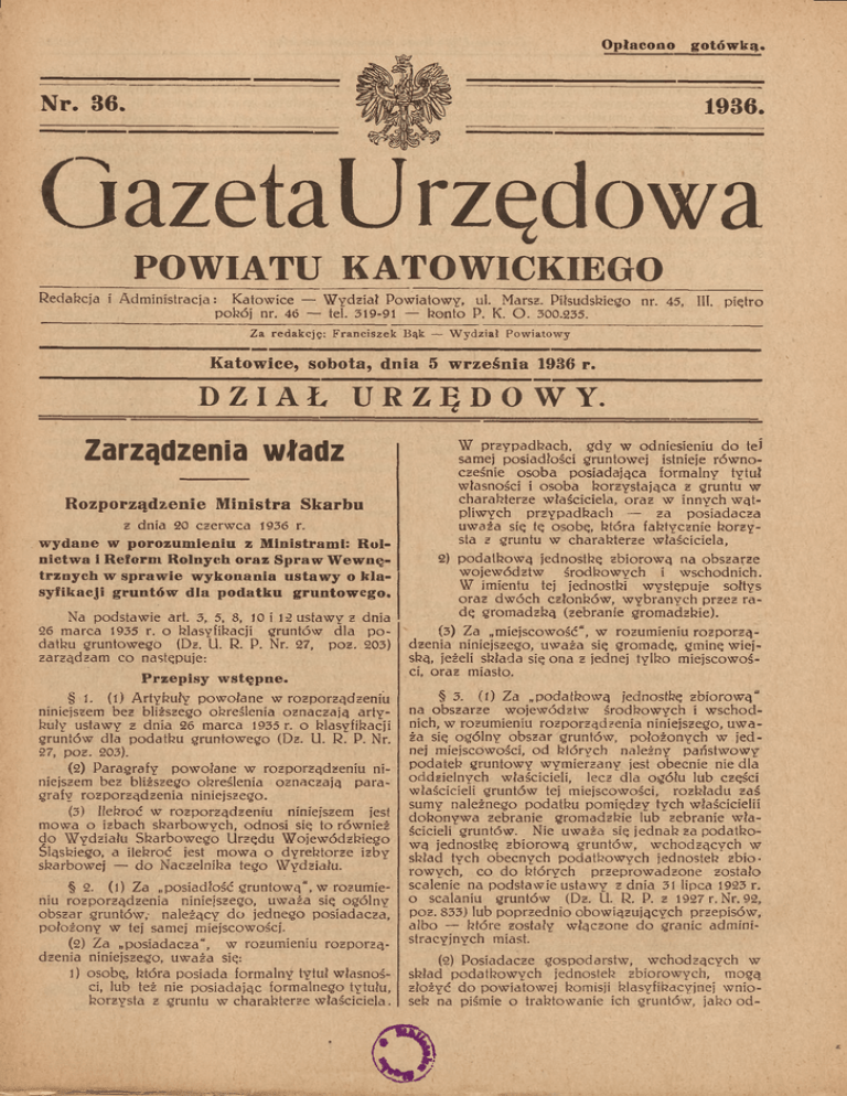 Opłacono Nr. 36. gotówką. 1936. G azeta U rzęd owa POWIATU KATOWICKIEGO Redakcja i Administracja: Katowice — Wydział Powiatowy, ul. Marsz. Piłsudskiego nr. 45, III. piętro pokój nr. 46 — teł. 319-91 — konto P. K. O. 300.235. Za redakcję: Franciszek Bąk — Wydział Powiatowy Katowice, sobota, dnia 5 września 1936 r. DZIAŁ URZĘDOWY! Zarządzenia władz Rozporządzenie Ministra Skarbu z dnia 20 czerwca 1936 r. wydane w porozumieniu z Ministrami: Rol nictwa i Reform Rolnych oraz Spraw Wewnę trznych w sprawie wykonania ustawy o kla syfikacji gruntów dla podatku gruntowego. Na podstawie art. 3, 5, 8, 10 i 12 ustawy z dnia 26 marca 1935 r. o klasyfikacji gruntów dla po datku gruntowego (Dz. U. R. P. Nr. 27, poz. 203) zarządzam co następuje: Przepisy wstępne. W przypadkach, gdy w odniesieniu do te) samej posiadłości gruntowej istnieje równo cześnie osoba posiadająca formalny tytuł własności i osoba korzystająca z gruntu w charakterze właściciela, oraz w innych wąt pliwych przypadkach — za posiadacza uważa się tę osobę, która faktycznie korzy sta z gruntu w charakterze właściciela, 2) podatkową jednostkę zbiorową na obszarze województw środkowych i wschodnich. W imientu tej jednostki występuje sołtys oraz dwóch członków, wybranych przez ra dę gromadzką (zebranie gromadzkie). (3) Za „miejscowość", w rozumieniu rozporzą dzenia niniejszego, uważa się gromadę, gminę wiej ską, jeżeli składa się ona z jednej tylko miejscowoś ci, oraz miasto. § 3. (1) Za „podatkową jednostkę zbiorową" § 1. (l) Artykuły powołane w rozporządzeniu niniejszem bez bliższego określenia oznaczają arty na obszarze województw środkowych i wschod kuły ustawy z dnia 26 marca 1935 r. o klasyfikacji nich, w rozumieniu rozporządzenia niniejszego, uwa gruntów dla podatku gruntowego (Dz. U. R. P. Nr. ża się ogólny obszar gruntów, położonych w jed nej miejscowości, od których należny państwowy 27, poz. 203). podatek gruntowy wymierzany jest obecnie nie dla (2) Paragrafy powołane w rozporządzeniu ni oddzielnych właścicieli, lecz dla ogółu lub części niejszem bez bliższego określenia oznaczają para właścicieli gruntów tej miejscowości, rozkładu zaś grafy rozporządzenia niniejszego. sumy należnego podatku pomiędzy tych właścicielu (3) Ilekroć w rozporządzeniu niniejszem jest dokonywa zebranie gromadzkie lub zebranie wła mowa o izbach skarbowych, odnosi się to również ścicieli gruntów. Nie uważa się jednak za podatko do Wydziału Skarbowego Urzędu Wojewódzkiego wą jednostkę zbiorową gruntów, wchodzących w Śląskiego, a ilekroć jest mowa o dyrektorze izby skład tych obecnych podatkowych jednostek zbio skarbowej — do Naczelnika tego Wydziału. rowych, co do których przeprowadzone zostało § 2. (l) Za „posiadłość gruntową", w rozumie scalenie na podstawie ustawy z dnia 31 lipca 1923 r. niu rozporządzenia niniejszego, uważa się ogólny o scalaniu gruntów (Dz. U. R. P. z 1927 r. Nr. 92, obszar gruntów, należący do jednego posiadacza, poz. 833) lub poprzednio obowiązujących przepisów, albo — które zostały włączone do granic admini położony w tej samej miejscowość). stracyjnych miast. (2) Za „posiadacza", w rozumieniu rozporzą dzenia niniejszego, uważa się: (2) Posiadacze gospodarstw, wchodzących w 1) osobę, która posiada formalny tytuł własnoś skład podatkowych jednostek zbiorowych, mogą ci, lub też nie posiadając formalnego tytułu, złożyć do powiatowej komisji klasyfikacyjnej wnio korzysta z gruntu w charakterze właściciela. sek na piśmie o traktowanie ich gruntów, jako od- Str 146 Gazeta Urzędowa pow. Katowickiego Nr. 36 rębnej posiadłości gruntowej, pod warunkiem dołą 2) członkowie ci i zastępcy powinni pochodzić czenia do tego wniosku planów pomiarowych swych z grona miejscowych płatników państwowe go podatku gruntowego; grantów, sporządzonych przez mierniczego przy sięgłego w sposób umożliwiający wkreślenie posia ?) w posiedzeniach komisji biorą oni udział dłości na planie miejscowości (§ 31). Przepis po tylko wówczas, gdy przedmiotem obrad są wyższy stosuje się również do posiadaczy części sprawy, dotyczące gruntów odnośnego mia gospodarstw, wykazanych jako całość na planach sta. W tych przypadkach nie biorą udziału klasyfikacyjnych, sporządzonych w związku z prze w posiedzeniach komisji członkowie i za budową ustroju rolnego; w tych przypadkach za stępcy, powołani z listy rady powiatowej. miast planu pomiarowego wydzielonej części może 4) przepis ust. (t) art. 7, stanowiący, że jeden być dołączony do wniosku od rys lub wyciąg z członek i zastępca powinni być przedstawi odrysu planu klasyfikacyjnego, sporządzonego w cielami większej, a jeden członek i zastęp związku z przebudową ustroju rolnego, z wkreca — mniejszej własności gruntowej, nie sto śleniem na nim granicy wydzielonej części. suje się do członków i zastępców, powoły wanych z list rad miejskich miast wydzie § 4. (l) Za „większą własność gruntową", w lonych. rozumieniu rozporządzenia niniejszego uważa się = (2) W skład powiatowej komisji klasyfikacyjnej 1) w województwach zachodnich, południowych na obszar m. st. Warszawy wchodzą jako przed i środkowych, gospodarstwa o łącznym ob stawiciele miejscowych płatników państwowego po szarze ponad 50 ha, datku gruntowego dwaj członkowie i ich zastępcy, 2) w województwach pozostałych, gospodar powołani przez urząd skarbowy z listy, przedsta stwa o łącznym obszarze ponad 100 ha, wionej przez organ stanowiący gminy m. st. War bez względu na kategorie gruntów,. wcho szawy. Przepisy pkt. 2) i 4) ust. (1) mają tu od dzących w skład tych gospodarstw. powiednie zastosowanie. (2) Za „mniejszą własność gruntową" uważa § 10. Na obszarze województwa śląskiego się gospodarstwa pozostałe. kandydatów na członków i zastępców powi