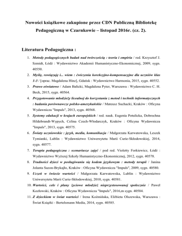 Nowości książkowe zakupione przez CDN Publiczną Bibliotekę Pedagogiczną w Czarnkowie – listopad 2016r. (cz. 2). Literatura Pedagogiczna : 1. Metody pedagogicznych badań nad twórczością : teoria i empiria / red. Krzysztof J. Szmidt, Łódź : Wydawnictwo Akademii Humanistyczno-Ekonomicznej, 2009, sygn. 40550. 2. Myślę, rowiązuję i... wiem : ćwiczenia korekcyjno-kompensacyjne dla uczniów klas 1-3 / [oprac. Magdalena Hinz], Gdańsk : Wydawnictwo Harmonia, 2015, sygn. 40552. 3. Prawo oświatowe / Adam Balicki, Magdalena Pyter, Warszawa : Wydawnictwo C. H. Beck, 2015, sygn. 40564. 4. Przygotowanie młodzieży licealnej do korzystania z metod i technik informatycznych : badania porównawcze polsko-amerykańskie / Mateusz Suchacki, Kraków : Oficyna Wydawnicza "Impuls", 2013, sygn. 40568. 5. Systemy edukacji w krajach europejskich / red. nauk. Eugenia Potulicka, Dobrochna Hildebrandt-Wypych, Celina Czech-Włodarczyk, Kraków : Oficyna Wydawnicza "Impuls", 2013, sygn. 40575. 6. Światy uczniowskie : język, media, komunikacja / Małgorzata Karwatowska, Leszek Tymianki, Lublin : Wydawnictwo Uniwersytetu Marii Curie-Skłodowskiej, 2014, sygn. 40577. 7. Terapia pedagogiczna : scenariusze zajęć / pod red. Violetty Forkiewicz, Łódź : Wydawnictwo Wyższej Szkoły Humanistyczno-Ekonomicznej, 2012, sygn. 40578. 8. Trudności dzieci w posługiwaniu się kodem językowym : metody terapii / Janina Jolanta Sazon-Brykajło, Kraków : Oficyna Wydawnicza "Impuls", 2009, sygn. 40580. 9. Uczeń w świecie wartości / Małgorzata Karwatowska, Lublin : Wydawnictwo Uniwersytetu Marii Curie-Skłodowskiej, 2010, sygn. 40581. 10. Wartości, cele i plany życiowe młodzież nieprzystosowanej społecznie / Paweł Kozłowski, Kraków : Oficyna Wydawnicza "Impuls", 2016,m sygn. 40584. 11. Z dzieckiem w świat wartości / Irena Koźmińska, Elżbieta Olszewska, Warszawa : Świat Książki - Bertelsmann Media, 2014, sygn. 40585. Literatura Psychologiczna : 1. Bądź szczęśliwy! / tekst i ilustracje Andrew Matthews, Warszawa : K. E. Liber, 2016, sygn. 40535. 2. Czynniki leczące w psychoterapii / Jan Czesław Czabała, Warszawa : Wydawnictwo Naukowe PWN, 2013, sygn. 40537. 3. Dialog motywujący w terapii zaburzeń lękowych / Henny A. Westra, Kraków : Wydawnictwo Uniwersytetu Jagiellońskiego, 2016, sygn. 40538. 4. Doktor klaun! : terapia śmiechem, wolontariat, edukacja międzykulturowa / Przemysław Paweł Grzybowski, Kraków : Oficyna Wydawnicza "Impuls", 2012, sygn. 40539. 5. Dziecko autystyczne : dziennik terapeuty / Magdalena Grodzka, Warszawa : Wydawnictwo Naukowe PWN, 2012, sygn. 40540. 6. Logistyka autyzmu : przewodnik dla rodziców, którzy zmagają się z kładzeniem dziecka spać, treningiem toaletowym, napadami złości, biciem i innymi wyzwaniami dnia codziennego / Kate Wilde, Gdańsk : Harmonia Universalis, 2016, sygn. 40548. 7. Metodologia badań psychologicznych / Jerzy Brzeziński, Warszawa: Wydawnictwo Naukowe PWN, 2012, sygn. 40549. 8. Motywowanie w erze Web 2.0+ / Anna Wziątek-Staśko, Warszawa : CeDeWu, 2016, sygn. 40551. 9. Psychologia rozwoju człowieka / Anna I. Brzezińska, Karolina Appelt, Beata Ziółkowska, Sopot : Gdańskie Wydawnictwo Psychologiczne, 2016, sygn. 40569. 10. Rozwijanie umiejętności w dialogu motywującym : podręcznik praktyka z ćwiczeniami / David B. Rosengren, Kraków : Wydawnictwo Uniwersytetu Jagiellońskiego, 2013, sygn. 40570. 11. Terapia poznawcza depresji oparta na uważności : nowa koncepcja profilaktyki nawrotów / Zindel V. Segal, J. Mark G. Williams, John D. Teasdale, Kraków : Wydawnictwo Uniwersytetu Jagiellońskiego, 2009, sygn. 40579. 12. Zespół Aspergera : kompletny przewodnik / Tony Attwood, Gdańsk : Wydawnictwo Harmonia Universalis, 2015, sygn. 40588. Literatura Popularnonaukowa : 1. Asystentura w pomocy społecznej : poradnik dla pracowników socjalnych / Anna Dunajska, Daria Dunajska, Beata Klein, Warszawa : Verlag Dashöfer, 2011, sygn. 40533. 2. Banki spółdzielcze a deponenci :empiryczna analiza oddziaływań dyscyplinujących / Łukasz Kozłowski, Warszawa : Wydawnictwo Poltext, 2016, sygn. 40534. 3. Facebook, włącz się do gry : facebook, czy już tam jesteś ? / Bartosz Danowski, Gliwice : Wydawnictwo HELION, 2016, sygn. 40541. 4. Finanse i prawo finansowe / Alina Majchrzycka-Guzowska, Warszawa : Wolters Kluwer SA, 2016, sygn. 40542. 5. Idee, wartości, słowa w życiu publicznym i reklamie / red. nauk. Leszek Kuras, Grzegorz Majkowski, Anna Fadecka, Łódź : Wydawnictwo Akademii Humanistyczno-Ekonomicznej, 2016, sygn. 40543. 6. Jak dbać o wizerunek w mediach społecznościowych / Tomasz Reich, Lublin : Słowa i Myśli ; Warszawa : Collegium Civitas, 2016, sygn. 40544. 7. Książka i biblioteka w procesie komunikacji społecznej / pod red. Renaty Aleksandrowicz i Haliny Rusińskiej-Giertych, Wrocław : Oficyna Wydawnicza Atut Wrocławskie Wydawnictwo Oświatowe, 2015, sygn. 40545. 8. Kultura czytelnicza i informacyjna - teoria i praktyka : wybrane zagadnienia / Anna Dymmel, Sebastian Dawid Kotuła, Artur Znajomki, Lublin : wydawnictwo Uniwersytetu Marii Curie-Skłodowskiej, 2015, sygn. 40546. 9. Kulturowa zmienność systemów zarządzania / redakcja naukowa Łukasz Sułkowski, Mariusz Bednarek, Aneta Parsek, Warszawa : Difin, 2016, sygn. 40547. 10. Prawo administracyjne / Zbigniew Cieślak [et al.] ; pod red. Zygmunta Niewiadomskiego, Warszawa : LexisNexis Polska, 2013, sygn. 40555 11. Prawo cywilne - część ogólna : pytania, kazusy, tablice, testy / Marcin Hałgas, Piotr Kostański, Warszawa : Wydawnictwo C.H. Beck, 2016, sygn. 50556. 12. Prawo cywilne w pigułce / [red. prowadzący Aneta Gacka-Asiewicz.], Warszawa : Wydawnictwo C. H. Beck, 2016, sygn. 40557. 13. Prawo finansowe w pigułce / [wykorzystano materiały aut. Agnieszki Mikos-Sitek, Piotra Zapadki], Warszawa : Wydawnictwo C. H. Beck, 2016, sygn. 40558. 14. Prawo gospodarcze i handlowe / redakcja naukowa Wojciech J. Katner ; Szymon Byczko, Andrzej Ja