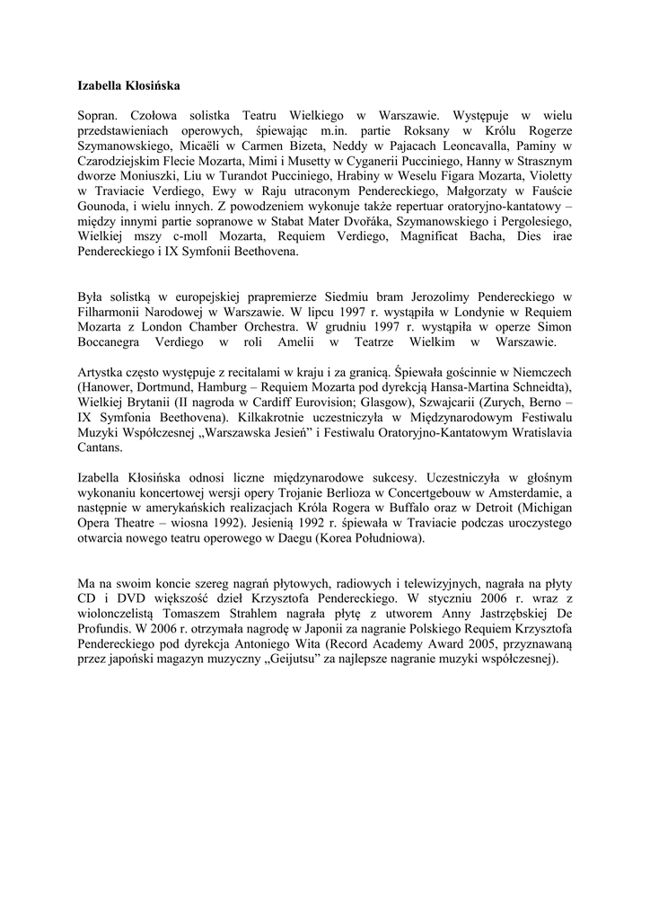 Izabella Kłosińska Sopran. Czołowa solistka Teatru Wielkiego w Warszawie. Występuje w wielu przedstawieniach operowych, śpiewając m.in. partie Roksany w Królu Rogerze Szymanowskiego, Micaëli w Carmen Bizeta, Neddy w Pajacach Leoncavalla, Paminy w Czarodziejskim Flecie Mozarta, Mimi i Musetty w Cyganerii Pucciniego, Hanny w Strasznym dworze Moniuszki, Liu w Turandot Pucciniego, Hrabiny w Weselu Figara Mozarta, Violetty w Traviacie Verdiego, Ewy w Raju utraconym Pendereckiego, Małgorzaty w Fauście Gounoda, i wielu innych. Z powodzeniem wykonuje także repertuar oratoryjno-kantatowy – między innymi partie sopranowe w Stabat Mater Dvořáka, Szymanowskiego i Pergolesiego, Wielkiej mszy c-moll Mozarta, Requiem Verdiego, Magnificat Bacha, Dies irae Pendereckiego i IX Symfonii Beethovena. Była solistką w europejskiej prapremierze Siedmiu bram Jerozolimy Pendereckiego w Filharmonii Narodowej w Warszawie. W lipcu 1997 r. wystąpiła w Londynie w Requiem Mozarta z London Chamber Orchestra. W grudniu 1997 r. wystąpiła w operze Simon Boccanegra Verdiego w roli Amelii w Teatrze Wielkim w Warszawie. Artystka często występuje z recitalami w kraju i za granicą. Śpiewała gościnnie w Niemczech (Hanower, Dortmund, Hamburg – Requiem Mozarta pod dyrekcją Hansa-Martina Schneidta), Wielkiej Brytanii (II nagroda w Cardiff Eurovision; Glasgow), Szwajcarii (Zurych, Berno – IX Symfonia Beethovena). Kilkakrotnie uczestniczyła w Międzynarodowym Festiwalu Muzyki Współczesnej „Warszawska Jesień” i Festiwalu Oratoryjno-Kantatowym Wratislavia Cantans. Izabella Kłosińska odnosi liczne międzynarodowe sukcesy. Uczestniczyła w głośnym wykonaniu koncertowej wersji opery Trojanie Berlioza w Concertgebouw w Amsterdamie, a następnie w amerykańskich realizacjach Króla Rogera w Buffalo oraz w Detroit (Michigan Opera Theatre – wiosna 1992). Jesienią 1992 r. śpiewała w Traviacie podczas uroczystego otwarcia nowego teatru operowego w Daegu (Korea Południowa). Ma na swoim koncie szereg nagrań płytowych, radiowych i telewizyjnych, nagrała na płyty CD i DVD większość dzieł Krzysztofa Pendereckiego. W styczniu 2006 r. wraz z wiolonczelistą Tomaszem Strahlem nagrała płytę z utworem Anny Jastrzębskiej De Profundis. W 2006 r. otrzymała nagrodę w Japonii za nagranie Polskiego Requiem Krzysztofa Pendereckiego pod dyrekcja Antoniego Wita (Record Academy Award 2005, przyznawaną przez japoński magazyn muzyczny „Geijutsu” za najlepsze nagranie muzyki współczesnej).