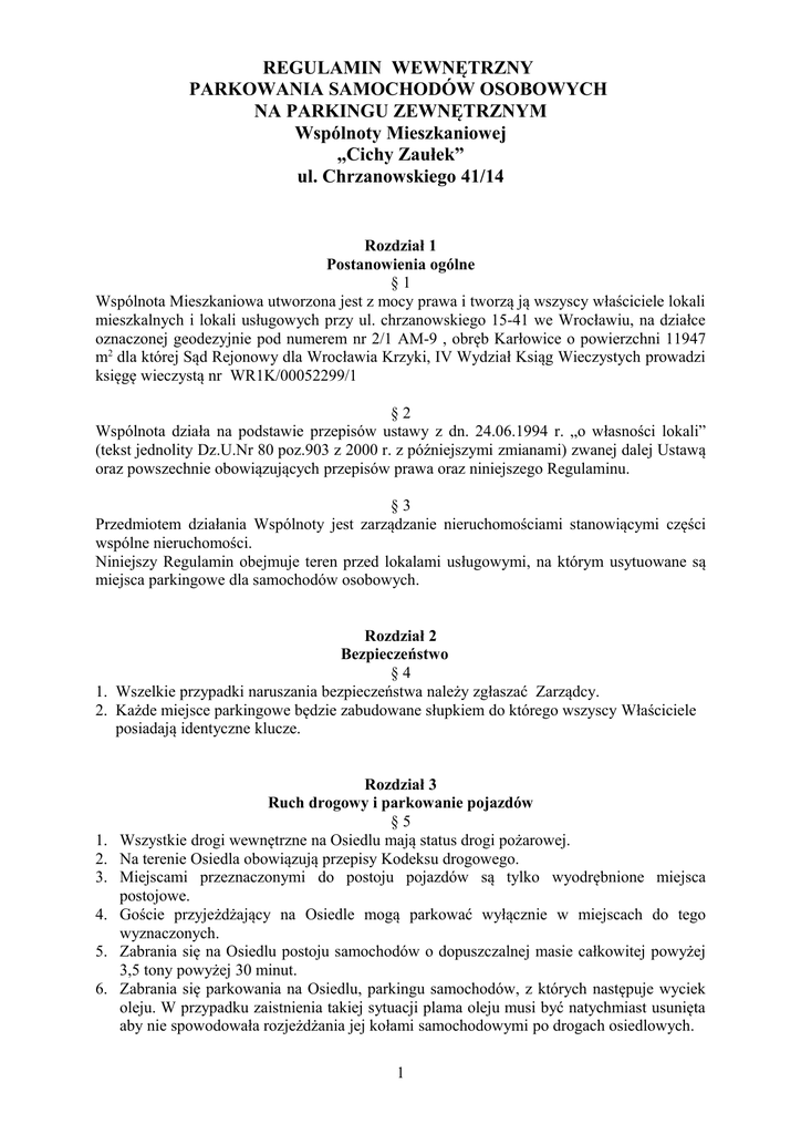 REGULAMIN WEWNĘTRZNY PARKOWANIA SAMOCHODÓW OSOBOWYCH NA PARKINGU ZEWNĘTRZNYM Wspólnoty Mieszkaniowej „Cichy Zaułek” ul. Chrzanowskiego 41/14 Rozdział 1 Postanowienia ogólne §1 Wspólnota Mieszkaniowa utworzona jest z mocy prawa i tworzą ją wszyscy właściciele lokali mieszkalnych i lokali usługowych przy ul. chrzanowskiego 15-41 we Wrocławiu, na działce oznaczonej geodezyjnie pod numerem nr 2/1 AM-9 , obręb Karłowice o powierzchni 11947 m2 dla której Sąd Rejonowy dla Wrocławia Krzyki, IV Wydział Ksiąg Wieczystych prowadzi księgę wieczystą nr WR1K/00052299/1 §2 Wspólnota działa na podstawie przepisów ustawy z dn. 24.06.1994 r. „o własności lokali” (tekst jednolity Dz.U.Nr 80 poz.903 z 2000 r. z późniejszymi zmianami) zwanej dalej Ustawą oraz powszechnie obowiązujących przepisów prawa oraz niniejszego Regulaminu. §3 Przedmiotem działania Wspólnoty jest zarządzanie nieruchomościami stanowiącymi części wspólne nieruchomości. Niniejszy Regulamin obejmuje teren przed lokalami usługowymi, na którym usytuowane są miejsca parkingowe dla samochodów osobowych. Rozdział 2 Bezpieczeństwo §4 1. Wszelkie przypadki naruszania bezpieczeństwa należy zgłaszać Zarządcy. 2. Każde miejsce parkingowe będzie zabudowane słupkiem do którego wszyscy Właściciele posiadają identyczne klucze. 1. 2. 3. 4. 5. 6. Rozdział 3 Ruch drogowy i parkowanie pojazdów §5 Wszystkie drogi wewnętrzne na Osiedlu mają status drogi pożarowej. Na terenie Osiedla obowiązują przepisy Kodeksu drogowego. Miejscami przeznaczonymi do postoju pojazdów są tylko wyodrębnione miejsca postojowe. Goście przyjeżdżający na Osiedle mogą parkować wyłącznie w miejscach do tego wyznaczonych. Zabrania się na Osiedlu postoju samochodów o dopuszczalnej masie całkowitej powyżej 3,5 tony powyżej 30 minut. Zabrania się parkowania na Osiedlu, parkingu samochodów, z których następuje wyciek oleju. W przypadku zaistnienia takiej sytuacji plama oleju musi być natychmiast usunięta aby nie spowodowała rozjeżdżania jej kołami samochodowymi po drogach osiedlowych. 1 7. Postój wszelkich pojazdów na miejscach parkingowych niezgodny z niniejszym Regulaminem skutkuje usunięciem pojazdu na koszt i ryzyko jego właściciela. 8. W przypadku pozostawienia pojazdu na terenie Osiedla, miejsc parkingowych niezgodnie z postanowieniami niniejszego Regulaminu, co spowodowałoby utrudnienia w prowadzeniu akcji ratunkowej, właściciel pojazdu może zostać obciążony kosztami powstałymi w wyniku utrudnienia akcji ratunkowej, niezależnie od innych skutków prawnych. 9. Za niezgodne z niniejszym Regulaminem uważa się w szczególności: pozostawianie wszelkich pojazdów na terenach zielonych, chodnikach, na drogach dojazdowych i wyjazdach oraz we wszystkich innych miejscach nie przeznaczonych do parkowania. Rozdział 4 Porządek na miejscach postojowych §6 Wszyscy Właściciele i Najemcy (domownicy) obowiązani są przestrzegać poniższego porządku : 1. Obowiązkiem każdego Właściciela i Najemcy jest przejawiać troskę o wspólne dobro. W tym celu współpracuje on z Zarządem Wspólnoty, a zwłaszcza niezwłocznie powiadamia Zarządcę nieruchomości o wszystkich zauważonych uszkodzeniach lub niewłaściwym parkowaniu. 2. Właściciel jest zobowiązany do naprawienia szkód powstałych z jego winy, a powstałych na terenie przeznaczonym do parkowania. 3. Utrudnianie lub uniemożliwianie wypełniania obowiązków zawodowych osobom działającym w imieniu lub na życzenie Zarządcy jest zabronione. 4. Zabrania się pisać i malować chodników i dróg osiedlowych, 5. Należy dbać o czystość, estetyczny wygląd i zachowanie porządku na miejscach parkingowych. Zabrania się wykorzystywania ich jako magazynów i składowisk. 6. W godzinach od 2200 do 600 obowiązuje cisza nocna, a w dni świąteczne od godziny 2200 do 800. W godzinach tych należy zachowywać się cicho (nie pozostawiać włączonego silnika samochodowego, wyciszać odbiorniki radiowe, nie krzyczeć i hałasować). 7. Zabrania się na miejscu postojowym prowadzenia prac związanych z remontem kapitalnym samochodów (za wyjątkowym drobnych napraw). 8. Zabrania się spożywania na terenie miejsc postojowych napojów alkoholowych. 9. Zabrania się gry w piłkę na terenie parkowania samochodów. 10. Ustawienie pojazdu na terenie miejsc parkingowych niezgodnie z przepisami Kodeksu Drogowego jest zabronione, a w szczególności w sposób utrudniający dojazd pojazdom uprzywilejowanym lub pieszym. 1. 2. 3. 4. Rozdział 5 Postanowienia końcowe §7 Niniejszy Regulamin został przyjęty uchwałą nr 11/2010 Zmiana Regulaminu może nastąpić jedynie w drodze uchwały podjętej przez Właścicieli. Sprawy sporne rozstrzyga Zarząd Wspólnoty Mieszkaniowej. W związku z uregulowaniem sposobu parkowania na miejscach do tego przeznaczonych wprowadza się zakaz parkowania pojazdów samochodowych na chodnikach. 2