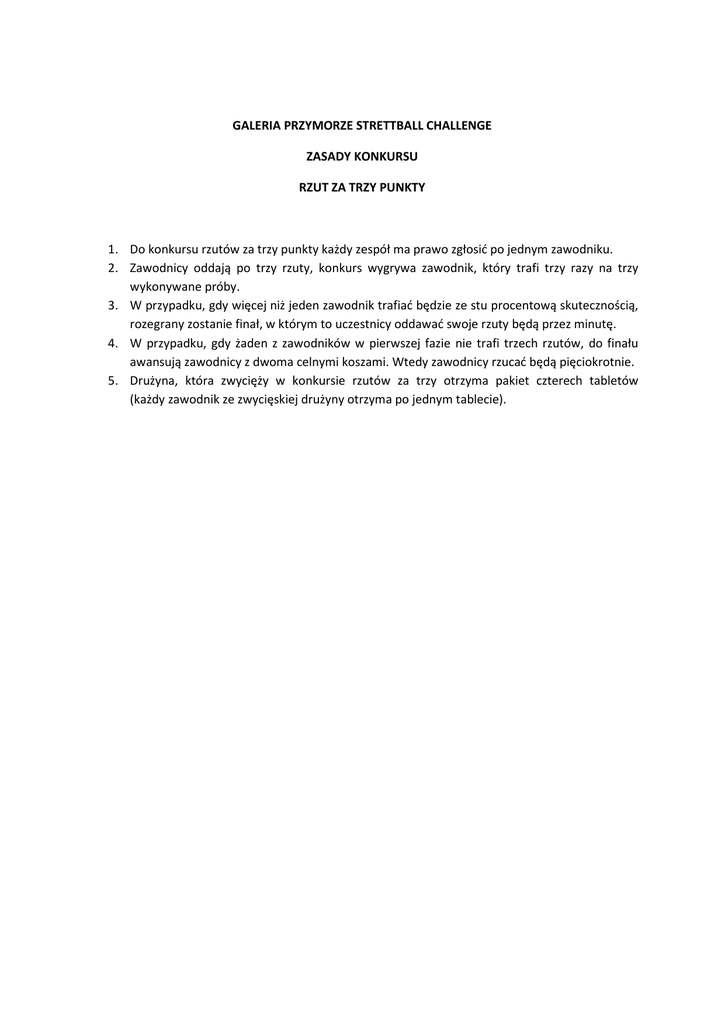 GALERIA PRZYMORZE STRETTBALL CHALLENGE ZASADY KONKURSU RZUT ZA TRZY PUNKTY 1. Do konkursu rzutów za trzy punkty każdy zespół ma prawo zgłosić po jednym zawodniku. 2. Zawodnicy oddają po trzy rzuty, konkurs wygrywa zawodnik, który trafi trzy razy na trzy wykonywane próby. 3. W przypadku, gdy więcej niż jeden zawodnik trafiać będzie ze stu procentową skutecznością, rozegrany zostanie finał, w którym to uczestnicy oddawać swoje rzuty będą przez minutę. 4. W przypadku, gdy żaden z zawodników w pierwszej fazie nie trafi trzech rzutów, do finału awansują zawodnicy z dwoma celnymi koszami. Wtedy zawodnicy rzucać będą pięciokrotnie. 5. Drużyna, która zwycięży w konkursie rzutów za trzy otrzyma pakiet czterech tabletów (każdy zawodnik ze zwycięskiej drużyny otrzyma po jednym tablecie).