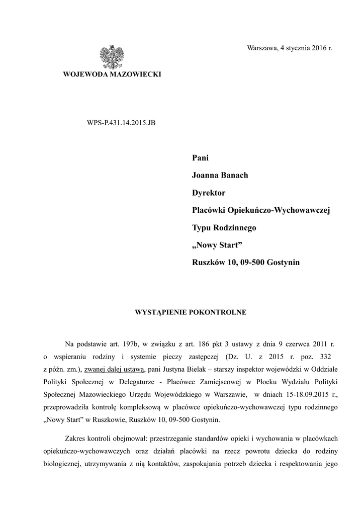 Warszawa, 4 stycznia 2016 r. WOJEWODA MAZOWIECKI WPS-P.431.14.2015.JB Pani Joanna Banach Dyrektor Placówki Opiekuńczo-Wychowawczej Typu Rodzinnego „Nowy Start” Ruszków 10, 09-500 Gostynin WYSTĄPIENIE POKONTROLNE Na podstawie art. 197b, w związku z art. 186 pkt 3 ustawy z dnia 9 czerwca 2011 r. o wspieraniu rodziny i systemie pieczy zastępczej (Dz. U. z 2015 r. poz. 332 z późn. zm.), zwanej dalej ustawą, pani Justyna Bielak – starszy inspektor wojewódzki w Oddziale Polityki Społecznej w Delegaturze - Placówce Zamiejscowej w Płocku Wydziału Polityki Społecznej Mazowieckiego Urzędu Wojewódzkiego w Warszawie, w dniach 15-18.09.2015 r., przeprowadziła kontrolę kompleksową w placówce opiekuńczo-wychowawczej typu rodzinnego „Nowy Start” w Ruszkowie, Ruszków 10, 09-500 Gostynin. Zakres kontroli obejmował: przestrzeganie standardów opieki i wychowania w placówkach opiekuńczo-wychowawczych oraz działań placówki na rzecz powrotu dziecka do rodziny biologicznej, utrzymywania z nią kontaktów, zaspokajania potrzeb dziecka i respektowania jego praw, przestrzegania przepisów określających zasady działania placówki opiekuńczo- wychowawczej jak również zgodności zatrudnienia pracowników z kwalifikacjami określonymi w ustawie z dnia 9 czerwca 2011 r. o wspieraniu rodziny i systemie pieczy zastępczej, w okresie od 1 stycznia 2014 r. do dnia kontroli. Na podstawie art. 197d ww. ustawy oraz na podstawie rozporządzenia Ministra Pracy i Polityki Społecznej z dnia 21 sierpnia 2015 r. w sprawie przeprowadzania kontroli przez wojewodę oraz wzoru legitymacji uprawniającej do przeprowadzania kontroli (Dz. U. z 2015 r. poz. 1477) przekazuję Pani niniejsze wystąpienie pokontrolne. Placówka opiekuńczo-wychowawcza typu rodzinnego „Nowy Start” jest niepubliczną całodobową placówką opiekuńczo-wychowawczą, prowadzoną na zlecenie powiatu nowodworskiego przez Europejską Fundację Na Rzecz Osób Potrzebujących z siedzibą w Gorzowie Wielkopolskim. Jednostka działa na podstawie decyzji wojewody mazowieckiego nr 44/2009 z 26 października 2009 r. i widnieje w Rejestrze placówek opiekuńczo-wychowawczych województwa mazowieckiego pod pozycją 160. „Nowy Start” funkcjonuje na podstawie statutu i regulaminu organizacyjnego zatwierdzonego uchwałą nr 3/2011 z dnia 03.12.2011 r. Zarządu Europejskiej Fundacji Na Rzecz Osób Potrzebujących. Na podstawie porozumień z 01.09.2013 r. i 31.12.2014 r. zawartych pomiędzy powiatem nowodworskim a powiatem gostynińskim za wykonywanie zadań przez placówkę oraz całość działań związanych z organizacją i finansowaniem jednostki odpowiadał powiat nowodworski. W okresie od 1 stycznia 2014 r. do 15 marca 2015 r. p.o. dyrektora placówki był Pan Maciej Banach, który od 16 marca 2015 r. został wolontariuszem w placówce. Od 16 marca 2015 r. Pani kieruje placówką. Placówka przeznaczona jest dla 8 wychowanków w wieku od 7 do 18 lat, z wyjątkiem wychowanków kontynuujących naukę do chwili jej ukończenia i usamodzielnienia się. Według stanu na 14 września 2015 r. w placówce umieszczonych było 6 wychowanków w wieku 10-20 lat, przy czym jedno z dzieci od 11 września 2015 r. przebywało na oddziale XXXXXXX Szpitala XXXXXXXX w Warszawie. Jeden wychowanek posiadał uregulowaną sytuację prawną, w przypadku pozostałych dzieci rodzice mieli ograniczoną władzę rodzicielską. Na podstawie dokonanych w toku kontroli ustaleń wojewoda mazowiecki pozytywnie ocenił działalność placówki w zakresie zachowania standardu świadczonych usług. Placówka zapewniała dzieciom 4 posiłki dziennie: śniadanie, obiad, podwieczorek i kolację oraz dostęp przez całą dobę do podstawowych produktów żywnościowych. Drugie śniadania dzieci 2 zabierały do szkoły. Dwoje wychowanków przebywających w internatach miało opłacone wyżywienie na terenie internatu. Dzieci miały zapewniony dostęp do podstawowej i specjalistycznej opieki zdrowotnej, zaopatrzenie w produkty lecznicze, odzież, obuwie, bieliznę i środki higieny osobistej, zabawki oraz inne przedmioty osobistego użytku stosownie do wieku i indywidualnych potrzeb. Wszystkie dzieci uczęszczały do szkół. Sposób nauki dostosowany był do indywidualnych możliwości dzieci. Dyrektor zaopatrywał wychowanków w podręczniki i przybory szkolne. Wychowawcy placówki oraz korepetytor zatrudniony na umowę zlecenie udzielali dzieciom pomocy w nauce w razie potrzeby. Wychowankowie uczestniczyli w zajęciach specjalistycznych i wyrównawczych, należeli do kół zainteresowań, brali udział w konkursach plastycznych, ekologicznych, muzycznych. Dyrektor i wychowawcy zapewniali dzieciom udział w różnego rodzaju imprezach kulturalno-sportowych takich jak wyjazdy do teatru, do kina, do muzeum, na lodowisko, do Aquaparku, na warsztaty plastyczne. Placówka pokrywała opłaty za pobyt dwójki wychowanków w internatach, zapewniała transport dzieci do szkół oraz w razie potrzeby do domów rodzinnych. Dzieci dysponowały własnymi środkami finansowymi w postaci kieszonkowego, które wypłacane było raz w miesiącu. Wychowankowie placówki zamieszkiwali w 4 pokojach jednoosobowych i 2 pokojach dwuosobowych. Pomieszczenia były właściwie oświetlone, o powierzchni i wyposażeniu zapewniającym miejsce do przechowywania rzeczy osobistych oraz do spania i do nauki. Do dyspozycji dzieci były dwie łazienki: łazienka dla chłopców, łazienka dla dziewcząt. Wychowankowie mogli również korzystać z łazienki dla personelu. W placówce znajdowały się dwa duże hole: dolny, wyposażony w sprzęt sportowy i górny, będący strefą wypoczynkową oraz jadalnia z aneksem kuchennym, stanowiące wspólną przestrzeń mieszkalną. Opiekę w godzinach wieczornych i nocnych zapewniał dyrektor placówki obchodząc pokoje dzieci. Wojewoda pozytywnie z nieprawidłowościami ocenił działalność jednostki w zakresie sposobu organizacji i dokumentowania 