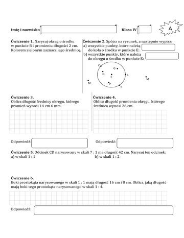 Imię i nazwisko A Klasa IV Ćwiczenie 1. Narysuj okrąg o środku Ćwiczenie 2. Spójrz na rysunek, a następnie wypisz: w punkcie B i promieniu długości 2 cm. a) wszystkie punkty, które należą Kolorem zielonym zaznacz jego średnicę. do koła o środku w punkcie E: b) wszystkie punkty, które należą do okręgu o środku w punkcie E: C G O L E M M P T Ćwiczenie 3. Oblicz długość średnicy okręgu, którego promień wynosi 14 cm 6 mm. Odpowiedź: Ćwiczenie 4. Oblicz długość promienia okręgu, którego średnica wynosi 26 cm. Odpowiedź: Ćwiczenie 5. Odcinek CD narysowany w skali 7 : 1 ma długość 42 cm. Narysuj ten odcinek: a) w skali 1 : 1 b) w skali 1 : 2 Ćwiczenie 6. Boki prostokąta narysowanego w skali 1 : 1 mają długość 16 cm i 8 cm. Oblicz, jaką długość mają boki tego prostokąta narysowanego w skali 1 : 4. Odpowiedź: Imię i nazwisko B Klasa IV Ćwiczenie 1. Narysuj okrąg o środku Ćwiczenie 2. Spójrz na rysunek, a następnie wypisz: w punkcie A i promieniu długości 2 cm. a) wszystkie punkty, które należą Kolorem zielonym zaznacz jego średnicę. do koła o środku w punkcie D: b) wszystkie punkty, które należą do okręgu o środku w punkcie D: N B A R K D H Z F Ćwiczenie 3. Oblicz długość promienia okręgu, którego średnica wynosi 28 cm. Odpowiedź: Ćwiczenie 4. Oblicz długość średnicy okręgu, którego promień wynosi 12 cm 8 mm. Odpowiedź: Ćwiczenie 5. Odcinek AB narysowany w skali 5 : 1 ma długość 40 cm. Narysuj ten odcinek: a) w skali 1 : 1 b) w skali 1 : 2 Ćwiczenie 6. Boki prostokąta narysowanego w skali 1 : 1 mają długość 12 cm i 9 cm. Oblicz, jaką długość mają boki tego prostokąta narysowanego w skali 1 : 3. Odpowiedź: