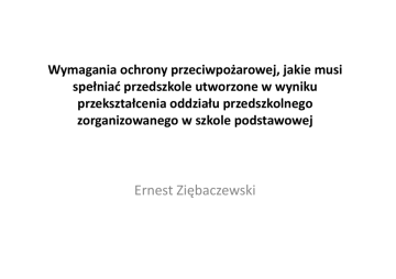 Wymagania ochrony przeciwpożarowej, jakie musi spełniać przedszkole utworzone w wyniku przekształcenia oddziału przedszkolnego zorganizowanego w szkole podstawowej Ernest Ziębaczewski Geneza nowych wymagań „szczególnych” Art. 5 ustawy z dnia 13 czerwca 2013 r. o zmianie ustawy o systemie oświaty oraz niektórych innych ustaw (Dz. U. poz. 827 oraz z 2014 r. poz. 7 i 811) „Z dniem 1 września 2016 r. oddział przedszkolny lub oddziały przedszkolne w szkole podstawowej stają się przedszkolem.” „Lokal, w którym będzie prowadzone nowoutworzone przedszkole, znajdujący się w użytkowanym budynku istniejącym lub jego części, powinien spełniać wymagania ochrony przeciwpożarowej zapewniające bezpieczne warunki realizacji przez przedszkole zadań dydaktycznych, wychowawczych i opiekuńczych oraz pobytu dzieci i innych osób przebywających na terenie przedszkola, określone w przepisach rozporządzenia ministra właściwego do spraw oświaty i wychowania, wydanego na podstawie ustawy.” Art. 5 ustawy z dnia 13 czerwca 2013 r. o zmianie ustawy o systemie oświaty oraz niektórych innych ustaw Rozporządzanie ma określać wymagania ochrony przeciwpożarowej, jakie musi spełniać lokal, uwzględniając konieczność zapewnienia odpowiedniej jakości edukacji, wychowania i opieki nad dziećmi. Organ prowadzący przedszkole znajdujące się w lokalu jest obowiązany uzyskać pozytywną opinię właściwego komendanta powiatowego (miejskiego) Państwowej Straży Pożarnej potwierdzającą spełnianie wymagań, o których mowa w przepisach rozporządzenia. Odmowa wydania pozytywnej opinii przez KP(M) PSP następuje w drodze postanowienia, na które służy zażalenie. Akt wykonawczy Rozporządzenie Ministra Edukacji Narodowej z dnia 31 grudnia 2014 r. w sprawie wymagań ochrony przeciwpożarowej, jakie musi spełniać lokal, w którym jest prowadzone przedszkole utworzone w wyniku przekształcenia oddziału przedszkolnego lub oddziałów przedszkolnych zorganizowanych w szkole podstawowej (Dz. U. poz. 20) Uwaga – rozporządzenie dotyczy wyłącznie przedszkoli utworzonych zgodnie z art. 5 ust. 1 pkt 1 ustawy z dnia 13 czerwca 2013 r. o zmianie ustawy o systemie oświaty oraz niektórych innych ustaw! Możliwości spełnienia wymagań ochrony przeciwpożarowej spełnienie wymagań określonych w przepisach techniczno-budowlanych oraz przepisach dotyczących ochrony przeciwpożarowej dla kategorii zagrożenia ludzi ZL II spełnienie wymagań „specjalnych” określonych w rozporządzeniu MEN, dla ściśle określonych przypadków, w których jest to dopuszczalne (przepisy w formie dopuszczenia) spełnienie wymagań uzgodnionych z właściwym miejscowo komendantem wojewódzkim Państwowej Straży Pożarnej, w trybie określonym w przepisach Wymagania „szczególne” rozporządzenia MEN Wymagania zależne od ilości oddziałów przedszkolnych: jeden oddział przedszkolny - wymagania ochrony przeciwpożarowej określone w § 3, więcej niż jeden oddział przedszkolny - wymagania ochrony przeciwpożarowej określone w § 4. Przedszkola „jednooddziałowe” – wymagania „szczególne” rozporządzenia (§ 3) lokal powinien być przeznaczony dla nie więcej niż 25 dzieci; lokal powinien znajdować się na pierwszej kondygnacji nadziemnej budynku i stanowić zwarty zespół przylegających do siebie i powiązanych funkcjonalnie pomieszczeń, przeznaczonych do celów prowadzenia przedszkola; lokal powinien znajdować się w strefie pożarowej wykonanej z elementów nierozprzestrzeniających ognia; lokal powinien posiadać co najmniej dwa wyjścia na zewnątrz, przy czym jednym z nich powinny być drzwi wyjściowe z lokalu, a drugim inne drzwi lub okno umożliwiające ewakuację dzieci w sposób bezpieczny bezpośrednio na przestrzeń otwartą; lokal powinien być wyposażony w gaśnice zgodnie z wymaganiami określonymi w przepisach dotyczących ochrony przeciwpożarowej budynków, innych obiektów budowlanych i terenów, niezależnie od gaśnic zastosowanych w strefie pożarowej, w której znajduje się lokal; do wyposażenia lokalu należy stosować gaśnice o skuteczności gaśniczej co najmniej 21A; Przedszkola „jednooddziałowe” – wymagania „szczególne” rozporządzenia (§ 3) stałe elementy wyposażenia i wystroju wnętrz lokalu oraz znajdujące się w nim wykładziny podłogowe powinny być co najmniej trudno zapalne; w strefie pożarowej, w której znajduje się lokal, nie powinny występować inne lokale, w których są prowadzone przedszkola, inne formy wychowania przedszkolnego, ani lokale, w których jest sprawowana opieka nad dziećmi do lat 3 zgodnie z przepisami ustawy z dnia 4 lutego 2011 r. o opiece nad dziećmi w wieku do lat 3 (Dz. U. z 2013 r. poz. 1457); w lokalu i na drogach ewakuacyjnych prowadzących z lokalu na zewnątrz budynku nie powinny występować warunki techniczne będące podstawą do uznania budynku za zagrażający życiu ludzi, w odniesieniu do wymagań określonych dla kategorii zagrożenia ludzi ZL III, oraz powinny być spełnione wymagania określone w przepisach dotyczących ochrony przeciwpożarowej budynków, innych obiektów budowlanych i terenów, odnoszące się do tej kategorii. Przedszkola „wielooddziałowe” – wymagania „szczególne” rozporządzenia (§ 4) przedszkole „wielooddziałowe”, przeznaczone dla więcej niż 25 dzieci, powinno spełniać wymagania stawiane dla przedszkola „jednooddziałowego” (z uwzględnieniem wymagań wyszczególnionych poniżej); lokal powinien być oddzielony od pozostałej części budynku ścianami wewnętrznymi o klasie odporności ogniowej co najmniej EI 30, w których otwory będą miały zamknięcia o klasie odporności ogniowej co najmniej EI 30 i będą wyposażone w urządzenia zapewniające samoczynne zamykanie otworu w razie pożaru; pomieszczenia lokalu, w których mogą przebywać dzieci, z wyjątkiem pomieszczeń pomocniczych, o których mowa w pr