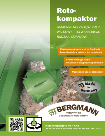 Rotokompaktor KOMPAKTOWY ZAGĘSZCZACZ WALCOWY – DO WSZELKIEGO RODZAJU ODPADÓW Zagęszcza surowce wtórne & odpady bezpośrednio w miejscu ich powstania Prosta obsługa dzięki możliwości ciągłego napełniania Oszczędza czas i pieniądze Maszyny do gospodarki odpadami Rotokompaktory PS / APS PS 800 PS 1000-E PS 1400-E PS 8100 APS 800 APS 1100-E Nasza strategia dla Jasny cel: Przechwycić, rozerwać, zagęścić. Rotokompaktory BERGMANN – z nami gospodarka odpadami to drobiazg. Nie poświęcaj na odpady więcej czasu niż to konieczne, nie marnuj przestrzeni magazynowej, odpowiednio rozdysponuj zajęcia pracowników. Rotokompaktor –wynalazek firmy BERGMANNzajmuje bardzo mało miejsca, może być napełniany w trybie ciągłym, a jego obsługa jest dziecinnie prosta. Nasi inżynierowie już od 30 lat podnoszą poprzeczkę w zakresie innowacji, żywotności, niezawodności, jakości i serwisu. ekonomicznej gospodarki odpadami Ekstremalne zagęszczenie oszczędza czas i pieniądze! Specjalny walec obrotowy rozrywa odpady i utrzymuje je pod ciągłym naciskiem, co znacznie zwiększa stopień zagęszczenia. W rezultacie można zaoszczędzić 5 z 6 wywozów odpadów. Czyste miejsce pracy zamiast dużych śmietników i kontenerów Ile miejsca zajmuje 250kg niezagęszczonego kartonu? Ile kosztuje jego magazynowanie i wywóz? Zakup Rotokompaktora BERGMANN zwróci się w krótkim czasie. Zagęszczony materiał na m³ Materiał Waga / m³ A Kartony ok. 250 kg B Folie ok. 140 kg C Styropian ok. 60 kg D Odpady komunalne ok. 300 -700 kg kg Stopień zagęszczenia nawet Bergmann PS 1000-E zajmuje jedynie ok. 1,20 m x 1,60 m. (Przedstawiona maszyna wyposażona jest w zasyp – wyposażenie opcjonalne) Zastosowanie Wszędzie tam, gdzie powstają luźne odpady, jak np.: • Supermarkety • Gastronomia • Przemysł wszelkiego rodzaju • Banki • Szpitale • Domy opieki • Handel • Hotele • Firmy świadczące usługi wszelkiego rodzaju • i wiele innych 10 : 1 ! Zasada działania: Specjalny walec obracający się w obu kierunkach 10m3 1m3 Korzyści 2 3 Konsekwentne Cichy i bardzo żywotny napęd Zagęszczanie do worka plastikowego BERGMANN ROTOKOMPAKTOR bo zagęszczanie jest opłacalne Przykładowe zastosowanie Rotokompaktora PS 1400-E: Odpady są zagęszczane do worka plastikowego o poj. 1400 litrów. Walec obrotowy napełnia worek warstwa po warstwie. zagęszczanie odpadów poprodukcyjnych! Tym sposobem uzyskujemy z 10m³ kartonów poręczną paczkę o wielkości ok. 1,4m³ i wadze ok. 400kg! Ze względu na specyficzny sposób działania Rotokompaktory firmy BERGMANN mogą być napełniane w trybie ciągłym, bez oczekiwania na cykl prasowania i bez straty czasu na wiązanie belek. Wrzucamy i zapominamy; dokładnie tak jak do śmietnika! PS 800: 0,8 m3. (hydraulicznie) PS 1000 - E: (elektrycznie) 1,0 m3. PS 8100: 1,0 m3. (hydraulicznie) Rokompaktor PS 1400-E zagęści 10m³ kartonów w poręczną paczkę, dzięki czemu zaoszczędzimy na czasie pracy pracowników i kosztach transportu odpadów! (Przedstawiona maszyna wyposażona jest w zasyp – wyposażenie opcjonalne) PS 1400 - E: (elektrycznie) 1,4 m3. Obsługa Das Für ist Rollcontainer BERGMANN 4 5 Zagęszczanie odpadów mokrych i suchych ???: bezpośrednio do pojemnika / śmietnika! Verschiebeanlage Przestoje? Nie z nami! Rotokompaktory BERGMANN są bardzo wytrzymałe oraz łatwe i tanie w utrzymaniu – co czyni je idealnym rozwiązaniem dla wymagających zadań przy dużym natężeniu pracy. Maszyny te wyposażone są w długowieczny napęd hydrauliczny lub silny napęd elektryczny (patrz na stronie 8 & 9). Najwyższy standard produkcji oraz użytych podzespołów dodatkowo sprawiają, że specjalny walec zagęszczający będzie się kręcił długo i niezawodnie spełniał swoje zadanie! Dla każdego zadania najlepsze indywidualne rozwiązanie! To takie proste, że każdy to potrafi! Praca z Rotokompaktorem BERGMANN jest dziecinnie prosta. Po krótkim przeszkoleniu każdy jest w stanie szybko i bezpiecznie obsłużyć Rotokompaktor. Duży efekt bez wyrzeczeń. Rotokompaktory BERGMANN nie zajmują dużo miejsca. Nie wymagają żadnych prac budowlanych. Wręcz przeciwnie: Zyskuje się dodatkową przestrzeń, która wcześniej była przeznaczona na magazynowanie śmieci, a teraz może być wykorzystana w innych celach. APS 800: 800 l. (hydraulicznie) Obsługa 6 APS 1100-E: (elektrycznie) 1100 l. Made in Germany Wynalazek firmy BERGMANN Bergmann APS 1100-E zajmuje jedynie 2 m² przestrzeni i maksymalnie 2,6 m wysokości. (Przedstawiona maszyna wyposażona jest w zasyp – wyposażenie opcjonalne) Zagęszczone odpady są odbierane i opróżniane przez zwyczajną śmieciarkę – tak samo jak wcześniej. … założenie worka na śmietnik zapobiega jego zanieczyszczeniu, np. przy odpadach medycznych 7 Zagęszczaj odpady bezpośrednio w miejscu ich powstania: Dopasowany Rotokompaktorem firmy BERGMANN system dla każdego PS 800 Rodzaj odpadów PS 1000-E PS 1400-E zastosowania! PS 8100 Kartony, papier, folie, styropian, odpady drewniane, kobiałki, inne odpady lekkie, odpady aluminiowe, puszki, paliwo alternatywne, lekki złom APS 800/600 APS 1100-E Walec standardowy wyposażony w trójkątne kolce dla efektywnego zagęszczenia papieru, kartonów i odpadów komunalnych. Odpady komunalne, medyczne, spożywcze, mieszane, roślinne; kartony Generalnie wszystko co da się zagęścić i co zmieści się w maszynie! Pojemność Worek plastikowy 800 litrów Wymiary paczki: Dł. 950 mm, Sz. 1000 mm Wys. 900 mm Worek plastikowy 1000 litrów Wymiary paczki: Ø 1100 mm Wys. 1100 mm Zastosowanie Handel detaliczny, handel hurtowy, przemysł … Worek plastikowy 1400 litrów Wymiary paczki: Dł. 1100 mm, Sz. 1200 mm Wys. 1100 mm Worek plastikowy 1000 litrów Wymiary paczki: Ø 1100 mm Wys. 1100 mm Śmietnik / pojemnik 600 lub 800 litrowy Śmietnik / pojemnik 1100 lub 1000 litrowy z płaską pokrywą Szpitale, domy opieki, domy seniora, restauracje, h