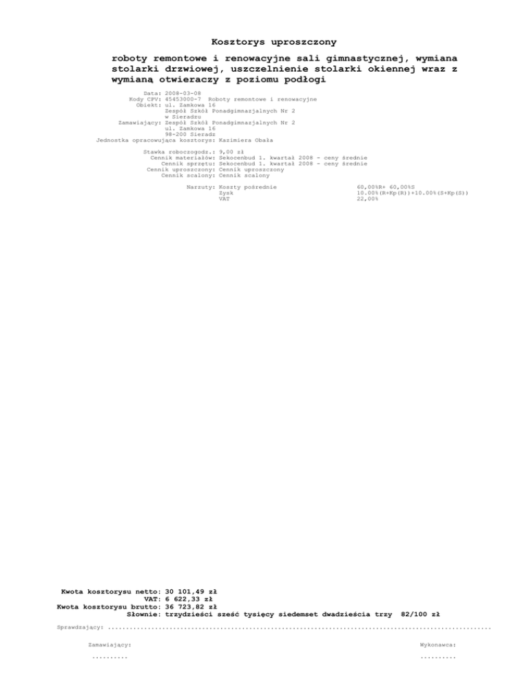 Kosztorys uproszczony roboty remontowe i renowacyjne sali gimnastycznej, wymiana stolarki drzwiowej, uszczelnienie stolarki okiennej wraz z wymianą otwieraczy z poziomu podłogi Data: 2008-03-08 Kody CPV: 45453000-7 Roboty remontowe i renowacyjne Obiekt: ul. Zamkowa 16 Zespół Szkół Ponadgimnazjalnych Nr 2 w Sieradzu Zamawiający: Zespół Szkół Ponadgimnazjalnych Nr 2 ul. Zamkowa 16 98-200 Sieradz Jednostka opracowująca kosztorys: Kazimiera Obała Stawka roboczogodz.: Cennik materiałów: Cennik sprzętu: Cennik uproszczony: Cennik scalony: 9,00 zł Sekocenbud 1. kwartał 2008 - ceny średnie Sekocenbud 1. kwartał 2008 - ceny średnie Cennik uproszczony Cennik scalony Narzuty: Koszty pośrednie Zysk VAT Kwota kosztorysu netto: VAT: Kwota kosztorysu brutto: Słownie: 60,00%R+ 60,00%S 10.00%(R+Kp(R))+10.00%(S+Kp(S)) 22,00% 30 101,49 zł 6 622,33 zł 36 723,82 zł trzydzieści sześć tysięcy siedemset dwadzieścia trzy 82/100 zł Sprawdzający: ..................................................................................................................... Zamawiający: Wykonawca: .......... .......... Roboty rem. i renowacyjne sali gimnastcznej 1a zm. Zuzia (C) DataComp 1994-2007(lic. 10842) strona nr: 2 Tabela elementów scalonych Narzuty: Koszty pośrednie Zysk VAT 60,00%R+ 60,00%S 10.00%(R+Kp(R))+10.00%(S+Kp(S)) 22,00% Nazwa elementu 1 Wartość z narzutami WYMIANA STOLARKI DRZWIOWEJ 30 101,49 Suma elementów kosztorysu 30 101,49 Wartość kosztorysu netto: 30 101,49 VAT 22,00%: 6 622,33 Wartość kosztorysu brutto: 36 723,82 roboty remontowe i renowacyjne sali gimnastycznej, wymiana stolarki drzwiowej, uszczelnienie stolarki okiennej wraz z wymianą otwieraczy z poziomu podłogi Roboty rem. i renowacyjne sali gimnastcznej 1a zm. Zuzia (C) DataComp 1994-2007(lic. 10842) strona nr: 3 Kosztorys uproszczony Element, asortyment, rodzaj robót, pozycja Jedn. Krot. Ilość Wartość jednostkowa Wartość netto przedmiarowa podstawy nakładów 1 Kody CPV: 45421100-5 Instalowanie drzwi i okien i podobnych elementów WYMIANA STOLARKI DRZWIOWEJ 1.1 KNR 401/354/4 Wykucie z muru, ościeżnic drewnianych, powierzchnia do 2·m2 1.2 KNR 401/354/5 Jw. lecz powierzchnia ponad 2·m2 1.3 Analiza - Montaż otwieraczy z poziomu podłogi, dwustronne 1.4 KNNR 7/503/8 Drzwi zewnętrzne aluminiowe, profil z wkładką termiczną, pełne, wyposażone w dwa zamki + klamka + pochwyty + samozamykacz 1.5 KNNR 7/503/8 Drzwi wewnętrzne aluminiowe, półtora skrzydła, pełne (lub z wąskimi paskami) szkła bezpiecznego, niskoemisyjnego U=1,1W/m2K wyposażone w zamek i klamki 1.6 KNR 401/702/5 Skucie tynków ościeży szerokość do 20-cm, zaprawa cementowo-wapienna 1.7 KNR 202/333/1 Uszczelnianie ościeżnic pianką poliuretanową wraz z oczyszczeniem ościeżnic - analogia 1.8 KNR 23/2612/7 Przyklejenie warstwy siatki z włókna szklanego 1.9 KNR 23/931/1 Nałożenie na podłoże podkładowej masy tynkarskiej 1.10 KNR 23/931/3 (1) Tynk cienkowarstwowy mineralny na ościeżach 1.11 KNR 401/708/3 (1) Tynki ościeży kat. III, zaprawa cementowo-wapienna, szerokość do 40-cm 1.12 KNR 202/1611/6 (1) Rusztowania wewnętrzne rurowe 1.13 KNR 401/108/17 Wywóz samochodami samowyładowczymi do 1·km, gruz ceglany 1.14 KNR 401/108/20 Dodatek za każdy następny 1·km 1.15 Analiza - Demontaż wywietrzaków dachowych 1.16 KNR 217/149/2 Montaż podstawy dachowej o średnicy do 250·mm 1.17 KNR 217/152/3 (1) Wywietrzaki dachowe, o średnicy do 315·mm, cylindryczne szt 1 18,37 18,37 m2 ~6,00 8,24 49,44 kpl 32 398,20 12 742,40 m2 ~2,12 1 302,53 2 761,36 m2 ~6,36 902,27 5 738,44 m ~208,60 3,81 794,77 m 208,60 8,37 1 745,98 m2 31,29 32,47 1 015,99 m2 31,29 3,31 103,57 m2 31,29 39,04 1 221,56 m ~16,60 17,19 285,35 m2 ~175,50 7,73 1 356,62 m3 0,80 87,81 70,25 0,80 3 53,75 58,60 43,00 175,80 szt 3 229,53 688,59 szt 3 430,00 m3 szt 14,0 Podsumowanie elementu Ogółem WYMIANA STOLARKI DRZWIOWEJ Podsumowanie kosztorysu Razem Wartość kosztorysu netto: 1 290,00 Razem 30 101,49 Razem 30 101,49 30 101,49 VAT 22,00% 6 622,33 Wartość kosztorysu brutto: 36 723,82 roboty remontowe i renowacyjne sali gimnastycznej, wymiana stolarki drzwiowej, uszczelnienie stolarki okiennej wraz z wymianą otwieraczy z poziomu podłogi