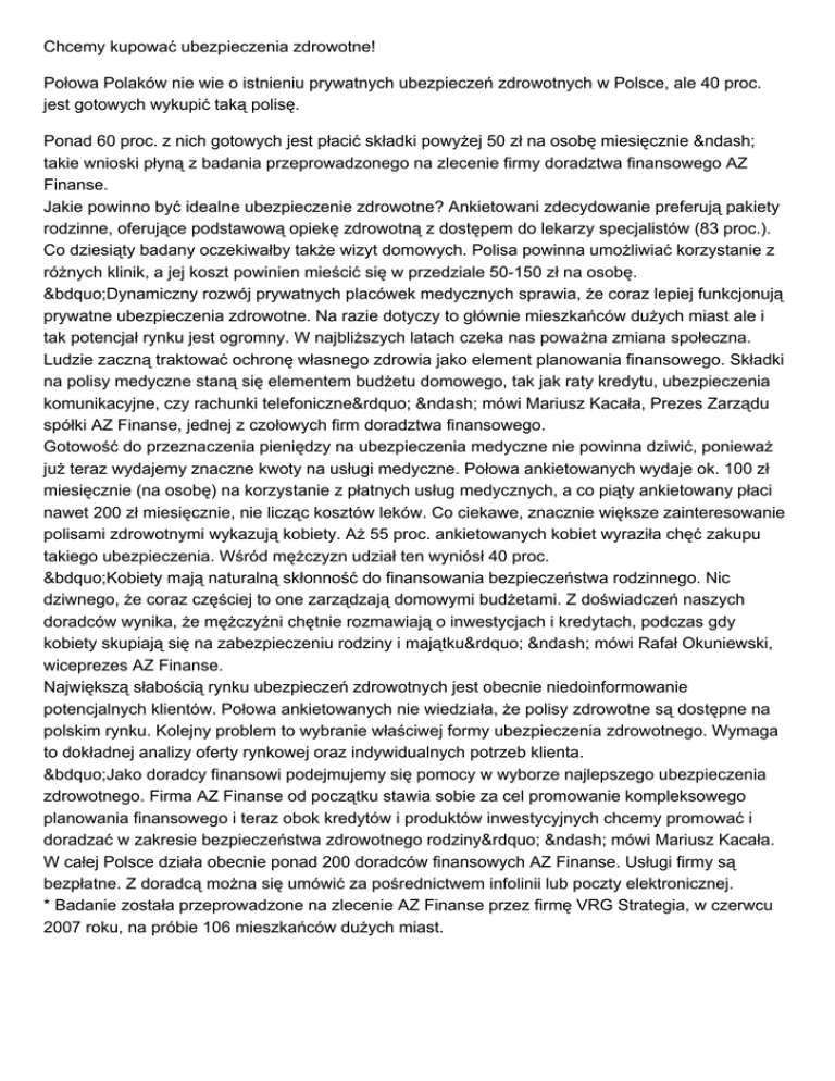 Chcemy kupować ubezpieczenia zdrowotne! Połowa Polaków nie wie o istnieniu prywatnych ubezpieczeń zdrowotnych w Polsce, ale 40 proc. jest gotowych wykupić taką polisę. Ponad 60 proc. z nich gotowych jest płacić składki powyżej 50 zł na osobę miesięcznie – takie wnioski płyną z badania przeprowadzonego na zlecenie firmy doradztwa finansowego AZ Finanse. Jakie powinno być idealne ubezpieczenie zdrowotne? Ankietowani zdecydowanie preferują pakiety rodzinne, oferujące podstawową opiekę zdrowotną z dostępem do lekarzy specjalistów (83 proc.). Co dziesiąty badany oczekiwałby także wizyt domowych. Polisa powinna umożliwiać korzystanie z różnych klinik, a jej koszt powinien mieścić się w przedziale 50-150 zł na osobę. „Dynamiczny rozwój prywatnych placówek medycznych sprawia, że coraz lepiej funkcjonują prywatne ubezpieczenia zdrowotne. Na razie dotyczy to głównie mieszkańców dużych miast ale i tak potencjał rynku jest ogromny. W najbliższych latach czeka nas poważna zmiana społeczna. Ludzie zaczną traktować ochronę własnego zdrowia jako element planowania finansowego. Składki na polisy medyczne staną się elementem budżetu domowego, tak jak raty kredytu, ubezpieczenia komunikacyjne, czy rachunki telefoniczne” – mówi Mariusz Kacała, Prezes Zarządu spółki AZ Finanse, jednej z czołowych firm doradztwa finansowego. Gotowość do przeznaczenia pieniędzy na ubezpieczenia medyczne nie powinna dziwić, ponieważ już teraz wydajemy znaczne kwoty na usługi medyczne. Połowa ankietowanych wydaje ok. 100 zł miesięcznie (na osobę) na korzystanie z płatnych usług medycznych, a co piąty ankietowany płaci nawet 200 zł miesięcznie, nie licząc kosztów leków. Co ciekawe, znacznie większe zainteresowanie polisami zdrowotnymi wykazują kobiety. Aż 55 proc. ankietowanych kobiet wyraziła chęć zakupu takiego ubezpieczenia. Wśród mężczyzn udział ten wyniósł 40 proc. „Kobiety mają naturalną skłonność do finansowania bezpieczeństwa rodzinnego. Nic dziwnego, że coraz częściej to one zarządzają domowymi budżetami. Z doświadczeń naszych doradców wynika, że mężczyźni chętnie rozmawiają o inwestycjach i kredytach, podczas gdy kobiety skupiają się na zabezpieczeniu rodziny i majątku” – mówi Rafał Okuniewski, wiceprezes AZ Finanse. Największą słabością rynku ubezpieczeń zdrowotnych jest obecnie niedoinformowanie potencjalnych klientów. Połowa ankietowanych nie wiedziała, że polisy zdrowotne są dostępne na polskim rynku. Kolejny problem to wybranie właściwej formy ubezpieczenia zdrowotnego. Wymaga to dokładnej analizy oferty rynkowej oraz indywidualnych potrzeb klienta. „Jako doradcy finansowi podejmujemy się pomocy w wyborze najlepszego ubezpieczenia zdrowotnego. Firma AZ Finanse od początku stawia sobie za cel promowanie kompleksowego planowania finansowego i teraz obok kredytów i produktów inwestycyjnych chcemy promować i doradzać w zakresie bezpieczeństwa zdrowotnego rodziny” – mówi Mariusz Kacała. W całej Polsce działa obecnie ponad 200 doradców finansowych AZ Finanse. Usługi firmy są bezpłatne. Z doradcą można się umówić za pośrednictwem infolinii lub poczty elektronicznej. * Badanie została przeprowadzone na zlecenie AZ Finanse przez firmę VRG Strategia, w czerwcu 2007 roku, na próbie 106 mieszkańców dużych miast.