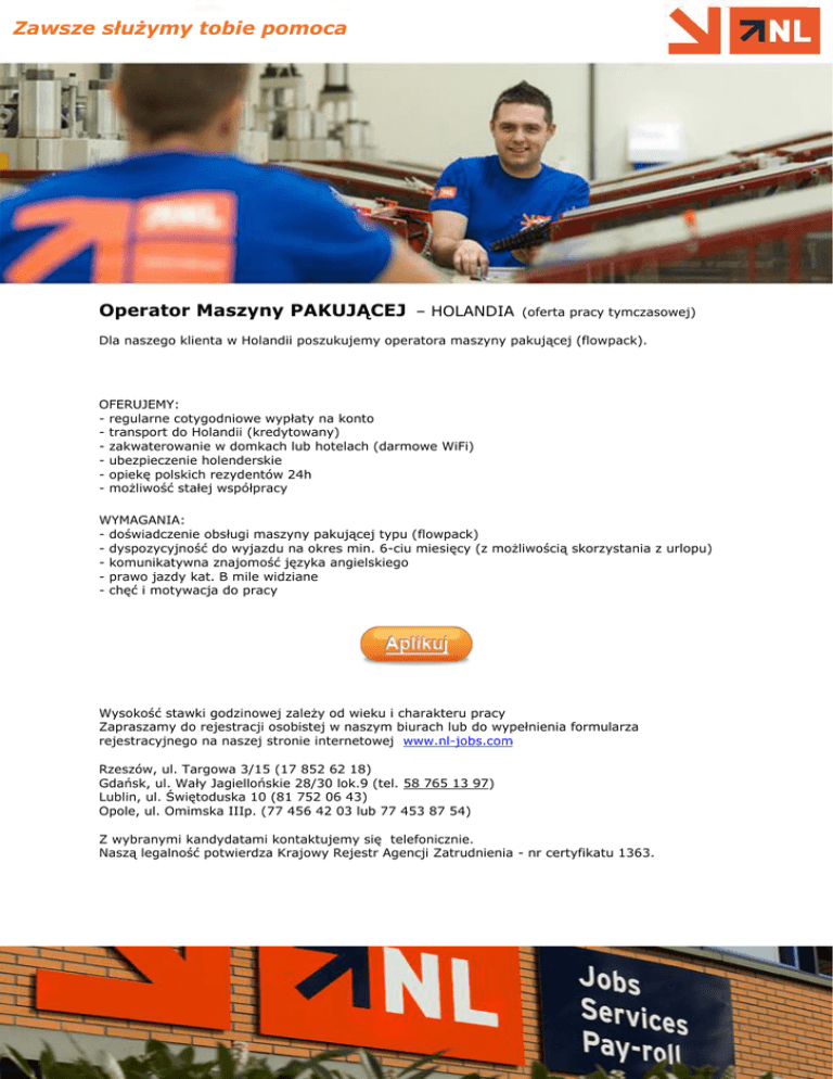 Zawsze służymy tobie pomoca Operator Maszyny PAKUJĄCEJ – HOLANDIA (oferta pracy tymczasowej) Dla naszego klienta w Holandii poszukujemy operatora maszyny pakującej (flowpack). OFERUJEMY: - regularne cotygodniowe wypłaty na konto - transport do Holandii (kredytowany) - zakwaterowanie w domkach lub hotelach (darmowe WiFi) - ubezpieczenie holenderskie - opiekę polskich rezydentów 24h - możliwość stałej współpracy WYMAGANIA: - doświadczenie obsługi maszyny pakującej typu (flowpack) - dyspozycyjność do wyjazdu na okres min. 6-ciu miesięcy (z możliwością skorzystania z urlopu) - komunikatywna znajomość języka angielskiego - prawo jazdy kat. B mile widziane - chęć i motywacja do pracy Wysokość stawki godzinowej zależy od wieku i charakteru pracy Zapraszamy do rejestracji osobistej w naszym biurach lub do wypełnienia formularza rejestracyjnego na naszej stronie internetowej www.nl-jobs.com Rzeszów, ul. Targowa 3/15 (17 852 62 18) Gdańsk, ul. Wały Jagiellońskie 28/30 lok.9 (tel. 58 765 13 97) Lublin, ul. Świętoduska 10 (81 752 06 43) Opole, ul. Omimska IIIp. (77 456 42 03 lub 77 453 87 54) Z wybranymi kandydatami kontaktujemy się telefonicznie. Naszą legalność potwierdza Krajowy Rejestr Agencji Zatrudnienia - nr certyfikatu 1363.