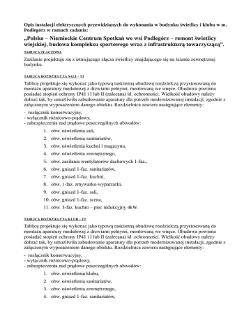 Opis instalacji elektrycznych przewidzianych do wykonania w budynku świetlicy i klubu w m. Podlegórz w ramach zadania: „Polsko – Niemieckie Centrum Spotkań we wsi Podlegórz – remont świetlicy wiejskiej, budowa kompleksu sportowego wraz z infrastrukturą towarzyszącą”. TABLICA ZŁACZOWA Zasilanie projektuje się z istniejącego złącza świetlicy znajdującego się na ścianie zewnętrznej budynku. TABLICA ROZDZIELCZA SALI – T1 Tablicę projektuje się wykonać jako typową naścienną obudowę rozdzielczą przystosowaną do montażu aparatury modułowej z drzwiami pełnymi, montowaną we wnęce. Obudowa powinna posiadać stopień ochrony IP41 i I lub II (zalecana) kl. ochronności. Wielkość obudowy należy dobrać tak, by umożliwiła zabudowanie aparatury dla potrzeb modernizowanej instalacji, zgodnie z załączonym wyposażeniem danego obiektu. Rozdzielnica zawiera następujące elementy: - rozłącznik konserwacyjny, - wyłącznik różnicowo-prądowy, - zabezpieczenia nad prądowe poszczególnych obwodów: 1. obw. oświetlenia sali, 2. obw. oświetlenia sanitariatów, 3. obw. oświetlenia kuchni i magazynu, 4. obw. oświetlenia zewnętrznego, 5. obw. zasilania wentylatorów dachowych 1-faz., 6. obw. gniazd 1-faz. sanitariatów, 7. obw. gniazd 1-faz. kuchni, 8. obw. 1-faz. zmywarko-wyparzarki, 9. obw. gniazd 1-faz. sali, 10. obw. gniazd 1-faz. scena, 11. obw. 3-faz. kuchni – piec indukcyjny 4kW. TABLICA ROZDZIELCZA KLUB – T2 Tablicę projektuje się wykonać jako typową naścienną obudowę rozdzielczą przystosowaną do montażu aparatury modułowej z drzwiami pełnymi, montowaną we wnęce. Obudowa powinna posiadać stopień ochrony IP41 i I lub II (zalecana) kl. ochronności. Wielkość obudowy należy dobrać tak, by umożliwiła zabudowanie aparatury dla potrzeb modernizowanej instalacji, zgodnie z załączonym wyposażeniem danego obiektu. Rozdzielnica zawiera następujące elementy: - rozłącznik konserwacyjny, - wyłącznik różnicowo-prądowy, - zabezpieczenia nad prądowe poszczególnych obwodów: 1. obw. oświetlenia klubu, 2. obw. oświetlenia sanitariatów, 3. obw. oświetlenia zewnętrznego, 4. obw. gniazd 1-faz. sanitariatów, 5. obw. gniazd 1-faz., 6. obw. gniazd 1-faz. - DATA, TABLICA ROZDZIELCZA PODDASZE – T3 Tablicę projektuje się wykonać jako typową naścienną obudowę rozdzielczą przystosowaną do montażu aparatury modułowej z drzwiami pełnymi, montowaną we wnęce. Obudowa powinna posiadać stopień ochrony IP41 i I lub II (zalecana) kl. ochronności. Wielkość obudowy należy dobrać tak, by umożliwiła zabudowanie aparatury dla potrzeb modernizowanej instalacji, zgodnie z załączonym wyposażeniem danego obiektu. Rozdzielnica zawiera następujące elementy: - rozłącznik konserwacyjny, - wyłącznik różnicowo-prądowy, - zabezpieczenia nad prądowe poszczególnych obwodów: 1. obw. oświetlenia korytarza, 2. obw. oświetlenia sanitariatów i aneksu kuchennego, 3. obw. oświetlenia pokoi, 4. obw. gniazd 1-faz. sanitariatów, 5. obw. gniazd 1-faz. aneksu kuchennego, 6. obw. gniazd 1-faz. pokoi. TABLICA ROZDZIELCZA PIWNICY - T4 Tablicę projektuje się wykonać jako typową naścienną obudowę rozdzielczą przystosowaną do montażu aparatury modułowej z drzwiami pełnymi, montowaną we wnęce. Obudowa powinna posiadać stopień ochrony IP41 i I lub II (zalecana) kl. ochronności. Wielkość obudowy należy dobrać tak, by umożliwiła zabudowanie aparatury dla potrzeb modernizowanej instalacji, zgodnie z załączonym wyposażeniem danego obiektu. Rozdzielnica zawiera następujące elementy: - rozłącznik konserwacyjny, - wyłącznik różnicowo-prądowy, - zabezpieczenia nad prądowe poszczególnych obwodów: 1. obw. oświetlenia, 2. obw. gniazd 1-faz. pompy P1, 3. obw. gniazd 1-faz. pompy P2i, 4. obw. gniazd 1-faz. W rozdzielnicach zaprojektowano ochronniki przeciw przepięciowe kl. „B+C". Rozdzielnica montowana będzie tak, ze jej górna krawędź znajdować się będzie max. 2,0 m nad poziomem podłogi. PRZEWODY l SPOSÓB PROWADZENIA INSTALACJI Do wykonania projektowanej instalacji projektuje się się zastosować nast, typy przewodów: YKYżo 5x6mm2 i 5x10mm2 ( dla T1) - dla w.l.z. z tablicy istniejącej do projektowanych tablic rozdzielczych oraz gniazda 3faz. pieca indukcyjnego, YDYżo 3x1,5mm2 w instalacji oświetleniowa, YDYżo 3x2,5mm2 w instalacji gniazd wtyczkowych oraz podgrzewacza wody, LgYżo 4 - lokalne przewody połączeń wyrównawczych w Przy wykonywaniu instalacji należy przestrzegać następujących zasad: - izolacja żył przewodów i kabli powinny odpowiadać kolorom zgodnym z PN, - izolację w kolorze żółto-zielonym można stosować wyłącznie w instalacjach związanych z ochrona od porażeń, - przewody układać wewnątrz konstrukcji ścian G-K i sufitów osłonie rurek PCV oraz w bruzdach w ścianach z cegły, - do rozgałęziania instalacji stosować osprzęt hermetyczny, - podejścia instalacji do urządzeń technologicznych wykonywać na podstawie D.T.R. urządzeń, a jeżeli takowych nie ma pozostawiając zapasy przewodów. INSTALACJE OŚWIETLENIOWA i OSPRZĘT ŁĄCZENIOWY oraz GNIAZDA WTYKOWE Parametry oświetlenia światłem sztucznym poszczególnych pomieszczeń zgodnie z wymaganiami wymagań zawartymi w PN-EN 12464-1. Oprawy oświetleniowe wyposażone będą w energooszczędne i wysokosprawne źródła światła. fluorescencyjne - świetlówki liniowe, fluorescencyjne - świetlówki kompaktowe. Instalacja wykonana w całości przewodami typu YDYżo3x1,5, sterowanie oświetleniem za pomocą indywidualnych wyłączników. W sali należy przewidzieć 6 opraw rastrowych 4x20W mocowanych w suficie podwieszanym, w pozostałych pomieszczeniach przewidziano montaż opraw oświetleniowych typu Plafon 1x60W. Oświetlenie zewnętrzne – oprawy ozdobne IP44. W pokojach na poddaszu należy przewidzieć łącznie 6 opraw oświetleniowych typu Plafon 1x60W, po 2 gniazda wtykowe 1 faz. w ka