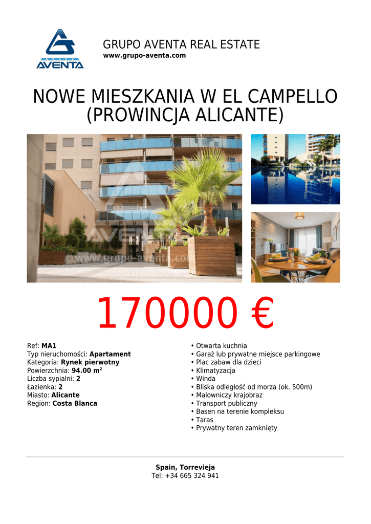 GRUPO AVENTA REAL ESTATE www.grupo-aventa.com NOWE MIESZKANIA W EL CAMPELLO (PROWINCJA ALICANTE) 170000 € Ref: MA1 Typ nieruchomości: Apartament Kategoria: Rynek pierwotny Powierzchnia: 94.00 m2 Liczba sypialni: 2 Łazienka: 2 Miasto: Alicante Region: Costa Blanca • Otwarta kuchnia • Garaż lub prywatne miejsce parkingowe • Plac zabaw dla dzieci • Klimatyzacja • Winda • Bliska odległość od morza (ok. 500m) • Malowniczy krajobraz • Transport publiczny • Basen na terenie kompleksu • Taras • Prywatny teren zamknięty Spain, Torrevieja Tel: +34 665 324 941