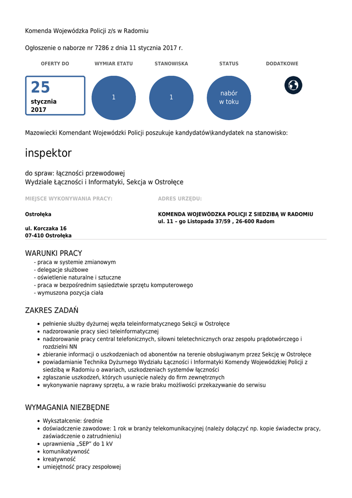 Oferta 7286/2017 - Inspektora w Wydziale Łączności i Informatyki
