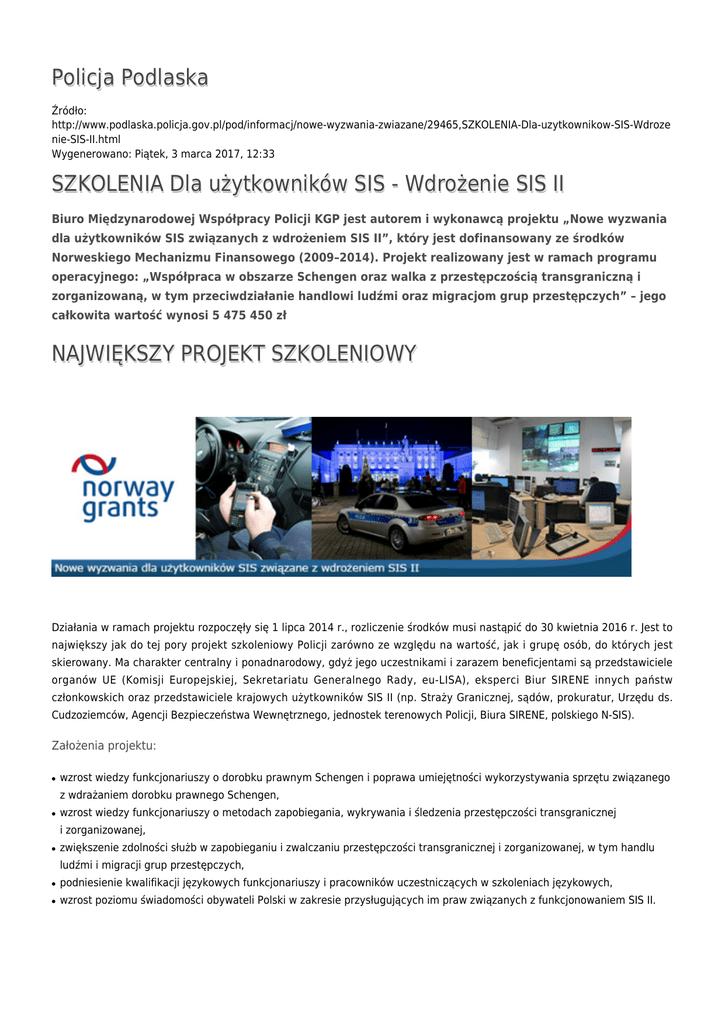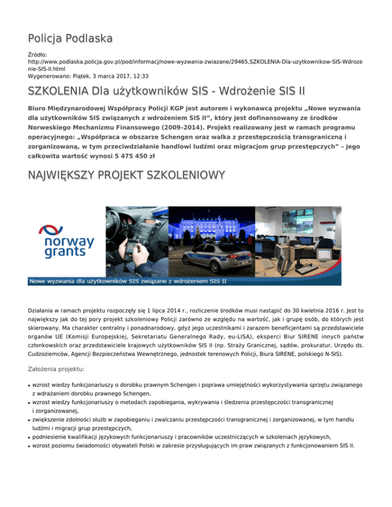 Policja Podlaska SZKOLENIA Dla użytkowników SIS