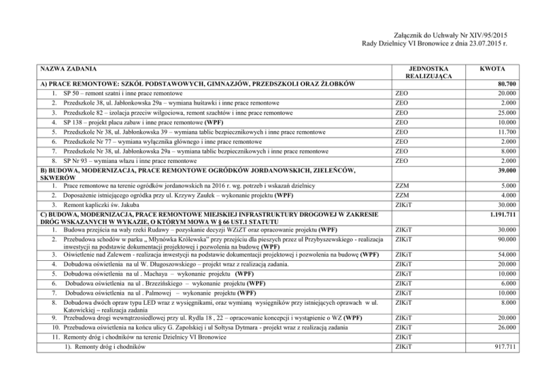 Załącznik do Uchwały Nr XIV/95/2015 Rady Dzielnicy VI Bronowice z dnia 23.07.2015 r. NAZWA ZADANIA JEDNOSTKA REALIZUJĄCA KWOTA A) PRACE REMONTOWE: SZKÓŁ PODSTAWOWYCH, GIMNAZJÓW, PRZEDSZKOLI ORAZ ŻŁOBKÓW 1. SP 50 – remont szatni i inne prace remontowe 2. Przedszkole 38, ul. Jabłonkowska 29a – wymiana huśtawki i inne prace remontowe ZEO ZEO 80.700 20.000 2.000 Przedszkole 82 – izolacja przeciw wilgociowa, remont szachtów i inne prace remontowe SP 138 – projekt placu zabaw i inne prace remontowe (WPF) Przedszkole Nr 38, ul. Jabłonkowska 39 – wymiana tablic bezpiecznikowych i inne prace remontowe Przedszkole Nr 77 – wymiana wyłącznika głównego i inne prace remontowe Przedszkole Nr 38, ul. Jabłonkowska 29a – wymiana tablic bezpiecznikowych i inne prace remontowe SP Nr 93 – wymiana włazu i inne prace remontowe ZEO ZEO ZEO ZEO ZEO ZEO 25.000 10.000 11.700 2.000 8.000 2.000 3. 4. 5. 6. 7. 8. B) BUDOWA, MODERNIZACJA, PRACE REMONTOWE OGRÓDKÓW JORDANOWSKICH, ZIELEŃCÓW, SKWERÓW 1. Prace remontowe na terenie ogródków jordanowskich na 2016 r. wg. potrzeb i wskazań dzielnicy 2. Doposażenie istniejącego ogródka przy ul. Krzywy Zaułek – wykonanie projektu (WPF) 3. Remont kapliczki św. Jakuba C) BUDOWA, MODERNIZACJA, PRACE REMONTOWE MIEJSKIEJ INFRASTRUKTURY DROGOWEJ W ZAKRESIE DRÓG WSKAZANYCH W WYKAZIE, O KTÓRYM MOWA W § 66 UST.1 STATUTU 1. Budowa przejścia na wały rzeki Rudawy – pozyskanie decyzji WZiZT oraz opracowanie projektu (WPF) 2. Przebudowa schodów w parku „ Młynówka Królewska” przy przejściu dla pieszych przez ul Przybyszewskiego - realizacja inwestycji na podstawie dokumentacji projektowej i pozwolenia na budowę (WPF) 3. Oświetlenie nad Zalewem - realizacja inwestycji na podstawie dokumentacji projektowej i pozwolenia na budowę (WPF) 4. Dobudowa oświetlenia na ul W. Długoszowskiego – projekt wraz z realizacją zadania. 5. Dobudowa oświetlenia na ul . Machaya – wykonanie projektu (WPF) 6. Dobudowa oświetlenia na ul . Brzezińskiego – wykonanie projektu (WPF) 7. Dobudowa oświetlenia na ul . Palmowej – wykonanie projektu (WPF) 8. Dobudowa dwóch opraw typu LED wraz z wysięgnikami, oraz wymianą wysięgników przy istniejących oprawach w ul. Katowickiej – realizacja zadania 9. Przebudowa drogi wewnątrzosiedlowej przy ul. Rydla 18 , 22 – opracowanie koncepcji i wystąpienie o WZ (WPF) 10. Przebudowa oświetlenia na końcu ulicy G. Zapolskiej i ul Sołtysa Dytmara - projekt wraz z realizacją zadania 11. Remonty dróg i chodników na terenie Dzielnicy VI Bronowice 1). Remonty dróg i chodników 39.000 ZZM ZZM ZIKiT 5.000 4.000 30.000 1.191.711 ZIKiT ZIKiT 30.000 90.000 ZIKiT ZIKiT ZIKiT ZIKiT ZIKiT ZIKiT 54.000 20.000 10.000 6.000 10.000 8.000 ZIKiT ZIKiT 20.000 26.000 ZIKiT ZIKiT 917.711 D) BUDOWA, MODERNIZACJA, PRACE REMONTOWE OSIEDLOWEJ INFRASTRUKTURY SPORTOWEJ I REKREACYJNEJ E) LOKALNE WYDARZENIA: OŚWIATOWE, KULTURALNE, SPORTOWE I REKREACYJNE 1. Organizacja imprez, uroczystości, konkursów i innych wydarzeń lokalnych dla całej dzielnicy z zakresu kultury. 2. Integracyjne Dni Bronowic CK Dworek Białoprądnicki, CM im. H. Jordana 3. 4. 5. 6. 7. 8. Zeszyty historyczno-literackie Projekty edukacyjne Organizacja wernisażu i druk katalogu na wystawę malarstwa z okazji Dni Bronowic SP Nr 50- Osadzanie chochoła SP Nr 50 - Św. Ul. Tetmajera SP Nr 50 - Korowód Bronowicki CM im. H. Jordana CM im H Jordana CM im. H Jordana ZEO ZEO ZEO 79.200 8.000 25.000 3.000 2.000 3.000 3.000 10.000 2.500 9. SP nr 50 - Wielkanoc w Bronowicach 10. SP Nr 138- Międzyszkolny Dzień Dziecka 11. SP Nr 138 - Międzyszkolny Konkurs Palm ZEO ZEO ZEO 1.000 5.500 1.000 12. 13. 14. 15. 16. 17. ZEO ZEO ZEO ZEO ZEO ZEO 900 800 1.000 1.500 1.500 1.500 ZEO 8.000 SP Nr 138- Miedzyszkolny konkurs Szopek SP Nr 153 - Dzielnicowa Olimpiada Sześciolatka SP Nr 153 - Międzyszkolny Konkurs „Brzechwałki” SP Nr 153 - Międzyszkolny Konkurs pt. „Jestem genialnym dzieckiem, czyli pokaż co potrafisz?” SP Nr 153 – organizacja zawodów sportowych w siatkówce SP Nr 93 – Międzyszkolna gra terenowa pt. „Śladami Jana Pawła II” 18. ZSO Nr 8 - Cykl zawodów sportowych dla dzieci i młodzieży „ od przedszkolaka do starszaka” F) PROGRAM POPRAWY BEZPIECZEŃSTWA DLA GMINY MIEJSKIEJ KRAKÓW "BEZPIECZNY KRAKÓW" 1. Zestaw diagnostyczny do monitorowania stanu poszkodowanego 2. Przenośny zestaw nagłośnieniowy z mikrofonosłuchawką 3. Zestaw z maską do ewakuacji osób poszkodowanych 4. Zakup materiałów profilaktycznych dla uczestników zajęć organizowanych przez SMMK 5. 6. 7. Zakup nagród i organizacja działań profilaktycznych Zakup materiałów dydaktyczno-profilaktycznych Zakup odblasków na rękę i tornister G) DZIELNICOWY PROGRAM WSPIERANIA OŚÓB NIEPEŁNOSPRAWNYCH 1. Zajęcia usprawniające w wodzie i na sali gimnastycznej dla dzieci i młodzieży niepełnosprawnej z fizjoterapeutą – konkurs ofert 2. Integracja społeczna osób niepełnosprawnych oraz umożliwienie im uczestnictwa w wydarzeniach kulturalnych – konkurs ofert 3. Integracyjny Dzień Sportu z piknikiem oraz Integracyjne Dni Bronowic 4. Wykonanie przejść medialnych wg. wskazań dzielnicy KM PSP KM PSP KM PSP SMMK 20.000 6.000 2.000 8.000 1.000 SMMK OC OC 1.000 1.000 1.000 SO 89.759 6.000 SO 12.500 SO ZIKiT 12.000 24.259 5. 6. 7. SP Nr 93 – Wykonanie podjazdu dla osób niepełnosprawnych wraz z barierkami Spotkania integracyjne dla osób starszych i niepełnosprawnych – mieszkańców dzielnicy Zakup samochodu do przewozu osób niepełnosprawnych H) DZIELNICOWY PROGRAM OCHRONY ZDROWIA I PROFILAKTYKI ZDROWOTNEJ 1. Szczepienia przeciwko grypie dla mieszkańców po 65 r. życia dla mieszkańców dzielnicy. I) DZIELNICOWY PROGRAM WSPIERANIA DZIAŁALNOŚCI MIEJSKICH PLACÓWEK: OŚWIATY, KULTURY, SPORTU, POMOCY SPOŁECZNEJ I ZDROWIA 1. Filia Nr 7 Krowoderskiej Biblioteki Publicznej 2. Filia Nr 8 Krowoderskiej Biblioteki Publicznej 3. Klub Kultury Mydlniki 
