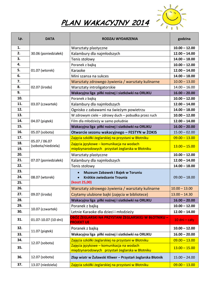 PLAN WAKACYJNY 2014 Lp. 1. 2. 3. 4. 5. 6. 7. 8. 9. 10. 11. 12. 13. 14. 15. 16. 17. 18. 19. 20. 21. 22. 23. 24. 25. 26. 27. 28. 29. 30. 31. 32. 33. 34. DATA 30.06 (poniedziałek) RODZAJ WYDARZENIA Warsztaty plastyczne Kalambury dla najmłodszych Tenis stołowy Poranek z bajką 01.07 (wtorek) 02.07 (środa) Karaoke Mini szansa na sukces Warsztaty zdrowego żywienia / warsztaty kulinarne Warsztaty introligatorskie Wakacyjna liga piłki nożnej i siatkówki na ORLIKU Poranek z bajką 03.07 (czwartek) Kalambury dla najmłodszych Ognisko z zabawami na świeżym powietrzu 04.07 (piątek) W zdrowym ciele – zdrowy duch – pobudka przez ruch Film dla młodzieży w samo południe Wakacyjna liga piłki nożnej i siatkówki na ORLIKU 05.07 (sobota) Otwarcie sezonu wakacyjnego – FESTYN w ŻOKIS 05.07 / 06.07 (sobota/niedziela) Zajęcia szkółki żeglarskiej na przystani w Błotniku godzina 10.00 – 12.00 12.00 – 14.00 14.00 – 18.00 10.00 – 12.00 12.00 – 14.00 14.00 – 18.00 10.00 – 13.00 14.00 – 16.00 16.00 – 20.00 10.00 – 12.00 12.00 – 14.00 14.00 – 18.00 10.00 – 12.00 12.00 – 14.00 16.00 – 20.00 15.00 – 02.00 09.00 – 13.00 Zajęcia językowe – komunikacja na wodach międzynarodowych przystań żeglarska w Błotniku 13.00 – 15.00 07.07 (poniedziałek) Warsztaty plastyczne Kalambury dla najmłodszych Tenis stołowy 10.00 – 12.00 12.00 – 14.00 14.00 – 18.00 08.07 (wtorek) Muzeum Zabawek i Bajek w Toruniu Krótkie zwiedzanie Trounia (koszt 25,00) 09.00 – 18.00 09.07 (środa) Warsztaty zdrowego żywienia / warsztaty kulinarne Czytamy ulubione bajki (zajęcia w bibliotece) Wakacyjna liga piłki nożnej i siatkówki na ORLIKU 10.07 (czwartek) 01.07-10.07 (10 dni) 11.07 (piątek) 12.07 (sobota) 35. Poranek z bajką Letnie Karaoke dla dzieci i młodzieży OBÓZ ŻEGLARSKI NA PRZYSTANI ŻEGLARSKIEJ W BŁOTNIKU – PROJEKT UE 10.00 – 13.00 13.00 – 14.30 16.00 – 20.00 10.00 – 12.00 12.00 – 14.00 10 dni – cały Poranek z bajką 10.00 – 12.00 Wakacyjna liga piłki nożnej i siatkówki na ORLIKU 16.00 – 20.00 Zajęcia szkółki żeglarskiej na przystani w Błotniku Zajęcia językowe – komunikacja na wodach międzynarodowych przystań żeglarska w Błotniku 09.00 – 13.00 13.00 – 15.00 36. 12.07 (sobota) Złap wiatr w Żuławski Kliwer – Przystań żeglarska Błotnik 15.00 – 24.00 37. 13.07 (niedziela) Zajęcia szkółki żeglarskiej na przystani w Błotniku 09.00 – 13.00 Zajęcia językowe – komunikacja na wodach międzynarodowych przystań żeglarska w Błotniku 38. 39. 40. 41. 42. 43. 44. 45. 46. 47. 48. 49. 50. 51. 52. 53. 14.07 (poniedziałek) 15.07 (wtorek) Warsztaty plastyczne W zdrowym ciele – zdrowy duch – pobudka przez ruch Film dla młodzieży w samo południe Zajęcia taneczne – tworzenie wakacyjnej choreografii Zajęcia animacyjne dla najmłodszych 16.07 (środa) Kalambury dla najmłodszych Zajęcia komputerowe dla dzieci i młodzieży Wakacyjna liga piłki nożnej i siatkówki na ORLIKU 17.07 (czwartek) 18. 07 (piątek) 19.07 / 20.07 (sobota/niedziela) 54. 55. 56. 21.07 (poniedziałek) 57. 22.07 (wtorek) 58. 59. 60. 61. 62. 63. 64. 65. 66. 67. 68. 69. 70. 71. 72. 73. 74. 75. 76. 77. 78. Poranek z bajką 23.07 (środa) 24.07 (czwartek) 25. 07 (piątek) 26.07 / 27.07 (sobota/niedziela) 28.07 (poniedziałek) 29.07 (wtorek) 30.07 (środa) 31.07 (czwartek) 01. 08 (piątek) 02. 08 (sobota) Poranek z bajką Warsztaty z nauki jazdy na rolkach Wakacyjna Dyskoteka dla dzieci i młodzieży Wakacyjna liga piłki nożnej i siatkówki na ORLIKU Zajęcia szkółki żeglarskiej na przystani w Błotniku Zajęcia językowe – komunikacja na wodach międzynarodowych przystań żeglarska w Błotniku Tworzenie kartonowych obrazów Letnie Karaoke dla dzieci i młodzieży Tenis stołowy Miasteczko Westernowe (koszt 30,00) Spacer z mapą – wędrówka po okolicy Bieg z przeszkodami – zabawy na Świeżym powietrzu Wakacyjna liga piłki nożnej i siatkówki na ORLIKU Gra terenowa dla młodzieży – podchody Tworzenie biżuterii wakacyjnej Warsztaty z nauki jazdy na rolkach Wakacyjna liga piłki nożnej i siatkówki na ORLIKU Zajęcia szkółki żeglarskiej na przystani w Błotniku Zajęcia językowe – komunikacja na wodach międzynarodowych przystań żeglarska w Błotniku Gry i zabawy na papierze Kalambury dla najmłodszych Zajęcia w Sali komputerowej Poranek z bajką Zajęcia animacyjne dla najmłodszych Zajęcia taneczne – tworzenie wakacyjnej choreografii Gry z dzieciństwa naszych rodziców Wakacyjna liga piłki nożnej i siatkówki na ORLIKU Łeba Park – Park dinozaurów (koszt 30,00) Przedstawienie teatralne Wakacyjna liga piłki nożnej i siatkówki na ORLIKU Dwudniowy VII Żuławski Rajd Rowerowy z noclegiem na 13.00 – 15.00 10.00 – 12.00 12.00 – 14.00 10.00 – 12.00 12.00 – 14.00 14.00 – 16.00 10.00 – 12.00 12.00 – 14.00 14.00 – 16.00 16.00 – 20.00 10.00 – 12.00 12.00 – 16.00 19.00 – 22.00 16.00 – 20.00 09.00 – 13.00 13.00 – 15.00 10.00 – 12.00 12.00 – 14.00 14.00 – 18.00 08.00 – 18.00 11.00 – 13.00 13.00 – 16.00 16.00 – 20.00 11.00 – 16.00 10.00 – 13.00 13.00 – 16.00 16.00 – 20.00 09.00 – 13.00 13.00 – 15.00 10.00 – 12.00 12.00 – 14.00 14.00 – 18.00 10.00 – 12.00 12.00 – 14.00 14.00 – 16.00 11.00 – 15.00 16.00 – 20.00 07.30 – 20.00 12.00 – 13.30 16.00 – 20.00 09.00 – 09.00 79. 80. 81. 82. 83. 84. 85. 86. 87. 88. 89. 90. 91. 92. 93. 94. 95. 03. 08 (niedziela) 02.08 / 03.08 (sobota/niedziela) 04.08 (poniedziałek) 05.08 (wtorek) 06.08 (środa) 07.08 (czwartek) 08.08 (piątek) 09.08 (sobota) 09.08 / 10.08 (sobota/niedziela) 96. 97. 11.08 (poniedziałek) 98. 11 – 20.08 (10 dni) 99. 100. 101. 12.08 (wtorek) 102. 14.08 (czwartek) 103. 104. 105. 106. 107. 108. 109. 110. 111. 112. 113. 114. 115. 116. 13.08 (środa) 16.08 / 17.08 (sobota/niedziela) 18.08 (poniedziałek) 19.08 (wtorek) 20.08 (środa) 21.08 (czwartek) 22.08 (piątek) 23.08 / 24.08 (
