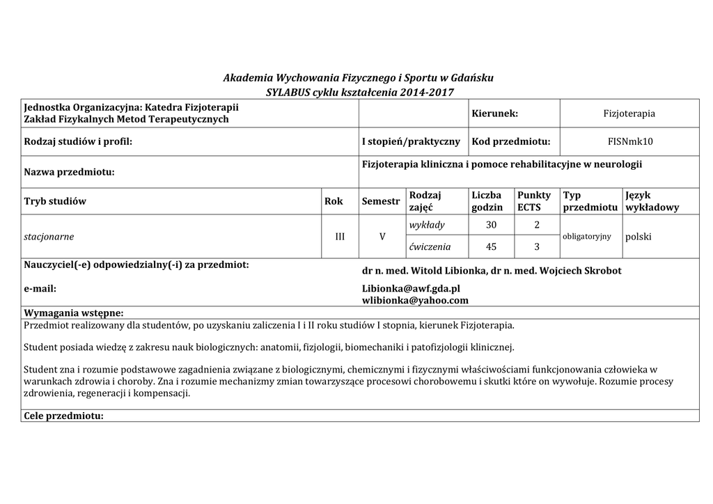 Załącznik nr 6 do Uchwały Senatu AWFiS w Gdańsku Nr 10 z dnia 8 marca 2012 roku Akademia Wychowania Fizycznego i Sportu w Gdańsku SYLABUS cyklu kształcenia 2014-2017 Jednostka Organizacyjna: Katedra Fizjoterapii Zakład Fizykalnych Metod Terapeutycznych Rodzaj studiów i profil: I stopień/praktyczny stacjonarne Nauczyciel(-e) odpowiedzialny(-i) za przedmiot: e-mail: Kod przedmiotu: FISNmk10 Fizjoterapia kliniczna i pomoce rehabilitacyjne w neurologii Nazwa przedmiotu: Tryb studiów Fizjoterapia Kierunek: Rok III Semestr V Rodzaj zajęć Liczba godzin Punkty ECTS wykłady 30 2 ćwiczenia 45 3 Typ Język przedmiotu wykładowy obligatoryjny polski dr n. med. Witold Libionka, dr n. med. Wojciech Skrobot [email protected] [email protected] Wymagania wstępne: Przedmiot realizowany dla studentów, po uzyskaniu zaliczenia I i II roku studiów I stopnia, kierunek Fizjoterapia. Student posiada wiedzę z zakresu nauk biologicznych: anatomii, fizjologii, biomechaniki i patofizjologii klinicznej. Student zna i rozumie podstawowe zagadnienia związane z biologicznymi, chemicznymi i fizycznymi właściwościami funkcjonowania człowieka w warunkach zdrowia i choroby. Zna i rozumie mechanizmy zmian towarzyszące procesowi chorobowemu i skutki które on wywołuje. Rozumie procesy zdrowienia, regeneracji i kompensacji. Cele przedmiotu: Celem nauczania jest wyposażenie studenta w podstawową wiedzę i podstawowe umiejętności związane z badaniem klinicznym i radiologicznym dla potrzeb oceny stanu klinicznego, radiologicznego i fizycznego chorego z wybranymi jednostkami chorób w neurologii oraz wyposażenie w wiedzę i umiejętności niezbędne do wykonywania zabiegów fizjoterapeutycznych i doboru zaopatrzenia ortopedycznego ortotyczno-protetetycznego i pomocy rehabilitacyjnych w chorobach neurologicznych. Opis efektów kształcenia dla przedmiotu oraz ich powiązanie z efektami kształcenia dla kierunku: WIEDZA Definiuje i zna objawy wybranych chorób neurologicznych. W1 W2 W3 W4 Zna wskazania, przeciwwskazania i powikłania leczenia zachowawczego oraz operacyjnego. Zna schemat postępowania fizjoterapeutycznego w wybranych jednostkach chorobowych. K_W12, K_W13, K_W14 K_W20, K_W21 Zna rodzaje zaopatrzenia protetycznego, ortotycznego i pomoce rehabilitacyjne stosowane w rehabilitacji chorych ze schorzeniami neurologicznymi. UMIEJĘTNOŚCI U1 U2 U3 U4 Umie wymienić i opisać objawy kliniczne i obrazowe wybranych schorzeń Potrafi wykonać podstawowe procedury diagnozowania funkcjonalnego w różnych jednostkach K_U07, K_U17 chorobowych. K_U11, K_U12, K_U14 Potrafi wykonać zabiegi fizjoterapeutyczne w wybranych jednostkach chorobowych w stanach ostrych K_U03,K_U04, K_U13 i przewlekłych. Potrafi nauczyć chorego jak korzystać z różnych form zaopatrzenia ortotycznego, protetycznego i pomocy rehabilitacyjnych w chorobach neurologicznych. KOMPETENCJE K1 Jest świadom obowiązków i odpowiedzialności za prowadzone podstawowe badania funkcjonalne oraz wykonane procedury fizjoterapeutyczne i rehabilitacyjne w schorzeniach neurologicznych. K2 Rozumie potrzebę pracy w zespole terapeutycznym oraz ma świadomość potrzeby uczenia się i doskonalenia zawodowego dla potrzeb pomocy osobie chorej i/lub niepełnosprawnej w odzyskiwaniu samodzielności w życiu K_K08, K_K09, K_K12, K_K13 K_K01, K_K02, K_K03, K_K07 Przestrzega właściwych relacji z chorym i okazuje mu należy szacunek, dba o jego dobro i nawiązuje właściwe relacje z rodzina i otoczeniem chorego w celu utrwalenia i poprawy efektu terapii w K_K04, K_K05 schorzeniach neurologicznych. Kryteria i metody oceny osiągniętych efektów kształcenia: Pozytywny wynik zaliczenia umiejętności (zaliczenie z ceną – ćwiczenia) na który składa się: średnia ważona ocen z ćwiczeń z ortopedii, ćwiczeń z fizjoterapii w ortopedii. Pozytywny wynik egzaminu pisemnego (treści nauczania z całego bloku kształcenia, minimum 60% pozytywnych odpowiedzi). Aby uzyskać zaliczenie przedmiotu na ocenę dostateczną student musi osiągnąć wszystkie wymienione w sylabusie efekty kształcenia Wykład z prezentacją multimedialną, ćwiczenia w pracowni praktycznej nauki Metody i formy realizacji przedmiotu: zawodu i ćwiczenia kliniczne K3 Treści kształcenia: Wykłady: Charakterystyka wybranych schorzeń w neurologii. Diagnostyka kliniczna i obrazowa w chorobach układu nerwowego. Leczenie w wybranych jednostkach chorobowych. Wskazania, przeciwwskazania rokowanie i powikłania leczenia zachowawczego i operacyjnego w neurologii. Fizjoterapia w wybranych jednostkach chorobowych w neurologii. Podstawy diagnozowania funkcjonalnego i podstawy programowania fizjoterapii w wybranych jednostkach chorobowych. Zaopatrzenie protetyczno-ortopedyczne i pomoce rehabilitacyjne w dysfunkcjach narządu ruchu spowodowanych chorobami układu nerwowego. Ćwiczenia: Demonstracja i charakterystyka chorego w neurologii. Badanie w neurologii. Planowanie leczenia neurologicznego. Proces rekonwalescencji. Dobór procedur fizjoterapeutycznych we wczesnych i późnych okresach rekonwalescencji chorego. Demonstracja zaopatrzenia protetyczno-ortopedycznego. Nauka posługiwania się pomocami rehabilitacyjnymi. Forma zaliczenia: Literatura: Ćwiczenia – zaliczenie z oceną Wykłady: egzamin Podstawowa: „Rehabilitacja medyczna" Milanowaska M. Wyd. Lekarskie PZWL 2003 Uzupełniająca: „Fizjoterapia w rehabilitacji neurologicznej” Kwolek A. Wyd. Urban &Partner 2010 „The Bobath Concept in Adult Neurology”, B. Gjelsvik, 2008 Bilans punktów ECTS (1 pkt ECTS – 25-30 godz. pracy studenta): Aktywność Udział w wykładach Samodzielne studiowanie tematyki wykładów Udział w ćwiczeniach Przygotowywanie się do ćwiczeń Przygotowanie się do zaliczenia praktycznego Przygotowanie się do egzaminu Całkowite obciążenie pracą studenta Punkty ECTS za przedmiot Obciążenie studenta 30 15 45 10 25 25 godz. 150 ECTS: 5