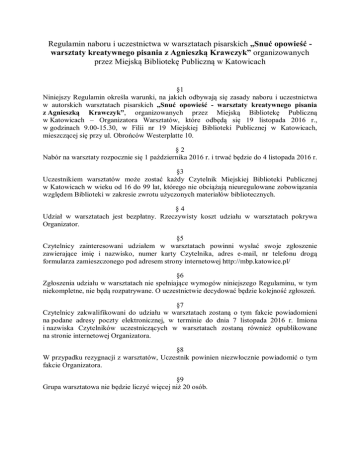 Regulamin naboru i uczestnictwa w warsztatach pisarskich „Snuć opowieść warsztaty kreatywnego pisania z Agnieszką Krawczyk” organizowanych przez Miejską Bibliotekę Publiczną w Katowicach §1 Niniejszy Regulamin określa warunki, na jakich odbywają się zasady naboru i uczestnictwa w autorskich warsztatach pisarskich „Snuć opowieść - warsztaty kreatywnego pisania z Agnieszką Krawczyk”, organizowanych przez Miejską Bibliotekę Publiczną w Katowicach – Organizatora Warsztatów, które odbędą się 19 listopada 2016 r., w godzinach 9.00-15.30, w Filii nr 19 Miejskiej Biblioteki Publicznej w Katowicach, mieszczącej się przy ul. Obrońców Westerplatte 10. §2 Nabór na warsztaty rozpocznie się 1 października 2016 r. i trwać będzie do 4 listopada 2016 r. §3 Uczestnikiem warsztatów może zostać każdy Czytelnik Miejskiej Biblioteki Publicznej w Katowicach w wieku od 16 do 99 lat, którego nie obciążają nieuregulowane zobowiązania względem Biblioteki w zakresie zwrotu użyczonych materiałów bibliotecznych. §4 Udział w warsztatach jest bezpłatny. Rzeczywisty koszt udziału w warsztatach pokrywa Organizator. §5 Czytelnicy zainteresowani udziałem w warsztatach powinni wysłać swoje zgłoszenie zawierające imię i nazwisko, numer karty Czytelnika, adres e-mail, nr telefonu drogą formularza zamieszczonego pod adresem strony internetowej http://mbp.katowice.pl/ §6 Zgłoszenia udziału w warsztatach nie spełniające wymogów niniejszego Regulaminu, w tym niekompletne, nie będą rozpatrywane. O uczestnictwie decydować będzie kolejność zgłoszeń. §7 Czytelnicy zakwalifikowani do udziału w warsztatach zostaną o tym fakcie powiadomieni na podane adresy poczty elektronicznej, w terminie do dnia 7 listopada 2016 r. Imiona i nazwiska Czytelników uczestniczących w warsztatach zostaną również opublikowane na stronie internetowej Organizatora. §8 W przypadku rezygnacji z warsztatów, Uczestnik powinien niezwłocznie powiadomić o tym fakcie Organizatora. §9 Grupa warsztatowa nie będzie liczyć więcej niż 20 osób. §10 Warsztaty poprowadzi Agnieszka Krawczyk, autorka powieści Magiczne miejsce, Dolina mgieł i róż, Ogród księżycowy, Siostry. §11 Warsztaty pisarskie odbędą się 19 listopada 2016 r., w godzinach 9.00-15.30, w Filii nr 19 Miejskiej Biblioteki Publicznej w Katowicach, mieszczącej się przy ul. Obrońców Westerplatte 10. §12 Przystępując do naboru Czytelnik wyraża zgodę na zasady organizacji warsztatów określone niniejszym Regulaminem. §13 Administratorem przetwarzanych danych osobowych jest Miejska Biblioteka Publiczna w Katowicach, ul. Kossutha 11. Dane będą przetwarzane wyłącznie w celu przeprowadzenia naboru, a w wyniku zakwalifikowania uczestnika – jego udziału w warsztatach. Dane osobowe Czytelników uczestniczących w warsztatach mogą zostać udostępnione innym podmiotom wyłącznie w celu ewaluacji, kontroli, monitoringu i sprawozdawczości w ramach realizacji projektu. §14 Organizator zastrzega sobie, z powodu nie dających się przewidzieć okoliczności, prawo odwołania lub zmiany terminu warsztatów. §15 W kwestiach nieuregulowanych w niniejszym Regulaminie lub w razie wątpliwości wynikłych przy jego stosowaniu, decyzję podejmuje Dyrektor Miejskiej Biblioteki Publicznej w Katowicach.