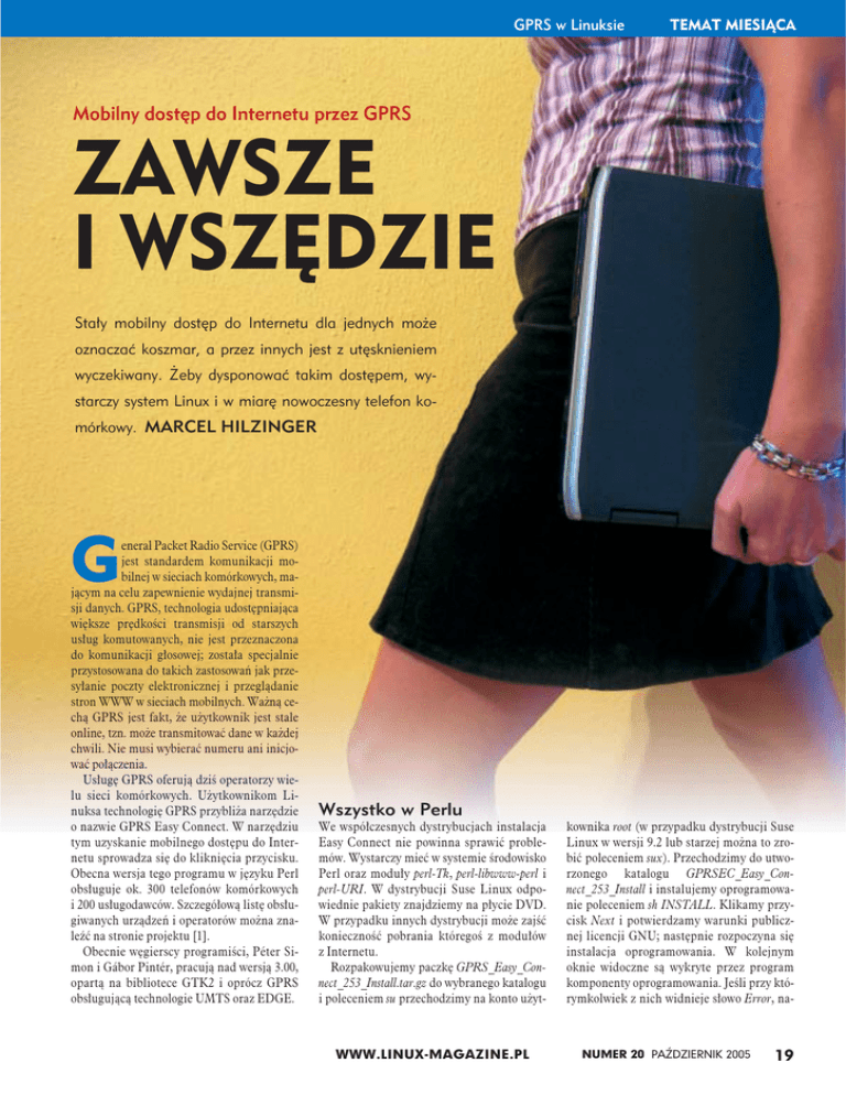 GPRS w Linuksie TEMAT MIESIĄCA Mobilny dostęp do Internetu przez GPRS ZAWSZE I WSZĘDZIE Stały mobilny dostęp do Internetu dla jednych może oznaczać koszmar, a przez innych jest z utęsknieniem wyczekiwany. Żeby dysponować takim dostępem, wystarczy system Linux i w miarę nowoczesny telefon komórkowy. MARCEL HILZINGER G eneral Packet Radio Service (GPRS) jest standardem komunikacji mobilnej w sieciach komórkowych, mającym na celu zapewnienie wydajnej transmisji danych. GPRS, technologia udostępniająca większe prędkości transmisji od starszych usług komutowanych, nie jest przeznaczona do komunikacji głosowej; została specjalnie przystosowana do takich zastosowań jak przesyłanie poczty elektronicznej i przeglądanie stron WWW w sieciach mobilnych. Ważną cechą GPRS jest fakt, że użytkownik jest stale online, tzn. może transmitować dane w każdej chwili. Nie musi wybierać numeru ani inicjować połączenia. Usługę GPRS oferują dziś operatorzy wielu sieci komórkowych. Użytkownikom Linuksa technologię GPRS przybliża narzędzie o nazwie GPRS Easy Connect. W narzędziu tym uzyskanie mobilnego dostępu do Internetu sprowadza się do kliknięcia przycisku. Obecna wersja tego programu w języku Perl obsługuje ok. 300 telefonów komórkowych i 200 usługodawców. Szczegółową listę obsługiwanych urządzeń i operatorów można znaleźć na stronie projektu [1]. Obecnie węgierscy programiści, Péter Simon i Gábor Pintér, pracują nad wersją 3.00, opartą na bibliotece GTK2 i oprócz GPRS obsługującą technologie UMTS oraz EDGE. Wszystko w Perlu We współczesnych dystrybucjach instalacja Easy Connect nie powinna sprawić problemów. Wystarczy mieć w systemie środowisko Perl oraz moduły perl-Tk, perl-libwww-perl i perl-URI. W dystrybucji Suse Linux odpowiednie pakiety znajdziemy na płycie DVD. W przypadku innych dystrybucji może zajść konieczność pobrania któregoś z modułów z Internetu. Rozpakowujemy paczkę GPRS_Easy_Connect_253_Install.tar.gz do wybranego katalogu i poleceniem su przechodzimy na konto użyt- WWW.LINUX-MAGAZINE.PL kownika root (w przypadku dystrybucji Suse Linux w wersji 9.2 lub starzej można to zrobić poleceniem sux). Przechodzimy do utworzonego katalogu GPRSEC_Easy_Connect_253_Install i instalujemy oprogramowanie poleceniem sh INSTALL. Klikamy przycisk Next i potwierdzamy warunki publicznej licencji GNU; następnie rozpoczyna się instalacja oprogramowania. W kolejnym oknie widoczne są wykryte przez program komponenty oprogramowania. Jeśli przy którymkolwiek z nich widnieje słowo Error, na- NUMER 20 PAŹDZIERNIK 2005 19 TEMAT MIESIĄCA GPRS w Linuksie leży doinstalować brakujący program. Aby uzyskać więcej informacji o zależnościach, instalator można wywołać poleceniem sh INSTALL -c. Po spełnieniu zależności klikamy przycisk Next. Instalator kopiuje wymagane komponenty w odpowiednie miejsca; po zakończeniu instalacji klikamy przycisk Finish. Konfiguracja Po pierwszym uruchomieniu programu (przez naciśnięcie kombinacji klawiszy [Alt]+[F2] i wpisanie w okienku urucha- Rysunek 1: Przed korzystaniem z programu Easy Connect konieczne jest skonfigurowanie telefonu komórkowego. miania słowa gprsec) wyświetlane jest główne okno Easy Connect (Rysunek 1). Aby skonfigurować parametry telefonu komórkowego, usługodawcy i połączenia, klikamy przycisk Setup GPRS Easy Connect (Rysunek 2). Telefon należy wybrać z listy na górze, a usługodawcę z listy dostępnej po naciśnięciu przycisku Choose your provider (Wybierz usługodawcę). Easy Connect wyświetla zdjęcie wybranego telefonu – to bardzo pomocna funkcja, jeśli nie mamy pewności, czy wybraliśmy właściwy model. Po wybraniu usługodawcy program automatycznie wypełnia dane konta, np. adres APN, nazwę użytkownika i hasło. Informacje te można także znaleźć w Internecie [2] lub bezpośrednio u usługodawcy. Aby wybrać interfejs komunikacji internetowej, używamy opcji Select the port (Wybierz port). Ustawienie zależy tutaj od typu połączenia. W przypadku urządzeń Bluetooth zazwyczaj interfejs nosi nazwę /dev/rfcomm0 (patrz Ramka „Podłączanie telefonu przez Bluetooth”). Dla połączeń USB należy wybrać plik urządzenia /dev/ttyACM0. Jeśli telefon połączony jest 20 NUMER 20 PAŹDZIERNIK 2005 z komputerem kablem szeregowym, wybieramy /dev/ttyS0. Port na podczerwień reprezentowany jest przez urządzenie /dev/ircomm0. Szczegółowe informacje o konfigurowaniu połączeń na podczerwień można znaleźć w artykule „Usługi katalogowe: Zarządzanie telefonem komórkowym za pomocą programów Gammu i Wammu” w bieżącym numerze LM. Jeśli na liście nie ma potrzebnego typu interfejsu, należy zaznaczyć opcję Expert port scan (Zaawansowane skanowanie portów) i wybrać odpowiednią pozycję. Opcja Select your language (Wybierz język) służy do zmiany języka interfejsu. Następnie klikamy przycisk OK/Save Data (OK/ Zapisz dane); spowoduje to ponowne wyświetlenie głównego okna programu. W oknie tym dostępny jest przycisk Connect, którego kliknięcie powinno spowodować nawiązanie połączenia z Internetem. Kiedy połączenie jest aktywne, Easy Connect wyświetla przydzielony komputerowi adres IP oraz statystyki transmisji danych. Korzystanie na co dzień i sztuczki Podczas testowania Easy Connect należy uruchamiać jako root. To zapewnia dostęp do pliku /etc/resolv.conf (ustawienia serwera nazw) oraz demona PPP (skrypty chat). W naszym laboratorium telefon często zgłaszał problemy z połączeniem Bluetooth, mimo że połączenie było aktywne. Ten problem może niekorzystnie odbić się na zawartości naszej kieszeni, jeśli wziąć pod uwagę ceny mobilnego dostępu do Internetu. Aby uniknąć nieprzyjemnych niespodzianek, warto sprawdzić zawartość wyświetlacza telefonu po kliknięciu Connect: większość telefonów informuje o nawiązaniu połączenia. W przypadku połączeń Bluetooth, gdy telefon