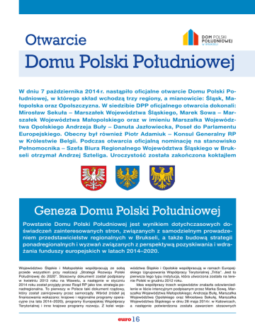 Otwarcie Domu Polski Południowej W dniu 7 października 2014 r. nastąpiło oficjalne otwarcie Domu Polski Południowej, w którego skład wchodzą trzy regiony, a mianowicie: Śląsk, Małopolska oraz Opolszczyzna. W siedzibie DPP oficjalnego otwarcia dokonali: Mirosław Sekuła – Marszałek Województwa Śląskiego, Marek Sowa – Marszałek Województwa Małopolskiego oraz w imieniu Marszałka Województwa Opolskiego Andrzeja Buły – Danuta Jazłowiecka, Poseł do Parlamentu Europejskiego. Obecny był również Piotr Adamiuk – Konsul Generalny RP w Królestwie Belgii. Podczas otwarcia oficjalną nominację na stanowisko Pełnomocnika – Szefa Biura Regionalnego Województwa Śląskiego w Brukseli otrzymał Andrzej Szteliga. Uroczystość została zakończona koktajlem Geneza Domu Polski Południowej Powstanie Domu Polski Południowej jest wynikiem dotychczasowych doświadczeń zainteresowanych stron, związanych z samodzielnym prowadzeniem przedstawicielstw regionalnych w Brukseli, a także budową strategii ponadregionalnych i wyzwań związanych z perspektywą pozyskiwania i wdrażania funduszy europejskich w latach 2014–2020. Województwo Śląskie i Małopolskie współpracują ze sobą przede wszystkim przy realizacji „Strategii Rozwoju Polski Południowej do 2020”. Stosowny dokument został podpisany w kwietniu 2013 roku na Wawelu, a następnie w styczniu 2014 roku został przyjęty przez Rząd RP jako tzw. strategia ponadregionalna. To pierwszy w Polsce taki dokument rządowy, który został zainicjowany przez samorządy. Wśród źródeł jej finansowania wskazano: krajowe i regionalne programy operacyjne (na lata 2014–2020), programy Europejskiej Współpracy Terytorialnej i inne krajowe programy rozwoju. Z kolei woje- wództwa Śląskie i Opolskie współpracują w ramach Europejskiego Ugrupowania Współpracy Terytorialnej „Tritia”. Jest to pierwsza tego typu instytucja, która utworzona została na terenie Polski w grudniu 2012 roku. Idea współpracy trzech województw znalazła odzwierciedlenie w liście intencyjnym podpisanym przez Marka Sowę, Marszałka Województwa Małopolskiego; Andrzeja Bułę, Marszałka Województwa Opolskiego oraz Mirosława Sekułę, Marszałka Województwa Śląskiego w dniu 28 maja 2014 r. w Katowicach, a następnie potwierdzona została zawarciem stosownych 16 prosto z Brukseli w Brukseli Cele Domu Polski Południowej Celem Domu Polski Południowej jest wspólna reprezentacja i promocja tych regionów w Brukseli wobec instytucji unijnych poprzez koordynację wspólnych działań, tworzenie wspólnych projektów, wzajemne wsparcie oraz współuczestnictwo w inicjatywach i wydarzeniach unijnych. W SZCZEGÓLNOŚCI CELE TE BĘDĄ REALIZOWANE POPRZEZ: • koordynowanie wspólnych działań i inicjatyw zmierzających do wykreowania i promowania wspólnej marki pod nazwą Dom Polski Południowej wobec instytucji unijnych i na szeroko pojętym forum europejskim; • wspólne partycypowanie w projektach unijnych oraz wydarzeniach wpisanych w tzw. agendę Instytucji Unii Europejskiej; • udział w imprezach promocyjnych na terenie Brukseli, Belgii oraz poza jej granicami; prowadzenie wspólnej, aktywnej i nowoczesnej polityki promocyjno-informacyjnej; • zapewnienie spójnej identyfikacji wizerunkowej Domu Polski Południowej w Brukseli. Uroczysta inauguracja Domu Polski Południowej w Brukseli Koordynację działań Domu Polski Południowej w Brukseli zapewnia wspólny Sekretariat, odpowiedzialny za obsługę inicjatyw realizowanych pod wspólnym szyldem. umów. W 2015 ROKU DZIAŁALNOŚĆ DOMU POLSKI POŁUDNIOWEJ BĘDZIE NASTAWIONA NA NASTĘPUJĄCĄ PROBLEMATYKĘ: • Innowacje: nowoczesne technologie, inteligentne specjalizacje (w tym ICT) oraz MŚP (Woj. Małopolskie); • Energia (w tym OZE) oraz ochrona środowiska i gospodarka wodna (Woj. Śląskie); • Problemy demograficzne oraz temat aktywnego starzenia się 17 SOUTH POLAND HOUSE rue du Luxembourg 3 1000 Brussels Belgium tel.: 32 25 14 77 67 e-mail: [email protected] Wystawa „Architektura Małopolski, Śląska i Opolszczyzny – 10 lat Polski w UE” W dniach 7–17 października br. można było zobaczyć pod Parlamentem Europejskim w Brukseli wystawę „Architektura Małopolski, Śląska i Opolszczyzny – 10 lat Polski w UE” prezentującą obiekty architektoniczne z województw małopolskiego, śląskiego oraz opolskiego zbudowanych lub odnowionych w ostatniej dekadzie Wystawa pt. „Architektura Małopolski, Śląska i Opolszczyzny – 10 lat Polski w UE” była pierwszym wydarzeniem organizowanym przez Dom Polski Południowej w Brukseli i oficjalną inauguracją jego działalności. Organizowana w ramach Europejskiego Tygodnia Regionów i Miast OPEN DAYS 2014, pod patronatem Posłów do Parlamentu Europejskiego wywodzących się z powyższych województw tj. Jerzego Buzka, Danuty Jazłowieckiej, Róży Thun i Jana Olbrychta, wystawa prezentowała wybrane obiekty architektoniczne, sfinansowane ze środków unijnych w ostatnim dziesięcioleciu w województwach Małopolskim, Śląskim i Opolskim. Podobny sposób myślenia przy wyborze reprezentatywnych realizacji we wszystkich trzech wojewódz- Otwarcie wystawy na Esplanadzie Solidarności pod Parlamentem Europejskim w Brukseli twach sprawia, że trzy listy obiektów są komplementarne i uzupełniają się wzajemnie, ukazując wizerunek bieżącej realizacji „Strategii Rozwoju Polski Południowej do roku 2020”. Kuratorem wystawy został Senator Janusz Sepioł, a za jej aranżację w Brukseli odpowiedzialny był Bohdan Lisowski – Prezes Krakowskiego Oddziału SARP’u. Całość wystawy zawarta została w wybranych 23 dwustronnych totemach (fotogramach), po 9 dla województw małopolskiego oraz śląskiego oraz 5 dla województwa opolskiego. Oficjalnego otwarcia wystawy w dniu 7 października br. dokonali: Mirosław Sekuła, Marszałek Województwa Śląskiego; Marek Sowa, Marszałek Województwa Małopols