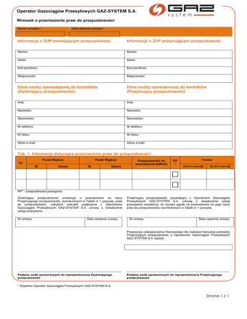 Operator Gazociągów Przesyłowych GAZ-SYSTEM S.A. Wniosek o przeniesienie praw do przepustowości Numer wniosku:* Data złożenia wniosku:* Informacje o ZUP zwalniającym przepustowość Informacje o ZUP przejmującym przepustowość Nazwa: Nazwa: Adres: Adres: Kod pocztowy: Kod pocztowy: Miejscowość: Miejscowość: Dane osoby upoważnionej do kontaktów (Zwalniający przepustowość) Dane osoby upoważnionej do kontaktów (Przejmujący przepustowość) Imię: Imię: Nazwisko: Nazwisko: Stanowisko: Stanowisko: Nr telefonu: Nr telefonu: Nr faksu: Nr faksu: Adres e-mail: Adres e-mail: Tab. 1. Informacje dotyczące przeniesienia praw do przepustowości Punkt Wejścia Lp. ID Nazwa Punkt Wyjścia ID Nazwa Przepustowość do przeniesienia [kWh/h] PP * Termin Od [rrrr-mm-dd] Do [rrrr-mm-dd] PP* - przepustowość powiązana Zwalniający przepustowość wnioskuje o przeniesienie na rzecz Przejmującego przepustowość, wymienionych w Tabeli nr 1 powyżej, praw do przepustowości, nabytych wskutek podpisania z Operatorem Gazociągów Przesyłowych GAZ-SYSTEM S.A. umowy o świadczenie usługi przesyłania. Nr umowy: Data zawarcia umowy: Przejmujący przepustowość, posiadający z Operatorem Gazociągów Przesyłowych GAZ-SYSTEM S.A. umowę o świadczenie usługi przesyłania oświadcza, że wyraża zgodę na przeniesienie na jego rzecz praw do przepustowości wymienionych w Tabeli nr 1 powyżej. Nr umowy: Data zawarcia umowy: Propozycją zabezpieczenia finansowego dla realizacji transakcji pomiędzy Przejmującym przepustowość a Operatorem Gazociągów Przesyłowych GAZ-SYSTEM S.A. będzie: Podpisy osób uprawnionych do reprezentowania Zwalniającego przepustowość Podpisy osób uprawnionych do reprezentowania Przejmującego przepustowość * Wypełnia Operator Gazociągów Przesyłowych GAZ-SYSTEM S.A. Strona 1 z 1