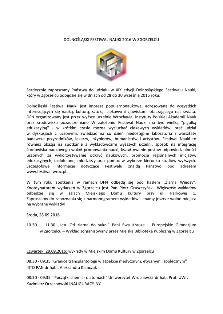 DOLNOŚLĄSKI FESTIWAL NAUKI 2016 W ZGORZELCU Serdecznie zapraszamy Państwa do udziału w XIX edycji Dolnośląskiego Festiwalu Nauki, który w Zgorzelcu odbędzie się w dniach od 28 do 30 września 2016 roku. Dolnośląski Festiwal Nauki jest imprezą popularnonaukową, adresowaną do wszystkich interesujących się nauką, kulturą, sztuką, ciekawymi zjawiskami otaczającego nas świata. DFN organizowany jest przez wyższe uczelnie Wrocławia, instytuty Polskiej Akademii Nauk oraz środowiska pozauczelniane W założeniu Festiwal Nauki ma być wielką "pigułką edukacyjną" - w krótkim czasie można wysłuchać ciekawych wykładów, brać udział w dyskusjach z uczonymi, zwiedzać na co dzień niedostępne laboratoria i warsztaty badawcze przyrodników, lekarzy, inżynierów, humanistów i artystów. Festiwal Nauki to również okazja na spotkanie z wykładowcami wyższych uczelni, sposób na integrację środowiska naukowego wokół promowania nauki, kształtowanie postaw odpowiedzialności uczonych za wykorzystywanie odkryć naukowych, promocja regionalnych inicjatyw edukacyjnych, uzdolnionej młodzieży oraz pomoc w wyborze kierunku studiów wyższych. Szczegółowe informacje dotyczące Festiwalu znajdą Państwo pod adresem www.festiwal.wroc.pl . W tym roku spotkania w ramach DFN odbędą się pod hasłem „Ziarna Wiedzy”. Koordynatorem wydarzeń w Zgorzelcu jest Pan Piotr Gruszczyński. Większość wykładów odbędzie się w salach Miejskiego Domu Kultury przy ul. Parkowej 1. Zapraszamy do zapoznania się z harmonogramem wykładów – mamy jeszcze wolne miejsca na wybrane wykłady! Środa, 28.09.2016 10.30. – 11.30 „Len. Od ziarna do sukni” Pani Ewa Krauze – Europejskie Gimnazjum w Zgorzelcu – Wykład zorganizowany przez Miejską Bibliotekę Publiczną w Zgorzelcu Czwartek, 29.09.2016: wykłady w Miejskim Domu Kultury w Zgorzelcu 08:30 - 09:35 "Granice transplantologii w aspekcie medycznym, etycznym i społecznym" IIITD PAN dr hab.. Aleksandra Klimczak 08:30 - 09:35 " Początki chemii - o atomach" Uniwersytet Wrocławski dr hab. Prof. UWr. Kazimierz Orzechowski INAUGURACYJNY 08:30 - 09:35 "Żelazne zdrowie, czyli do czego nasz organizm potrzebuje żelaza" IIiTD PAN dr Jolanta Artym 09:45 - 10:50 "Organizacja i funkcjonowanie systemu Bezpieczeństwa Narodowego" WSWL ppłk dr Zbigniew Grobelny 09:45 - 10:50 "70. rocznica zakończenia II wojny światowej - doświadczenia, wnioski i skutki" WSWL ppłk dr Krzysztof Nowacki 09:45 - 10:50 "Czy jesteś tym co jesz? Kilka słów o żywności GMO" IIiTD PAN mgr Agnieszka Szczygieł 11:10 - 11:55, 12:10 - 12:55 "Chodź pomaluj mój świat - czyli kolorowe testy w laboratorium komórkowym" IIiTD PAN mgr Agnieszka Szczygieł oraz mgr inż. Jagoda Kicielińska 11:00 - 12:05 "Kto tak mądry, że zgadnie, jaki wirus go dopadnie. Tajemnice odporności przeciwwirusowej" IIiTD PAN dr Katarzyna Zwolińska 11:00 - 12:05 "Co każdy chłopiec i każda dziewczyna powinni wiedzieć o… atakach terrorystycznych" UM prof. Dr hab. Tadeusz Dobosz 12:15 - 13:20 "Wyrwij kleszcza!... O chorobach odkleszczowych i ich zapobieganiu" IIiTD PAN dr Katarzyna Zwolińska 12:15 - 13:20 "Nowe światełka nadziei w medycynie" UM prof. Dr hab. Tadeusz Dobosz Piątek, 30.09.2016: Wykłady w Miejskim Domu Kultury 08:30 - 09:30 "Zgadnij ile mam lat? - wiek biologiczny kontra wiek kalendarzowy" UMed dr Bożena Kurc-Darak 08:30 - 09:30 "Tajemnice cmentarzysk - czyli o czym antropolog wiedzieć powinien" UMed dr Paweł Dąbrowski 08:30 - 09:35 "Ziarna wiedzy w miłości" UMed dr Zygmunt Domagała oraz dr Krystian Porwolik 09:40 - 10:45 "Elektrownia jądrowa w Polsce - dlaczego nie?" INTiBS PAN dr Piotr Psuja 09:40 - 10:45 "DNA - magiczne litery" IIiTD PAN dr Monika Chaszczewska-Markowska 09:45 - 10:50 "Cały ten cukier!" IIiTD PAN dr Marta Sochocka 10:55 - 11:40 "Świat świecącej chemii" PW dr inż. Marta Tsirigotis-Maniecka 11:00 - 12:05 "Po co nam szczepionki i czy należy ich się bać? - wakcynologia w pigułce" IIiTD PAN mgr Tomasz Tomczyk 11:00 - 12:05 "Całe życie na diecie? Nie! Żyj w zgodzie ze sobą i własnym organizmem" IIiTD PAN dr Marta Sochocka 11: 50 - 12:35 "Świat świecącej chemii" PW dr inż. Marta Tsirigotis-Maniecka 12:15 - 13:20 "Od nasionka do rośliny" PW mgr inż. Katarzyna Godlewska 12:15 - 13:20 "Historia zapisana w genach" IITD PAN mgr Paweł Łacina Wykłady w Liceum Ogólnokształcącym im. Braci Śniadeckich: 10:00 - 10:45; 11:15 - 12:00; 12:45 - 13:30 "Zbierz plony swojej wiedzy chemicznej - nie pozwól, aby były to żniwa" UWr. mgr Mateusz Janeta, mgr Damian Pasiński, mgr Magdalena Bieza Chętnych do udziału w poszczególnych wykładach prosimy o kontakt mailowy pod adresem: [email protected] z dopiskiem DFN w temacie lub telefon pod numer 75 64 92 706 w godzinach od 08.00 – 16.00. Zapraszamy! Piotr Gruszczyński Miejski Dom Kultury w Zgorzelcu Miejska Biblioteka Publiczna
