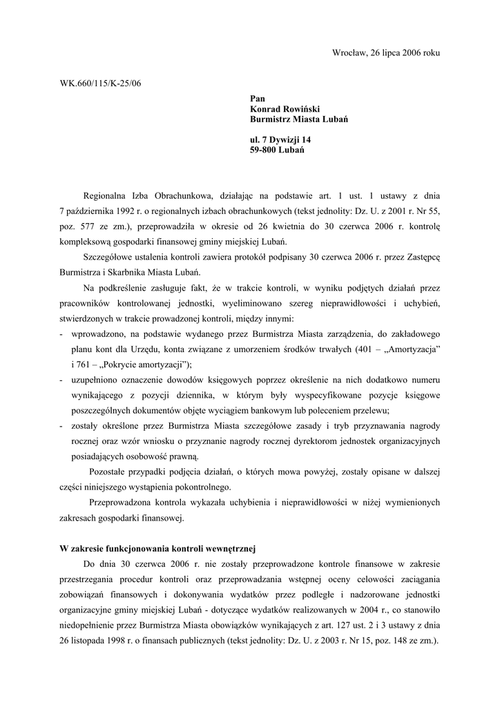 Wrocław, 26 lipca 2006 roku WK.660/115/K-25/06 Pan Konrad Rowiński Burmistrz Miasta Lubań ul. 7 Dywizji 14 59-800 Lubań Regionalna Izba Obrachunkowa, działając na podstawie art. 1 ust. 1 ustawy z dnia 7 października 1992 r. o regionalnych izbach obrachunkowych (tekst jednolity: Dz. U. z 2001 r. Nr 55, poz. 577 ze zm.), przeprowadziła w okresie od 26 kwietnia do 30 czerwca 2006 r. kontrolę kompleksową gospodarki finansowej gminy miejskiej Lubań. Szczegółowe ustalenia kontroli zawiera protokół podpisany 30 czerwca 2006 r. przez Zastępcę Burmistrza i Skarbnika Miasta Lubań. Na podkreślenie zasługuje fakt, że w trakcie kontroli, w wyniku podjętych działań przez pracowników kontrolowanej jednostki, wyeliminowano szereg nieprawidłowości i uchybień, stwierdzonych w trakcie prowadzonej kontroli, między innymi: - wprowadzono, na podstawie wydanego przez Burmistrza Miasta zarządzenia, do zakładowego planu kont dla Urzędu, konta związane z umorzeniem środków trwałych (401 – „Amortyzacja” i 761 – „Pokrycie amortyzacji”); - uzupełniono oznaczenie dowodów księgowych poprzez określenie na nich dodatkowo numeru wynikającego z pozycji dziennika, w którym były wyspecyfikowane pozycje księgowe poszczególnych dokumentów objęte wyciągiem bankowym lub poleceniem przelewu; - zostały określone przez Burmistrza Miasta szczegółowe zasady i tryb przyznawania nagrody rocznej oraz wzór wniosku o przyznanie nagrody rocznej dyrektorom jednostek organizacyjnych posiadających osobowość prawną. Pozostałe przypadki podjęcia działań, o których mowa powyżej, zostały opisane w dalszej części niniejszego wystąpienia pokontrolnego. Przeprowadzona kontrola wykazała uchybienia i nieprawidłowości w niżej wymienionych zakresach gospodarki finansowej. W zakresie funkcjonowania kontroli wewnętrznej Do dnia 30 czerwca 2006 r. nie zostały przeprowadzone kontrole finansowe w zakresie przestrzegania procedur kontroli oraz przeprowadzania wstępnej oceny celowości zaciągania zobowiązań finansowych i dokonywania wydatków przez podległe i nadzorowane jednostki organizacyjne gminy miejskiej Lubań - dotyczące wydatków realizowanych w 2004 r., co stanowiło niedopełnienie przez Burmistrza Miasta obowiązków wynikających z art. 127 ust. 2 i 3 ustawy z dnia 26 listopada 1998 r. o finansach publicznych (tekst jednolity: Dz. U. z 2003 r. Nr 15, poz. 148 ze zm.). 2 Ponadto nie został zrealizowany plan kontroli na I półrocze 2006 r., który przewidywał przeprowadzenie kontroli wydatków również za 2005 r. w 8. jednostkach organizacyjnych. Powyższa sytuacja stawia pod znakiem zapytania realność wykonania ww. planu. W zakresie rozrachunków i roszczeń Należności od odbiorców powstałe na koniec 2005 r. egzekwowano dopiero po kilku miesiącach od ich powstania, a niektórych nie wyegzekwowano do dnia kontroli. W dniu 10 stycznia 2005 r. zapłacono kwotę 427 zł za szkolenie pracownika (Consulenti Al. Quadrato we Wrocławiu), które się nie odbyło. Do dnia kontroli nie wyegzekwowano powyższej kwoty. Na koniec roku pow stała nadpłata odsetek w kwocie 56,56 zł od pożyczki w NFOŚiGW, której nie potrącono przy spłacie raty pożyczki wraz z odsetkami do 31 marca 2006 r., jak też do dnia kontroli (14.06.2006 r.). Zapłacono dwukrotnie w dniach: 17.08.2005 r. i 24.08.2005 r. kwotę 336,20 zł z tytułu umowy – zlecenia z dnia 03.06.2005 r. na przeprowadzenie wywiadów środowiskowych dla potrzeb Miejskiej Komisji Rozwiązywania Problemów Alkoholowych w Lubaniu; należność wyegzekwowano dopiero w czasie kontroli w dniu 13.06.2006 roku. Zapłacono dwukrotnie w dniach: 17.08.2005 r. i 24.08.2005 r. kwotę 226,95 zł z tytułu umowy – zlecenia z dnia 03.01.2005 r. na prowadzenie dokumentacji Miejskiej Komisji Rozwiązywania Problemów Alkoholowych w Lubaniu; należność wyegzekwowano dopiero w czasie kontroli w dniu 13.06.2006 roku. Zapłacono dwukrotnie w dniach: 17.08.2005 r. i 12.09.2005 r. kwotę 672,40 zł z tytułu umowy – zlecenia z dnia 01.03.2004 r. na doradztwo metodyczne; należność wyegzekwowano w dniach 26.04.2006 r. i 13.06.2006 roku. Zapłacono dwukrotnie w dniach: 31.08.2005 r. i 19.09.2005 r. kwotę 3.202,50 zł za fakturę z 29.04.2005 r. za podkładki pod mysz komputerową; w dniu 09.03.2006 r. uzgodniono z Firmą Abigraf saldo i potwierdzono istnienie nadpłaty, ale dopiero w dniu 26.04.2006 r. wystąpiono do tej firmy o zwrot nadpłaty (pismo nr F. 3326-038/06); powyższą kwotę wyegzekwowano w dniu 23.06.2006 roku. Kwotę należności długoterminowych (saldo Wn konta 226 „Długoterminowe należności budżetowe”) ujęto w bilansie w poz. II. „Należności krótkoterminowe, 1.5. Rozliczenia z tytułu środków na wydatki budżetowe i z tytułu dochodów budżetowych”, zamiast w poz. III. „Należności długoterminowe”. W czasie kontroli dokonano korekty bilansu, poprzez przeniesienie należności długoterminowych do odpowiedniej rubryki. Nieterminowo przeniesiono należności długoterminowe w kwocie 68.799,73 zł do należności krótkoterminowych, tj. dopiero w dniu 01.08.2005 r., zamiast najpóźniej do końca marca (termin płatności). Zaciągnięto zobowiązania na sfinansowanie wydatków w danym roku, które przekraczały ustalony plan wydatków, w związku z czym powstały zobowiązania wymagalne. Naruszono tym art. 29 ust. 6 oraz art. 132 ustawy z 26 listopada 1998 r. o finansach publicznych (tekst jednolity: Dz. U. z 2003 r. nr 15, poz. 148 ze zm.), a obecnie art. 36 ust. 1 oraz art. 193 ustawy z dnia 30 czerwca 2005 r. o finansach publicznych (Dz. U. nr 249, poz. 2104). Zobowiązania wymagalne na koniec 2005 roku stanowiły kwotę 649.948 zł, w tym kwota 477.445 zł z tytułu dostaw i usług. 3 Szereg zobowiązań na łączną kwotę 94.231 zł, które dotyczyły 2005 roku, nie uregulowano do dnia kontroli (stan na dzień 10.06.2006 r.); ale już do dnia zakończenia kontroli (stan n