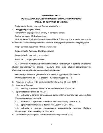 PROTOKÓŁ NR 28 POSIEDZENIA SENATU UNIWERSYTETU WARSZAWSKIEGO W DNIU 25 CZERWCA 2015 ROKU Posiedzenie Senatu otworzył Rektor Marcin Pałys. 1. Przyjęcie porządku obrad. Rektor Pałys zaproponował zmiany w porządku obrad: Dodaje się punkt 11.4.w brzmieniu: 11.4. Wniosek Wydziału Dziennikarstwa i Nauk Politycznych w sprawie utworzenia na kierunku studiów europeistyka w zakresie europejskich procesów integracyjnych: 1) specjalności dyplomacja Unii Europejskiej; 2) specjalności fundusze Unii Europejskiej; 3) specjalności marketing europejski. Punkt 12.1. otrzymuje brzmienie: 12.1. Wniosek Wydziału Dziennikarstwa i Nauk Politycznych w sprawie utworzenia studiów podyplomowych Biznes i polityka Chin oraz studiów podyplomowych Fundusze europejskie dla samorządu terytorialnego. Rektor Pałys zarządził głosowanie w sprawie przyjęcia porządku obrad. Wyniki głosowania: za – 45, przeciw – 0, wstrzymujące się – 0. 2. Przyjęcie protokołu nr 27 posiedzenia Senatu w dniu 20 maja 2015 r. 3. Informacje Rektora. 3.1. Terminy posiedzeń Senatu w roku akademickim 2015/2016. 4. Sprawozdanie Rektora za rok 2014. 4.1. Uchwała w sprawie zatwierdzenia sprawozdania finansowego Uniwersytetu Warszawskiego za rok 2014. 4.2. Informacja o wykonaniu planu rzeczowo-finansowego za rok 2014. 4.3. Sprawozdanie Rektora z działalności Uczelni w 2014 roku. 4.4. Uchwała w sprawie zatwierdzenia sprawozdania rocznego Uniwersytetu Warszawskiego w 2014 roku. 5. Uchwała w sprawie planu rzeczowo-finansowego na rok 2015. 1 Rektora 6. Wybór biegłego rewidenta. 6.1. Uchwała w sprawie wyboru biegłego rewidenta oceniającego sprawozdanie finansowe za rok 2015. 6.2. Uchwała w sprawie wyboru biegłego rewidenta oceniającego skonsolidowane sprawozdanie finansowe za rok 2015. 7. Uchwała w sprawie zmiany Statutu UW – II czytanie. 8. Uchwała w sprawie modelu zarządzania Uniwersytetem Warszawskim. 9. Uchwała w sprawie wyrażenia opinii dotyczących zatrudnienia na stanowiska profesorów: 9.1. na podstawie umowy o pracę na stanowisko profesora nadzwyczajnego na Uniwersytecie Warszawskim na czas określony: 1) dr. hab. Krzysztofa Barańskiego z Wydziału Matematyki, Informatyki i Mechaniki; 2) dr. hab. Marka Bodnara z Wydziału Matematyki, Informatyki i Mechaniki; 3) dr. hab. Jacka Kochanowskiego z Wydziału Stosowanych Nauk Społecznych i Resocjalizacji; 4) dr. hab. Krzysztofa Markowicza z Wydziału Fizyki; 5) dr hab. Renaty Matlakowskiej z Wydziału Biologii; 6) dr. hab. Piotra Mormula z Wydziału Matematyki, Informatyki i Mechaniki; 7) dr. hab. Jacka Pomykały z Wydziału Matematyki, Informatyki i Mechaniki; 8) dr hab. Marty Szulkin z Centrum Nowym Technologii UW; 9) dr hab. Agnieszki Świerczewskiej-Gwiazdy z Wydziału Matematyki, Informatyki i Mechaniki; 10) dr. hab. Andrzeja Wiercińskiego z Wydziału Pedagogicznego. 9.2. na podstawie umowy o pracę na stanowisko profesora nadzwyczajnego na Uniwersytecie Warszawskim na czas nieokreślony: 1) dr. hab. Krzysztofa Klincewicza z Wydziału Zarządzania; 2) dr hab. Katarzyny Paprzyckiej z Wydziału Filozofii i Socjologii; 3) dr. hab. Piotra Sankowskiego z Wydziału Matematyki, Informatyki i Mechaniki. 2 9.3. na podstawie mianowania na stanowisko profesora nadzwyczajnego na Uniwersytecie Warszawskim na czas nieokreślony: 1) prof. dr. hab. Roberta Konckiego z Wydziału Chemii; 2) prof. dr. hab. Andrzeja Majhofera z Wydziału Fizyki; 3) prof. dr. hab. Rafała Sicińskiego z Wydziału Chemii; 4) prof. dr hab. Magdaleny Skompskiej z Wydziału Chemii. 9.4. na podstawie mianowania na stanowisko profesora zwyczajnego na Uniwersytecie Warszawskim na czas nieokreślony: 1) prof. dr. hab. Jana Derezińskiego z Wydziału Fizyki; 2) prof. dr. hab. Jana Garlickiego z Wydziału Dziennikarstwa i Nauk Politycznych; 3) prof. dr. hab. Zbigniewa Lasocika z Wydziału Stosowanych Nauk Społecznych i Resocjalizacji; 4) prof. dr. hab. Wojciecha Niemiro z Wydziału Matematyki, Informatyki i Mechaniki; 5) prof. dr hab. Pawła Strzeleckiego z Wydziału Matematyki, Informatyki i Mechaniki. 10. Uchwała w sprawie wyrażenia opinii dotyczącej zatrudnienia na stanowisko profesora wizytującego na podstawie umowy o pracę na czas określony – dr. Krzysztofa Apta na Wydziale Matematyki, Informatyki i Mechaniki. 11. Sprawy dotyczące studiów. 11.1. Wniosek Wydziału Chemii o prowadzenie kierunku studiów zaawansowane metody instrumentalne i techniki pomiarowe. 11.1.1. Uchwała w sprawie określenia efektów kształcenia dla kierunku studiów zaawansowane metody instrumentalne i techniki pomiarowe. 11.1.2. Uchwała w sprawie prowadzenia studiów na kierunku studiów zaawansowane metody instrumentalne i techniki pomiarowe – studia inżynierskie pierwszego stopnia, stacjonarne. 11.2. Wniosek Interdyscyplinarnego Centrum Modelowania Matematycznego i Komputerowego o prowadzenie kierunku studiów inżynieria obliczeniowa. 11.2.1. Uchwała w sprawie określenia efektów kształcenia dla kierunku studiów inżynieria obliczeniowa. 3 11.2.2. Uchwała w sprawie prowadzenia studiów na kierunku studiów inżynieria obliczeniowa – studia drugiego stopnia, stacjonarne. 11.3. Wniosek Wydziału Dziennikarstwa i Nauk Politycznych w sprawie prowadzenia studiów drugiego stopnia na kierunku studiów logistyka i administrowanie w mediach. 11.3.1. Uchwała w sprawie określenia efektów kształcenia dla kierunku studiów logistyka i administrowanie w mediach. 11.3.2. Uchwała w sprawie prowadzenia studiów na kierunku studiów logistyka i administrowanie w mediach – studia drugiego stopnia, stacjonarne. 11.4. Wniosek Wydziału Dziennikarstwa i Nauk Politycznych w sprawie utworzenia na kierunku studiów europeistyka w zakresie europejskich procesów integracyjnych: 1) specjalności dyplomacja Unii Europejskiej; 2) specjalności fundusze Unii Europejskiej; 3) specjalności marketing europejski. 12. Sprawy dotyczące studiów podyplomowych. 12.1. Wniosek Wydziału Dziennikarstwa i Nauk Polityc
