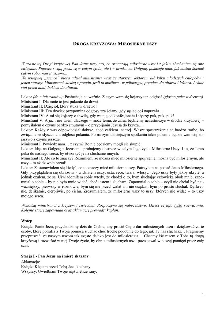 DROGA KRZYŻOWA: MIŁOSIERNE USZY W czasie tej Drogi krzyżowej Pan Jezus uczy nas, co oznaczają miłosierne uszy i z jakim słuchaniem są one związane. Poprzez swoją postawę w całym życiu, ale i w drodze na Golgotę, pokazuje nam, jak można kochać całym sobą, nawet uszami… We wstępnej „scence” biorą udział ministranci wraz ze starszym lektorem lub kilku młodszych chłopców i jeden starszy. Ministranci siedzą z przodu, jeśli to możliwe - w półokręgu, przodem do ołtarza i lektora. Lektor stoi przed nimi, bokiem do ołtarza. Lektor (do ministrantów): Posłuchajcie uważnie. Z czym wam się kojarzy ten odgłos? (głośno puka w drewno) Ministrant I: Dla mnie to jest pukanie do drzwi. Ministrant II: Dzięcioł, który stuka w drzewo! Ministrant III: Ten dźwięk przypomina odgłosy zza ściany, gdy sąsiad coś naprawia… Ministrant IV: A mi się kojarzy z chwilą, gdy wstaję od konfesjonału i słyszę: puk, puk, puk! Ministrant V: A ja… nie wiem dlaczego – może temu, że zaraz będziemy uczestniczyć w drodze krzyżowej – pomyślałem o czymś bardzo smutnym – o przybijaniu Jezusa do krzyża… Lektor: Każdy z was odpowiedział dobrze, choć całkiem inaczej. Wasze spostrzeżenia są bardzo trafne, bo związane ze słyszeniem odgłosu pukania. Po naszym dzisiejszym spotkaniu takie pukanie będzie wam się kojarzyło z czymś jeszcze. Ministrant I: Powiedz nam… z czym? Bo nie będziemy mogli się skupić! Lektor: Idąc na Golgotę z Jezusem, spróbujemy dostrzec w całym Jego życiu Miłosierne Uszy. I to, że Jezus puka do naszego serca, by otworzyć je na słuchanie innych. Ministrant II: Ale co to znaczy? Rozumiem, że można mieć miłosierne spojrzenie, można być miłosiernym, ale uszy – to aż dziwnie brzmi! Lektor: Zastanawiałem się kiedyś, co to znaczy mieć miłosierne uszy. Patrzyłem na postać Jezus Miłosiernego. Gdy przyglądałem się obrazowi - widziałem oczy, usta, ręce, twarz, włosy… Jego uszy były jakby ukryte, a jednak czułem, że są. Uświadomiłem sobie wtedy, że chodzi o to, bym słuchając człowieka obok mnie, zapomniał o sobie – by nie było mnie widać, choć jestem i słucham. Zapomniał o sobie – czyli nie chciał być najważniejszy, pierwszy w rozmowie, bym się nie przechwalał ani nie osądzał, bym po prostu słuchał. Dyskretnie, delikatnie, cierpliwie, po cichu. Zrozumiałem, że miłosierne uszy to uszy, których nie widać – to uszy mojego serca. Wchodzą ministranci z krzyżem i świecami. Rozpoczyna się nabożeństwo. Dzieci czytają tylko rozważania. Kolejne stacje zapowiada oraz aklamację prowadzi kapłan. Wstęp Ksiądz: Panie Jezu, przychodzimy dziś do Ciebie, aby prosić Cię o dar miłosiernych uszu i dziękować za te osoby, które potrafią z Twoją pomocą słuchać choć trochę podobnie do tego, jak Ty nas słuchasz… Pragniemy przepraszać, że naszym uszom tak często daleko jest do miłosierdzia… Chcemy iść razem z Tobą tą drogą krzyżową i rozważać w niej Twoje życie, by obraz miłosiernych uszu pozostawał w naszej pamięci przez cały czas. Stacja I - Pan Jezus na śmierć skazany Aklamacja: Ksiądz: Klękam przed Tobą Jezu kochany, Wszyscy: Uwielbiam Twoje najświętsze rany. 1 Śpiew: Jezu, by Cię spotkać przychodzę z tłumami, Ty nas słuchasz, darzysz wszelkimi łaskami I klękam po cichu, grzech me serce kruszy. Wiem, że słyszysz, szepcę: …Miłosierne Uszy. Dziecko I: Panie Jezu, słyszysz wyrok. Niesprawiedliwy, okrutny wyrok. Nie buntujesz się, choć jesteś niewinny. Nie krzyczysz, nie protestujesz, nie walczysz o swoje. Wysłuchujesz słowa oskarżenia i milczysz. Twoje uszy już wybaczyły, bo Ty jesteś Miłością - nawet dla tych, którzy Cię krzywdzą. Patrzę na Twój obraz, Jezu. Wiem, że mnie słuchasz. Wiem też, że Ty jesteś w każdym człowieku, którego spotykam. I wiem, że tyle razy nie chciałem słuchać Ciebie w moim bliźnim… Dziecko II: Panie Jezu, przepraszam Cię, że nie umiem wybaczać, gdy słyszę czyjeś oskarżenia. Wszyscy powtarzają modlitwę. Wszyscy: Któryś za nas cierpiał rany… Stacja II – Pan Jezus bierze krzyż na swoje ramiona K: Klękam przed Tobą Jezu kochany, W: Uwielbiam Twoje najświętsze rany. Śpiew: Jezu, by Cię spotkać przychodzę z tłumami … Dziecko I: Panie Jezu, posłusznie bierzesz krzyż i nie gniewasz się na tych, którzy się śmieją i szydzą z Ciebie. Mówią o Tobie nieprawdziwe rzeczy i nie interesuje ich to, kim jesteś. A ja tak często się złoszczę, gdy się dowiaduję, że ktoś o mnie coś powiedział… Tak trudno mi o tym zapomnieć… Dziecko II: Panie Jezu, przepraszam, że nie umiem wybaczać, gdy ktoś plotkuje na mój temat. Wszyscy powtarzają modlitwę. Wszyscy: Któryś za nas cierpiał rany… Stacja III – Pan Jezus upada pod krzyżem po raz pierwszy K: Klękam przed Tobą Jezu kochany, W: Uwielbiam Twoje najświętsze rany. Śpiew: Jezu, by Cię spotkać przychodzę z tłumami … Dziecko I: Panie Jezu, ciężar krzyża przygniótł Cię i upadłeś. I znów ludzie drwią z Ciebie, a Ty słuchasz ich w milczeniu i nie oceniasz. Ja upadam często pod ciężarem słów moich kolegów, którzy niesłusznie zrzucają na mnie winę. Mam ochotę wtedy sam się z nimi rozprawić, osądzić ich i ukarać. Ale Ty nie tego mnie uczysz… Ty chcesz, by moje uszy były miłosierne, jak Twoje. Dziecko II: Panie Jezu, przepraszam, że tak często oceniam i osądzam. Wszyscy powtarzają modlitwę. Wszyscy: Któryś za nas cierpiał rany… Stacja IV – Pan Jezus spotyka swoją Matkę K: Klękam przed Tobą Jezu kochany, W: Uwielbiam Twoje najświętsze rany. Śpiew: Jezu, by Cię spotkać przychodzę z tłumami … Dziecko I: Panie Jezu, tu stoi Twoja Mama. Nie wiem, czy coś mówi, chyba nie musi nic mówić… Słuchałeś jej całe życie i na pewno wiesz, co chciałaby Ci teraz powiedzieć. Ona też całe życie Ciebie słuchała i dlatego nawet 