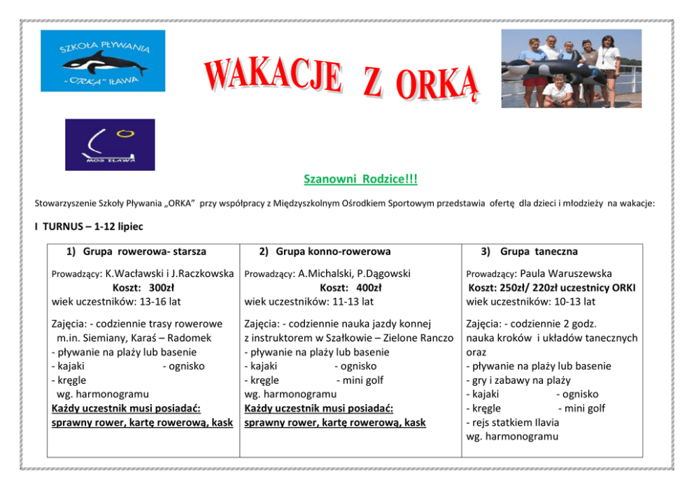 Szanowni Rodzice!!! Stowarzyszenie Szkoły Pływania „ORKA” przy współpracy z Międzyszkolnym Ośrodkiem Sportowym przedstawia ofertę dla dzieci i młodzieży na wakacje: I TURNUS – 1-12 lipiec 1) Grupa rowerowa- starsza 2) Grupa konno-rowerowa 3) Grupa taneczna Prowadzący: K.Wacławski i J.Raczkowska Prowadzący: A.Michalski, P.Dągowski Prowadzący: Paula Waruszewska Koszt: 300zł wiek uczestników: 13-16 lat Koszt: 400zł wiek uczestników: 11-13 lat Koszt: 250zł/ 220zł uczestnicy ORKI wiek uczestników: 10-13 lat Zajęcia: - codziennie trasy rowerowe m.in. Siemiany, Karaś – Radomek - pływanie na plaży lub basenie - kajaki - ognisko - kręgle wg. harmonogramu Każdy uczestnik musi posiadać: sprawny rower, kartę rowerową, kask Zajęcia: - codziennie nauka jazdy konnej z instruktorem w Szałkowie – Zielone Ranczo - pływanie na plaży lub basenie - kajaki - ognisko - kręgle - mini golf wg. harmonogramu Każdy uczestnik musi posiadać: sprawny rower, kartę rowerową, kask Zajęcia: - codziennie 2 godz. nauka kroków i układów tanecznych oraz - pływanie na plaży lub basenie - gry i zabawy na plaży - kajaki - ognisko - kręgle - mini golf - rejs statkiem Ilavia wg. harmonogramu 4) Grupa plastyczna 5) Grupa sportowa 6) Grupa młodsza Prowadzący: Agata Topolewska Prowadzący: Agnieszka Jaskulska Prowadzący: Justyna Lewandowska Koszt: 230zł/ 210zł uczestnicy ORKI wiek uczestników: 8-13 lat Koszt: 220zł/ 200zł uczestnicy ORKI wiek uczestników: 10- 12 lat Koszt: 220zł/ 200zł uczestnicy ORKI wiek uczestników: 7-9 lat Zajęcia: - codziennie 2 godz. warsztaty plastyczne oraz - pływanie na plaży lub basenie - gry i zabawy na plaży - kajaki - ognisko - kręgle - mini golf - rejs statkiem Ilavia wg. harmonogramu Zajęcia: - codziennie 2 godz. gry i zabawy sportowe oraz - pływanie na plaży lub basenie - gry i zabawy na plaży - kajaki - ognisko - kręgle - mini golf - rejs statkiem Ilavia wg. harmonogramu Zajęcia: - codziennie 2 godz. zajęcia świetlicowe oraz - pływanie na plaży lub basenie - gry i zabawy na plaży - ognisko - kręgle - mini golf - rejs statkiem Ilavia wg. harmonogramu II TURNUS – 15-26 lipiec 1) Grupa rowerowa 2) Grupa konna - młodsza 3) Grupa taneczna Prowadzący: B.Matysiak i J.Raczkowska Prowadzący: Aurelia Waruszewska Prowadzący: Paula Waruszewska Koszt: 300zł wiek uczestników: 11-13 lat Koszt: 400zł wiek uczestników: 8-11 lat Koszt: 250zł/ 220zł uczestnicy ORKI wiek uczestników: 6-7 lat Zajęcia: - codziennie jazda rowerem m.in. Radomek, Szałkowo, Iława - pływanie na plaży lub basenie - kajaki - kręgle - 1x zajęcia na kortach tenisowych wg. harmonogramu Każdy uczestnik musi posiadać: sprawny rower, kartę rowerową, kask Zajęcia: - codziennie nauka jazdy konnej z instruktorem w Szałkowie – Zielone Ranczo - pływanie na plaży lub basenie - gry i zabawy - ognisko - kręgle - mini golf - rejs statkiem Ilavia wg. harmonogramu Dojazd busem Zajęcia: - codziennie 2 godz. nauka kroków i układów tanecznych oraz - pływanie na plaży lub basenie - gry i zabawy na plaży - kajaki - ognisko - kręgle - mini golf - rejs statkiem Ilavia - - 1x zajęcia na kortach tenisowych wg. harmonogramu 4) Grupa sportowa 5) Grupa fotograficzna Koszt: 220zł/ 200zł uczestnicy ORKI wiek uczestników: 10- 12 lat Prowadzący: Agata Topolewska Koszt: 240zł/220zł uczestnicy ORKI wiek uczestników: 9-13 lat Zajęcia: - codziennie 2 godz. gry i zabawy sportowe oraz - pływanie na plaży lub basenie - gry i zabawy na plaży - kajaki - ognisko - kręgle - mini golf - rejs statkiem Ilavia wg. harmonogramu Zajęcia: - codziennie 2 godz. Zajęć fotograficznych oraz - pływanie na plaży lub basenie - gry i zabawy na plaży - kajaki - ognisko - kręgle - mini golf - rejs statkiem Ilavia wg. harmonogramu TRZEBA MIEĆ SWÓJ APARAT FOTOGRAFICZNY DOWOLNEGO TYPU Prowadzący: Katarzyna Zalewska III TURNUS - 29 lipiec- 9 sierpień 1) Grupa rowerowa 2) Grupa konno-rowerowa 3) Grupa taneczna Koszt: 300zł wiek uczestników: 11-13 lat Prowadzący: Patryk Dągowski Prowadzący: Paula Waruszewska Koszt: 400zł wiek uczestników: 11-13 lat Koszt: 250zł/ 220zł uczestnicy ORKI wiek uczestników: 7-9 lat Zajęcia: - codziennie jazda rowerem m.in. Radomek, Szałkowo, Iława - pływanie na plaży lub basenie - kajaki - kręgle - 1x zajęcia na kortach tenisowych wg. harmonogramu Każdy uczestnik musi posiadać: sprawny rower, kartę rowerową, kask Zajęcia: - codziennie nauka jazdy konnej z instruktorem w Szałkowie – Zielone Ranczo - pływanie na plaży lub basenie - kajaki - ognisko - kręgle - mini golf wg. harmonogramu Każdy uczestnik musi posiadać: sprawny rower, kartę rowerową, kask Zajęcia: - codziennie 2 godz. nauka kroków i układów tanecznych oraz - pływanie na plaży lub basenie - gry i zabawy na plaży - kajaki - ognisko - kręgle - mini golf - rejs statkiem Ilavia - - 1x zajęcia na kortach tenisowych wg. harmonogramu Prowadzący: B.Matysiak i J. Raczkowska 4) Grupa plastyczna Prowadzący: Agata Topolewska 5) Grupa sportowa Prowadzący: Agnieszka Jaskulska 6) Grupa siatkarska Prowadzący: Beata Zielska Koszt: 220zł/ 200zł uczestnicy ORKI Koszt: 230zł/ 210zł uczestnicy ORKI wiek uczestników: 8-13 lat wiek uczestników: 10- 12 lat Koszt: 220/200zł uczestnicy ORKI wiek uczestników: 9-12 lat Zajęcia: - codziennie 2 godz. Warsztaty plastyczne oraz - pływanie na plaży lub basenie - gry i zabawy na plaży - kajaki - ognisko - kręgle - mini golf - rejs statkiem Ilavia wg. harmonogramu Zajęcia: - codziennie 2 godz. siatkówka oraz - pływanie na plaży lub basenie - gry i zabawy - ognisko - kręgle - mini golf - rejs statkiem Ilavia - 1x zajęcia na kortach tenisowych wg. harmonogramu Zajęcia: - codziennie 2 godz. gry i zabawy sportowe oraz - pływanie na plaży lub basenie - 1x zajęcia na kortach tenisowych - kajaki - ognisko - kręgle - mini golf - rejs statkiem Ilavia wg. harmonogramu ZAPISY ZAPISY ZAPISY Zapisów należy
