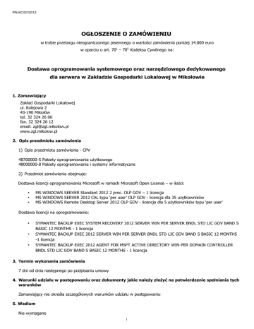 PN-KC/07/2012 OGŁOSZENIE O ZAMÓWIENIU w trybie przetargu nieograniczonego pisemnego o wartości zamówienia poniżej 14.000 euro w oparciu o art. 701 – 705 Kodeksu Cywilnego na: Dostawa oprogramowania systemowego oraz narzędziowego dedykowanego dla serwera w Zakładzie Gospodarki Lokalowej w Mikołowie 1. Zamawiający Zakład Gospodarki Lokalowej ul. Kolejowa 2 43-190 Mikołów tel. 32 324 26 00 fax. 32 324 26 12 email: [email protected] www.zgl.mikolow.pl 2. Opis przedmiotu zamówienia 1) Opis przedmiotu zamówienia - CPV 48700000-5 Pakiety oprogramowania użytkowego 48000000-8 Pakiety oprogramowania i systemy informatyczne 2) Przedmiot zamówienia obejmuje: Dostawa licencji oprogramowania Microsoft w ramach Microsoft Open License – w ilości: • • • MS WINDOWS SERVER Standard 2012 2 proc. OLP GOV – 1 licencja MS WINDOWS SERVER 2012 CAL typu ‘per user’ OLP GOV - licencja dla 35 użytkowników MS WINDOWS Remote Desktop Server 2012 OLP GOV - licencja dla 5 użytkowników typu ‘per user’ Dostawa licencji na oprogramowanie: • • • SYMANTEC BACKUP EXEC SYSTEM RECOVERY 2012 SERVER WIN PER SERVER BNDL STD LIC GOV BAND S BASIC 12 MONTHS - 1 licencja SYMANTEC BACKUP EXEC 2012 SERVER WIN PER SERVER BNDL STD LIC GOV BAND S BASIC 12 MONTHS -1 licencja SYMANTEC BACKUP EXEC 2012 AGENT FOR MSFT ACTIVE DIRECTORY WIN PER DOMAIN CONTROLLER BNDL STD LIC GOV BAND S BASIC 12 MONTHS - 1 licencja 3. Termin wykonania zamówienia 7 dni od dnia następnego po podpisaniu umowy 4. Warunki udziału w postępowaniu oraz dokumenty jakie należy złożyć na potwierdzenie spełniania tych warunków Zamawiający nie określa szczegółowych warunków udziału w postępowaniu 5. Wadium Nie wymagane 1 PN-KC/07/2012 6. Kryteria oceny ofert i ich znaczenie Cena - waga 100% 7. Sposób przygotowania ofert 1) Wielkość i układ załączonych do siwz wzorcowych formularzy może zostać przez wykonawcę zmieniona, jednak ich treść musi zostać zachowana. 2) Sposób przygotowania oferty: a) oferta musi być przygotowana pisemnie w języku polskim; b) zaleca się aby wszystkie kartki oferty wraz z dodatkami były ponumerowane i złączone w sposób uniemożliwiający wysunięcie się którejkolwiek kartki; c) poprawka w ofercie musi być podpisana lub parafowana przez osobę/y upoważnioną/e do podpisywania oferty (w przeciwnym wypadku nie będą one uwzględniane); błędny zapis musi zostać poprawiony poprzez przekreślenie pozwalające na zapoznanie się z pierwotną treścią; d) zamawiający nie wyraża zgody na poprawianie kwoty występującej w ofercie; e) wykonawca może złożyć tylko jedną ofertę; f) oferta musi być złożona zamawiającemu w zaklejonej i nienaruszonej kopercie oznaczonej w następujący sposób: ............................................ (nazwa wykonawcy) ............................................ (adres i tel. wykonawcy) Oferta na: „Dostawa oprogramowania systemowego oraz narzędziowego dedykowanego dla serwera w Zakładzie Gospodarki Lokalowej w Mikołowie” Nie otwierać przed terminem otwarcia ofert, tj. 12.11.2012 r. 3) Oferta musi zawierać co najmniej: a) formularz ofertowy b) aktualny odpis z właściwego rejestru, jeżeli odrębne przepisy wymagają wpisu do rejestru, wystawiony nie wcześniej niż 6 miesięcy przed upływem terminu składania ofert 4) Koszty opracowania i dostarczenia oferty oraz uczestnictwa w przetargu obciążają wyłącznie wykonawcę. 5) Wszelkie dołączone dokumenty wraz z wymaganymi dodatkami muszą być wypełnione, a następnie podpisane przez osobę/y uprawnioną/e do składania oświadczeń woli w imieniu wykonawcy. Za osoby uprawnione do składania oświadczeń woli w imieniu wykonawcy uznaje się: a) osoby wykazane w prowadzonych przez sądy rejestrach handlowych, rejestrach spółdzielni lub rejestrach przedsiębiorstw państwowych, b) osoby wykazane w ewidencji działalności gospodarczej, c) osoby legitymujące się odpowiednim pełnomocnictwem udzielonym przez osoby, o których mowa w pkt. 5a i b. W przypadku podpisania oferty przez pełnomocnika, pełnomocnictwo musi być dołączone do oferty w formie oryginału lub notarialnie potwierdzonej kopii, lub kopii potwierdzonej za zgodność z oryginałem przez mocodawcę. W przypadku gdy wykonawca jako załącznik do oferty dołączy kopię jakiegoś dokumentu, kopia ta musi być potwierdzona za zgodność z oryginałem przez osobę/y upoważnioną/e do składania oświadczenia woli w imieniu wykonawcy. 6) Cenę oferty należy podać w formie ryczałtu przy zachowaniu następujących założeń: a) cenę w oparciu o opis przedmiotu zamówienia b) cena ta musi zawierać wszystkie koszty związane z realizacją zadania 7) Cena musi być podana w złotych polskich cyfrowo i słownie, z dokładnością do dwóch miejsc po przecinku. Jeżeli wystąpi rozbieżność pomiędzy wartością wyrażoną cyfrowo, a podana słownie, to jako właściwa zostanie przyjęta wartość podana słownie. 2 PN-KC/07/2012 8. Miejsce i termin składania ofert Miejsce: siedziba ZGL-u pokój nr 202 – sekretariat Termin składania ofert: 12.11.2012 r. Godzina 900 9. Miejsce i termin otwarcia ofert Miejsce: siedziba ZGL-u, pokój nr 210 Termin otwarcia ofert: 12.11.2012 r. godzina 905 10. Informacje organizacyjne Zamawiający upoważnia do bezpośredniego kontaktowania się z wykonawcami i udzielania wyjaśnień pod kątem: - formalno-prawnym: Michał Kuszka, pokój nr 201, tel. (32) 324 26 11 Umowa zostanie zawarta na warunkach zgodnych z załączonym wzorem. 11. Zamawiający zastrzega możliwość zamknięcia przetargu bez wyboru oferty przez Zamawiającego na każdym etapie postępowania, bez podania przyczyny. 3