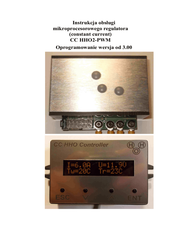 Instrukcja obsługi mikroprocesorowego regulatora (constant current) CC HHO2-PWM Oprogramowanie wersja od 3.00 Instrukcja obsługi sterownika CC HHO2-PWM Spis treści: 1 Przeznaczenie ............................................................................................................. 3 2 Parametry regulatora .................................................................................................. 5 3 Stany alarmowe .......................................................................................................... 5 4 Uwagi montażowe...................................................................................................... 7 5 4.1 Moduł wykonawczy ........................................................................................... 7 4.2 Moduł LCD ........................................................................................................ 7 4.3 Okablowanie - zalecenia .................................................................................... 9 Menu......................................................................................................................... 10 5.1 Ekran główny ................................................................................................... 10 5.2 Menu – 1.Tryb regulatora prądu ...................................................................... 11 5.3 Menu – 2.Tryb pracy........................................................................................ 13 5.4 Menu – 3.Ustawiania wejścia analogowego .................................................... 13 5.5 Menu – 4.Ustawianie temperatury wody ......................................................... 15 5.6 Menu – 5.Ustawianie częstotliwości................................................................ 15 5.7 Menu – 6.Ustawienia fabryczne....................................................................... 16 6 Procedura dobierania stężenia roztworu elektrolitu ................................................. 17 7 Fabryczne i zalecane ustawienia poziomów alarmowych........................................ 18 8 Sposób wejścia do menu serwisowego .................................................................... 19 9 Warunki gwarancji ................................................................................................... 19 Konstruktor i producent: Jerzy Hetmański Telefon: +48 603 781 110 Email: [email protected] rev. 2 z 2013-09-11 2 / 21 Instrukcja obsługi sterownika CC HHO2-PWM 1 PRZEZNACZENIE Urządzenie jest przeznaczone do regulacji prądu zwłaszcza w układach suchych i mokrych cel do wytwarzania HHO. Umożliwia ustawienie stałego prądu (źródło prądu) niezależnego od napięcia (w dużym zakresie napięcia zasilania). Regulator przeznaczony jest do regulowania prądu w celach o odległościach między elektrodami ≥1.8 mm (przekładka izolacyjna o grubości ≥2mm). Montaż kabli do zacisków śrubowych należy wykonać używając specjalnych końcówek oczkowych pod śrubę M5, które powinny być dostosowane do średnicy przewodu. Końcówki te należy zacisnąć odpowiednim narzędziem do montażu końcówek oczkowych na przewodzie. Można też zalutować połączenie. Po dokręceniu kabli do złącza, dobrze jest zabezpieczyć śruby wazeliną techniczną. Zalecam stosowanie następujących końcówek oczkowych: Producentem są firmy KLAUKE lub NINGI. Są one dostępne w wielu sklepach z osprzętem elektrycznym, sklepach z częściami do samochodów oraz sklepach car-audio. Można je dostać też w sklepach internetowych takich jak TME. Nie stosować końcówek mosiężnych o prostokątnym kształcie. rev. 2 z 2013-09-11 3 / 21 Instrukcja obsługi sterownika CC HHO2-PWM (-) Minus zasilania (z akumulatora). Końcówka od spodu. (+) Plus zasilania (z akumulatora). Końcówka na wierzchu. (+) Plus do celi . Końcówka na wierzchu. (-) Minus do celi. Końcówka od spodu. Minusy przykręcić od spodu Plusy przykręcić z wierzchu. Rys. 1. Opis głównych zacisków rev. 2 z 2013-09-11 4 / 21 Instrukcja obsługi sterownika CC HHO2-PWM 2 PARAMETRY REGULATORA Zakres dopuszczalnego napięcia zasilania to: 8…32V. Zakres napięć pracy: 9…30V Prąd stabilizowany: 1…40A (zalecane nie więcej niż 35A; powyżej 25A niezbędne jest, aby sterownik zamontować w przewiewnym miejscu np. w pobliżu wentylatora chłodnicy lub domontować zewnętrzny wentylator ewentualnie domontować dodatkowy radiator zewnętrzny). Regulacja prądu: 1) z klawiatury: co 1A 2) z wejścia analogowego: co 0.1A Typ regulatora: PI Częstotliwość: 40 Hz ….50kHz regulowana ze skokiem 10Hz (nie zalecam ustawiania częstotliwości mniejszej niż 2000Hz; zalecana 24000Hz ) W skład regulatora wchodzą następujące obwody: - pomiaru prądu celi - regulatora cyfrowego PI - pomiaru napięcia baterii - pomiaru napięcia analogowego - pomiaru temperatur - detektora poziomu elektrolitu - sterowania wyświetlaczem LCD - złącza RS232 3 STANY ALARMOWE Regulator nadzoruje cztery główne parametry systemu: napięcie akumulatora, temperaturę wody, temperaturę kondensatorów i temperaturę głównego tranzystora regulującego. Na podstawie ciągłego pomiaru tych parametrów, generowany jest stan alarmowy. Objawia się on krótkim sygnałem dźwiękowym powtarzanym, co ok. 0.5 sekundy. Przekroczenie pierwszego poziomu stanu alarmowego dla temperatur (TwL, TrL, TcL), powoduje stopniowe zmniejszanie prądu wraz ze wzrostem temperatury. Gdy temperatura przekroczy wartość maksymalną (TwH, TrH, TcH), nastąpi wyłączenie regulatora (prąd wyjściowy równy jest zeru). Po ostygnięciu do temperatury minimalnej (TwL, TrL, TcL) następuje ponowne samoczynne załączenie prądu. W przypadku napięcia, jeśli w punkcie 2) menu jest ustawiony tryb „auto”, prąd jest natychmiast wyłączany, gdy spadnie ono poniżej wartości minimalnej UbL, a ponowne załączenie nastąpi po przekroczeniu wartości UbH. Nale
