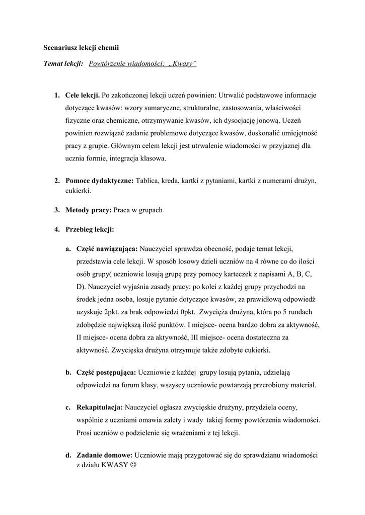 Scenariusz lekcji chemii Temat lekcji: Powtórzenie wiadomości: „Kwasy” 1. Cele lekcji. Po zakończonej lekcji uczeń powinien: Utrwalić podstawowe informacje dotyczące kwasów: wzory sumaryczne, strukturalne, zastosowania, właściwości fizyczne oraz chemiczne, otrzymywanie kwasów, ich dysocjację jonową. Uczeń powinien rozwiązać zadanie problemowe dotyczące kwasów, doskonalić umiejętność pracy z grupie. Głównym celem lekcji jest utrwalenie wiadomości w przyjaznej dla ucznia formie, integracja klasowa. 2. Pomoce dydaktyczne: Tablica, kreda, kartki z pytaniami, kartki z numerami drużyn, cukierki. 3. Metody pracy: Praca w grupach 4. Przebieg lekcji: a. Część nawiązująca: Nauczyciel sprawdza obecność, podaje temat lekcji, przedstawia cele lekcji. W sposób losowy dzieli uczniów na 4 równe co do ilości osób grupy( uczniowie losują grupę przy pomocy karteczek z napisami A, B, C, D). Nauczyciel wyjaśnia zasady pracy: po kolei z każdej grupy przychodzi na środek jedna osoba, losuje pytanie dotyczące kwasów, za prawidłową odpowiedź uzyskuje 2pkt. za brak odpowiedzi 0pkt. Zwycięża drużyna, która po 5 rundach zdobędzie największą ilość punktów. I miejsce- ocena bardzo dobra za aktywność, II miejsce- ocena dobra za aktywność, III miejsce- ocena dostateczna za aktywność. Zwycięska drużyna otrzymuje także zdobyte cukierki. b. Część postępująca: Uczniowie z każdej grupy losują pytania, udzielają odpowiedzi na forum klasy, wszyscy uczniowie powtarzają przerobiony materiał. c. Rekapitulacja: Nauczyciel ogłasza zwycięskie drużyny, przydziela oceny, wspólnie z uczniami omawia zalety i wady takiej formy powtórzenia wiadomości. Prosi uczniów o podzielenie się wrażeniami z tej lekcji. d. Zadanie domowe: Uczniowie mają przygotować się do sprawdzianu wiadomości z działu KWASY Zestaw pytań: 1. Podaj jakie dwa wskaźniki wykryją kwas, podaj barwę tych wskaźników w roztworach kwasów? 2. Narysuj wzór strukturalny, podaj nazwę kwasu o wzorze sumarycznym H2SO4 3. Policz masę cząsteczkowa, podaj nazwę kwasu o wzorze sumarycznym H2CO3 4. BONUS: TY I TWOJA DRUŻYNA OTRZYMUJECIE DWA PUNKTY ZA DARMO 5. Zapisz dysocjacje jonową kwasu siarkowodorowego H2S 6. Chemik pracując z kwasem azotowym(V) zauważył żółte plamy na dłoniach gdyż przez nieuwagę nie założył rękawiczek. Podaj przyczynę tego zjawiska, oraz nazwę reakcji, która zaszła na dłoniach chemika? 7. Omów(szczegółowo) poprawny sposób rozcieńczania kwasu 8. BONUS: Ty i Twoja drużyna otrzyma dwa punkty jeśli zaśpiewasz fragment piosenki z kolorem w słowach utworu 9. Zapisz otrzymywanie kwasu siarkowego(VI). Wskaż tlenek kwasowy w podanym równaniu? 10. O jakim kwasie mowa: kwas tlenowy, nietrwały, bakteriobójczy, owadobójczy, grzybobójczy, ciecz, bezbarwna. Podaj nazwę oraz wzór sumaryczny tego kwasu? 11. O jakim kwasie mowa: gęsta, oleista, ciecz, higroskopijna, zwęgla cukier oraz inne substancje organiczne. Podaj wzór sumaryczny oraz nazwę tego kwasu? 12. 3H+ + PO43- w wyniku dysocjacji którego kwasu można otrzymać podane produkty. Podaj jego nazwę oraz wzór sumaryczny? 13. BONUS: Ty i Twoja drużyna otrzymacie dwa punkty jeśli odgadniecie podane hasło(kalambury) TOPIENIE MARZANNY 14. Dobierz współczynniki stechiometryczne w podanym równaniu otrzymywania kwasu, jaki to kwas: N2O5 + H2O ⥴ HNO3 15. Ten kwas służy do produkcji coli, galaretki, preparatów stomatologicznych. Jaki to kwas, narysuj jego wzór strukturalny? 16. Omów właściwości fizyczne oraz zastosowanie kwasu chlorowodorowego? Opracowanie: mgr Bernadeta Kita- nauczyciel chemii