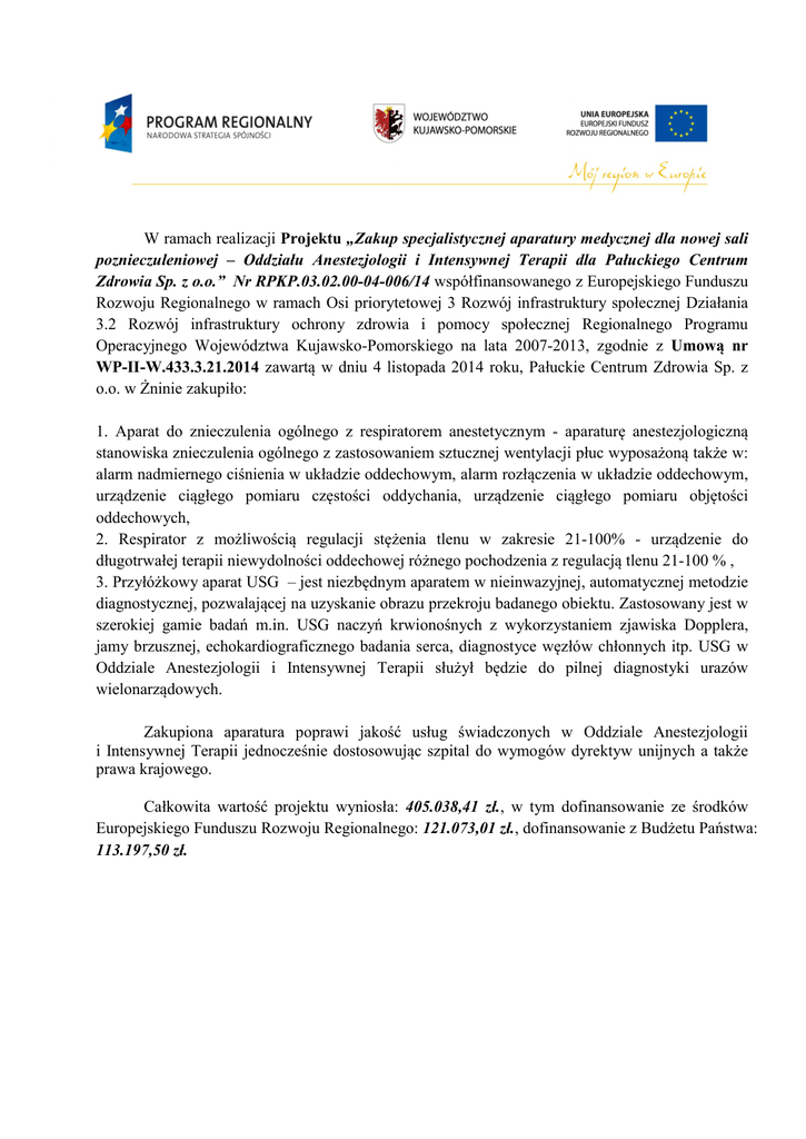 W ramach realizacji Projektu „Zakup specjalistycznej aparatury medycznej dla nowej sali poznieczuleniowej – Oddziału Anestezjologii i Intensywnej Terapii dla Pałuckiego Centrum Zdrowia Sp. z o.o.” Nr RPKP.03.02.00-04-006/14 współfinansowanego z Europejskiego Funduszu Rozwoju Regionalnego w ramach Osi priorytetowej 3 Rozwój infrastruktury społecznej Działania 3.2 Rozwój infrastruktury ochrony zdrowia i pomocy społecznej Regionalnego Programu Operacyjnego Województwa Kujawsko-Pomorskiego na lata 2007-2013, zgodnie z Umową nr WP-II-W.433.3.21.2014 zawartą w dniu 4 listopada 2014 roku, Pałuckie Centrum Zdrowia Sp. z o.o. w Żninie zakupiło: 1. Aparat do znieczulenia ogólnego z respiratorem anestetycznym - aparaturę anestezjologiczną stanowiska znieczulenia ogólnego z zastosowaniem sztucznej wentylacji płuc wyposażoną także w: alarm nadmiernego ciśnienia w układzie oddechowym, alarm rozłączenia w układzie oddechowym, urządzenie ciągłego pomiaru częstości oddychania, urządzenie ciągłego pomiaru objętości oddechowych, 2. Respirator z możliwością regulacji stężenia tlenu w zakresie 21-100% - urządzenie do długotrwałej terapii niewydolności oddechowej różnego pochodzenia z regulacją tlenu 21-100 % , 3. Przyłóżkowy aparat USG – jest niezbędnym aparatem w nieinwazyjnej, automatycznej metodzie diagnostycznej, pozwalającej na uzyskanie obrazu przekroju badanego obiektu. Zastosowany jest w szerokiej gamie badań m.in. USG naczyń krwionośnych z wykorzystaniem zjawiska Dopplera, jamy brzusznej, echokardiograficznego badania serca, diagnostyce węzłów chłonnych itp. USG w Oddziale Anestezjologii i Intensywnej Terapii służył będzie do pilnej diagnostyki urazów wielonarządowych. Zakupiona aparatura poprawi jakość usług świadczonych w Oddziale Anestezjologii i Intensywnej Terapii jednocześnie dostosowując szpital do wymogów dyrektyw unijnych a także prawa krajowego. Całkowita wartość projektu wyniosła: 405.038,41 zł., w tym dofinansowanie ze środków Europejskiego Funduszu Rozwoju Regionalnego: 121.073,01 zł., dofinansowanie z Budżetu Państwa: 113.197,50 zł.