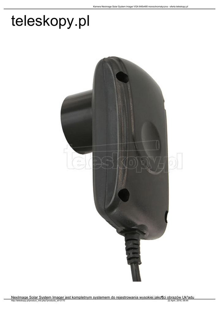 Kamera Neximage Solar System Imager VGA 640x480 monochromatyczna - oferta teleskopy.pl teleskopy.pl NexImage Solar System Imager jest kompletnym systemem do rejestrowania wysokiej jako¶ci obrazów Uk³adu http://teleskopy.pl/product_info.php?products_id=3770 22 April, 2016, 06:44 Kamera Neximage Solar System Imager VGA 640x480 monochromatyczna - oferta teleskopy.pl S³onecznego. Du¿a czu³o¶æ i wierne odwzorowanie kolorów to podstawowe cechy kamery oferowanej w zestawie. W po³±czeniu z oprogramowaniem Registax, które znajduje siê w komplecie, NexImage wydobywa ogromn± ilo¶æ szczegó³ów. Oprogramowanie automatycznie filtruje sygna³ video pozostawiaj±c tylko najostrzejsze i najczy¶ciejsze klatki filmu by z³o¿yæ je w jeden wysokiej jako¶ci obraz. £atwy w obs³udze program oraz przyk³adowa lekcja wraz próbk± video, pozwoli Ci uzyskaæ obrazy zapieraj±ce dech ju¿ pierwszej nocy! Oprogramowanie pozwala na manualn± regulacjê wzmocnienia, kontrastu, czasu ekspozycji, czêstotliwo¶ci od¶wie¿ania obrazu oraz nasycenia koloru. NexImage montuje siê zamiast okularu teleskopowego w wyci±gu okularowym lub w nasadce k±towej. Parametry techniczne • Rozdzielczo¶æ (wy¶wietlania, zdjêæ i filmów): 640x480 pikseli • Rozmiar pojedynczego piksela:5,6 µm x 5,6 µm • Matryca: 1/4", HAD, monochromatyczna (B&W) • Czu³o¶æ matrycy: < 1 Lux • Zasilanie:z portu USB komputera • ¦rednica oprawy kamery:1,25" (31,7 mm) • Mocowanie do teleskopu:zamiast okularu optycznego, w wyci±gu • W³a¶ciwo¶ci portu USB:obs³uguje zarówno USB 2.0, jak i USB 1.1 • Systemy operacyjne kompatybilne:Windows 98, Windows XP, Vista, Windows 7 (bezpo¶rednio lub XP Mode) i 22 April, 2016, 06:44 http://teleskopy.pl/product_info.php?products_id=3770 Kamera Neximage Solar System Imager VGA 640x480 monochromatyczna - oferta teleskopy.pl wy¿sze • Waga:50 g Minimalne wymagania systemu • system operacyjny: Windows 98SE lub nowszy • procesor: 333 Mhz Pentium II lub szybszy • pamiêæ RAM: min. 128 MB • miejsce na dysku: 40 MB • rozdzielczo¶æ ekranu: 1024x768 lub wy¿sza Gwarancja 2 lata http://teleskopy.pl/product_info.php?products_id=3770 22 April, 2016, 06:44
