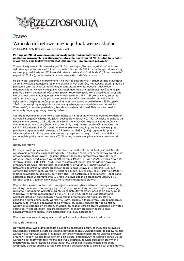 Prawo Wnioski dekretowe można jednak wciąż składać 23.01.2013, Piotr Gołaszewski Lech Żyżylewski Patrząc na 20 lat warszawskiej prywatyzacji, można dostrzec, że wiele poglądów prawnych i rozstrzygnięć, które na początku lat 90. trudno było sobie wyobrazić, dziś traktowanych jest jako norma – polemizują prawnicy. Z tezami artykułu A. Michałowskiego i M. Ostrowskiego „Nie można już złożyć wniosku dekretowego w Warszawie" („Rzeczpospolita", 3 stycznia 2013 r.), będącego odpowiedzią na nasz poprzedni artykuł „Wniosek dekretowy można złożyć także dziś" („Rzeczpospolita", 4 grudnia 2012 r.), polemizujemy przede wszystkim z dwóch przyczyn. Po pierwsze, zupełnie nie przekonuje – na wskroś pozaprawna – argumentacja stawiająca za punkt wyjścia potencjalne (zdaniem przywołanych autorów, negatywne) skutki przyjęcia poglądu o tym, że wniosek dekretowy można złożyć również obecnie. Idąc tropem rozumowania A. Michałowskiego i M. Ostrowskiego można wszakże postawić dalej idące pytanie o sens i dopuszczalność całej sądowej reprywatyzacji, która zasadniczo naruszyła nieruchomościowe status quo zastane w Warszawie w 1989 r. Skoro bowiem, jak piszą wskazani autorzy, „uznanie poglądu o bezskuteczności, nieważności czy nieistnieniu ogłoszenia o objęciu gruntów przez gminę m.st. Warszawy w posiadanie z 25 listopada 1948 r. podważyłoby względnie unormowaną sytuację prawną wielu nieruchomości w Warszawie", to można powiedzieć, że cała – trwająca od ponad 20 lat – warszawska reprywatyzacja tę sytuację prawną podważa. Czy ma to być jednak argument przemawiający na rzecz przymykania oczu na ewidentne uchybienia organów władzy, do jakich dochodziło w latach 40. i 50. XX wieku w związku ze stosowaniem dekretu z 26 października 1945 r. o własności i użytkowaniu gruntów na obszarze m.st. Warszawy [DzU nr 50, poz. 279, dalej: dekret; podkreślmy od razu, że sami A. Michałowski i M. Ostrowski w swoim artykule, skądinąd trafnie, wskazują, że podpisanie ogłoszenia dekretowego z 25 listopada 1948 r. (dalej: ogłoszenie) przez wiceprezydenta S. Srokę „nie było zgodne z przepisami ustawy z 16 sierpnia 1938 r. o samorządzie gminy m.st. Warszawy"]? W naszej ocenie zdecydowanie nie powinno tak być. Normy dekretowe Po drugie warto przypomnieć, że w orzecznictwie podkreśla się, iż brak jest podstaw do wyjaśniania przepisów nacjonalizacyjnych – a trudno z dzisiejszej perspektywy za takie nie uznawać norm dekretowych – jeszcze głębiej w kierunku ograniczenia praw dawnych właścicieli (zob. przykładowo wyrok SN z 8 maja 1992 r., III ARN 23/92 i wyrok NSA z 15 stycznia 2008 r., I OSK 1931/06). Czymże natomiast innym, jak nie właśnie swoistą, pronacjonalizacyjną interpretacją, jest podjęta w artykule A. Michałowskiego i M. Ostrowskiego próba wykładni przepisów dekretu oraz ustawy z 16 sierpnia 1938 r. o samorządzie gminy m.st. Warszawy (DzU nr 63, poz. 479 ze zm., dalej: ustawa z 1938 r.) mająca prowadzić do konkluzji, że wprawdzie – co dostrzegają sami autorzy – podpisanie ogłoszenia przez wiceprezydenta S. Srokę „nie było zgodne z przepisami ustawy z 16 sierpnia 1938 r.", jednak nie wpływa to na jego skuteczność prawną. W powyższy sposób dochodzi do usankcjonowania nie tylko wadliwości samego ogłoszenia, ale biorąc dodatkowo pod uwagę jego treść (a przypomnijmy, że mocą ogłoszenia objęto rzekomo w posiadanie wszystkie grunty „nieobjęte dotychczas w posiadanie gminy m.st. Warszawy" w trybie rozporządzeń z 1946 r. i z 1948 r.), także do usankcjonowania wszelkich uchybień popełnianych w toku całego procesu obejmowania gruntów w posiadanie przez gminę m.st. Warszawy. Sądy, organy, a także strony i ich pełnomocnicy powinni w tej sytuacji odpowiedzieć na pytanie, czy mamy obecnie stawać na straży wątpliwej jakości działań ówczesnych władz, czy jednak chronić prawo własności obywateli odjęte im, w sposób nagły i bezprecedensowy, na mocy przepisów dekretu oraz powiązanych z nim aktów, które najczęściej i tak były naruszane? W naszym przekonaniu wyłącznie ten drugi kierunek jest współcześnie właściwy. Czasy się zmieniają Dotychczasowe uwagi dają ponadto asumpt do postawienia tezy, że stosunek do kwestii skuteczności ogłoszenia staje się obecnie pewnego rodzaju wykładnikiem poglądów na całą warszawską reprywatyzację i jej dalsze losy oraz wyznacznikiem granic „odwagi prawnej" organów i sądów. Spoglądając bowiem z dzisiejszej perspektywy na ostatnie ponad 20 lat warszawskiej reprywatyzacji można bez trudu dostrzec, że wiele poglądów prawnych i rozstrzygnięć, jakie jeszcze na początku lat 90. ubiegłego stulecia trudno było sobie wyobrazić, uchodzi obecnie za coś normalnego i powszechnego w obrębie tej problematyki. A przecież gdyby stanąć na stanowisku wyrażonym w artykule A. Michałowskiego i M. Ostrowskiego, te poglądy i rozstrzygnięcia wypadałoby już dwie dekady temu uznać za podważające „względnie unormowaną sytuację prawną wielu nieruchomości w Warszawie". Na koniec wypada wskazać, że nie przekonuje również jedyny w zasadzie argument natury merytorycznej, którym swoje stanowisko podparli A. Michałowski i M. Ostrowski, dotyczący rzekomego istnienia dorozumianego upoważnienia dla wiceprezydenta S. Sroki do podpisania ogłoszenia. Pogląd ten bowiem nie koresponduje z treścią art. 54 ustawy z 1938 r., z którego nie wynikało żadne domniemanie działania wiceprezydentów z upoważnienia prezydenta miasta. Stanowisko to kłóci się również z kardynalną zasadą zakazującą domniemywania kompetencji, co powinno dotyczyć tak samo stosunków zewnętrznych, jak i wewnętrznych w administracji. Ponadto z treści ogłoszenia w żaden sposób nie wynika, że zostało ono wydane i podpisane z upoważnienia Prezydenta m.st. Warszawy, a jeśli nawet miałob