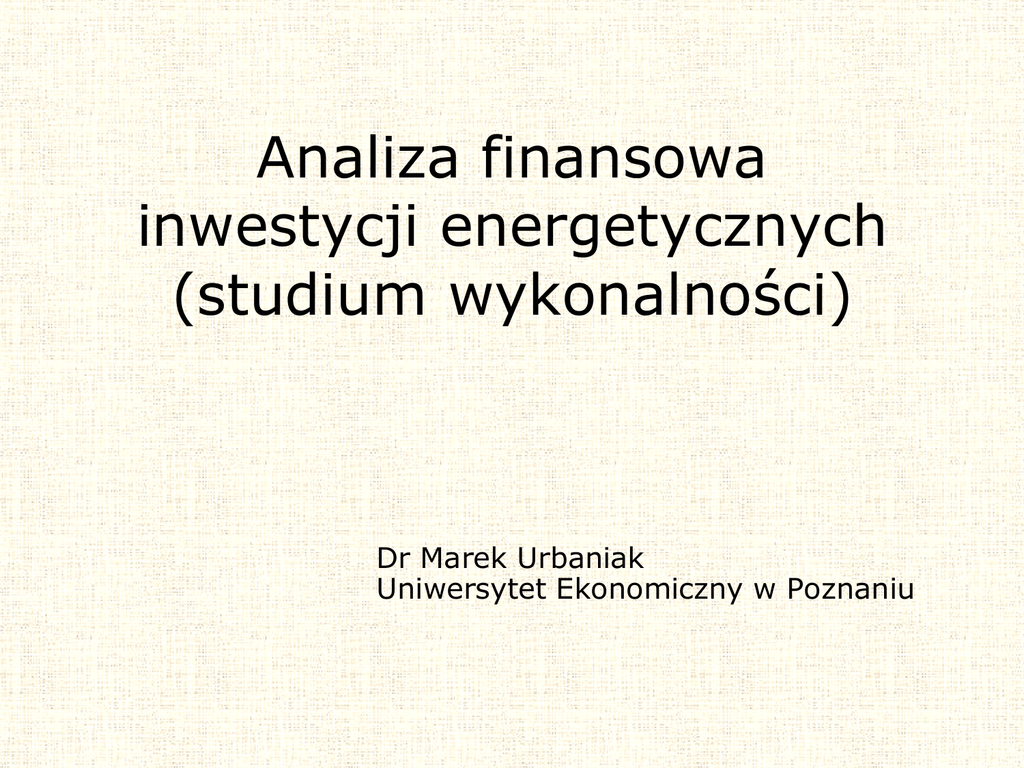 Analiza finansowa inwestycji energetycznych (studium wykonalności) Dr Marek Urbaniak Uniwersytet Ekonomiczny w Poznaniu Studium wykonalności – dokument (analiza) przedstawiająca cele projektu i sposoby ich osiągnięcia, – sposób oceny warunków ekonomiczno-finansowych – pomaga pokazać wiarygodność projektodawcy, – pomaga ustalić czy inwestycja jest na tyle atrakcyjna, aby uzasadnić jej realizację. Pytania w studium wykonalności • Jaki problem trzeba rozwiązać? • Jakie są opcje rozwiązania problemu: techniczne, organizacyjne, finansowe; i który wariant jest najkorzystniejszy? (Czy są alternatywne rozwiązania i czy je przeanalizował, np. bojler elektryczny a kolektory słoneczne z podgrzewaniem wody energią elektryczną)? • Czy projekt jest racjonalny finansowo i społecznie – czy powstanie wartość dodana dla beneficjenta, czy będą korzyści społeczne dla jednostki terytorialnej? • Czy projekt jest wykonalny, tzn. ograniczenia finansowe, techniczne, organizacyjne, prawne, rynkowe lub inne uniemożliwiają realizację projektu? • Czy projekt będzie miał charakter trwały, tzn. czy dochody z prowadzonej działalności pozwolą na pokrycie kosztów eksploatacyjnych, a jeśli nie, to skąd będą pochodzić środki na zapewnienie funkcjonowania projektu po inwestycji? Podstawowe elementy studium wykonalności • Definicja celów projektu • Charakterystyka projektu – opis przedmiotu inwestycji (identyfikacja projektu) • Analiza wykonalności i rozwiązań alternatywnych • Analiza finansowa (analiza przepływów finansowych) • Analiza ekonomiczna (analiza kosztów i korzyści) • Analiza wrażliwości i ryzyka Identyfikacja projektu – koncepcja i ramy projektu • • zarys i ogólny charakter projektu: przedmiot przedsięwzięcia, całkowity koszt inwestycji, lokalizacja itd., powiązania między danym projektem a istniejącą infrastrukturą. Definicja celów projektu • • Cele projektu bezpośrednie i pośrednie określone w oparciu o analizę potrzeb danego środowiska gospodarczospołecznego. Określają korzyści społeczno-ekonomiczne do osiągnięcia dzięki wdrożeniu projektu, Powinny być zbieżne z celami osi priorytetowej programu operacyjnego. Analiza wykonalności i rozwiązań alternatywnych • • Potwierdzenie, że wariant realizacji projektu reprezentuje najlepsze rozwiązanie spośród wszelkich możliwych alternatywnych rozwiązań (istotnych i technicznie wykonalnych). Wybór najlepszego wariantu na podstawie umożliwia analiza DGC – wyliczenie dynamicznego kosztu jednostkowego (DGC). Jednostką jest zł/jednostkę efektu przedsięwzięcia, np. w przypadku gospodarki wodno-ściekowej zł/m3. Celem analizy finansowej jest pokazanie, na ile opłacalna jest realizacja projektu, przy uwzględnieniu wszystkich wydatków oraz przychodów. Zadania: • weryfikacja trwałości finansowej projektu i beneficjenta/ operatora, • ocena rentowności inwestycji, a także bieżącej wartości netto poprzez ustalenie wartości wskaźników efektywności finansowej projektu, • ustalenie właściwego (maksymalnego) dofinansowania z funduszy UE. Analiza finansowa obejmuje elementy m.in.: • zestawienie przychodów osiągnięte po realizacji projektu, • zestawienie kosztów inwestycji, • zestawienie kosztów związanych z eksploatacją projektu po jego oddaniu do użytkowania (tzw. koszty operacyjne), • harmonogram amortyzacji majątku trwałego, • harmonogram spłaty pożyczki lub kredytu otrzymanego na realizację projektu, • sporządzanie bilansu projektu, • zapotrzebowanie na kapitał obrotowy, • sporządzenie rachunku zysków i strat projektu, • sporządzenie rachunku przepływów pieniężnych (cash-flow). Informacje na potrzeby planu finansowego • Nakłady inwestycyjne projektu: grunty, budynki i budowle, maszyny i urządzenia, środki transportu, wartość niematerialne i prawne • Harmonogram realizacji projektu: wykres Gantta • Przychody: np. ze sprzedaży energii elektrycznej, ze sprzedaży energii cieplnej, ze sprzedaży nawozów organicznych • Koszty eksploatacyjne: amortyzacja, koszty energii i materiałów, wynagrodzenia, koszty przeglądów oraz remontów, koszty obsług obce, inne koszty rodzajowe • Amortyzacja: systematyczne, planowane rozłożenie wartości początkowej środka trwałego na ustalony okres amortyzacji. Stanowi ona koszt, który obniża podstawę opodatkowania, ale nie jest wydatkiem. • Zapotrzebowanie na kapitał obrotowy – „kapitałem pracujący”, czyli elementy majątku zapewniające funkcjonowanie bez przestojów. Kapitał obrotowy = zapasy + należności – zobowiązania krótkoterminowe • Harmonogram spłaty pożyczki lub kredytu Elementy analizy finansowej • Rachunek zysków i strat: wyliczenie przychodów i kosztów działalności, • Bilans: zestawienie aktywów i pasywów na dany dzień, • Rachunek przepływów pieniężnych: umożliwia analizę gotówki. Ocena efektywności finansowej Trzeba sprawdzić czy przychody osiągane z jego eksploatacji przekraczają poniesione wydatki. Określamy: – ile w przyszłości będą warte konkretne środki pieniężne, które mamy w chwili obecnej do dyspozycji (określa to wartość stopy dyskontowej). – ile aktualnie są warte środki pieniężne, które pojawią się w przyszłości (środki pieniężne dyskontujemy przy pomocy stopy dyskontowej). P = A (1+ i)n P – przyszła wartość kwoty A – aktualna wartość kwoty n – liczba lat i – stopa procentowa w danym okresie Ocena efektywności finansowej • Dwa główne wskaźniki opłacalności: wartość zaktualizowana netto (NPV, Net Present Value), wewnętrzna stopa zwrotu. • Zaktualizowana wartość netto (NPV): czy realizacja projektu przyniesie nadwyżkę finansową? NPV = PVB – PVC [zł] gdzie: PVB = wartości aktualna przychodów z realizacji projektu (ang. Present Value of benefits) PVC = wartości aktualna całkowitych wydatk