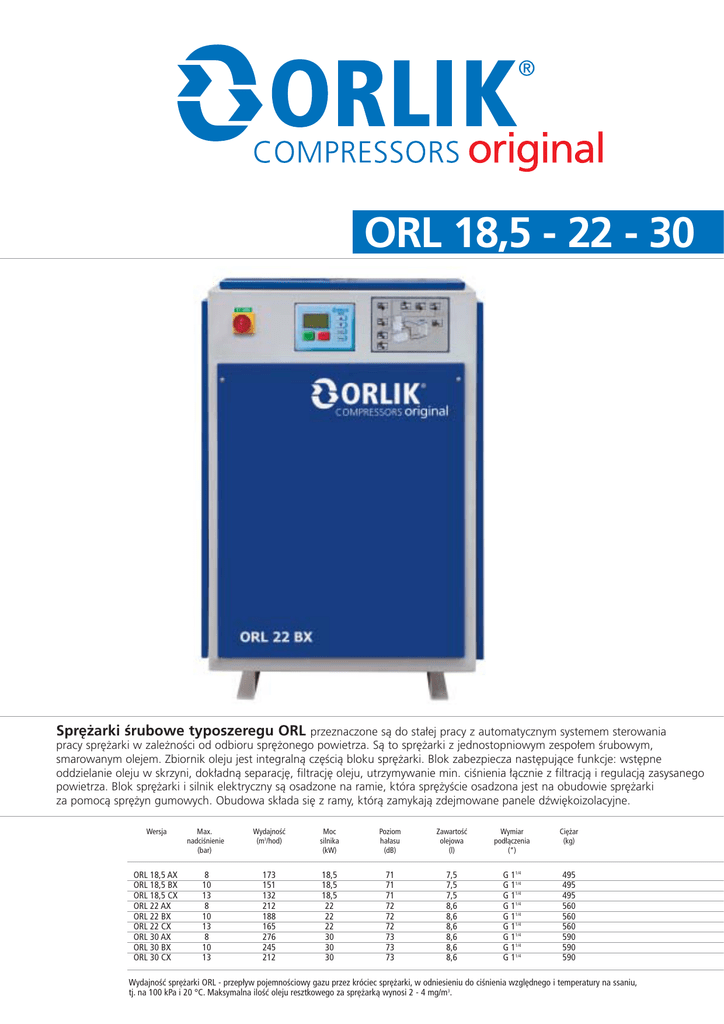 ORL 18,5 - 22 - 30 Sprężarki śrubowe typoszeregu ORL przeznaczone są do stałej pracy z automatycznym systemem sterowania pracy sprężarki w zależności od odbioru sprężonego powietrza. Są to sprężarki z jednostopniowym zespołem śrubowym, smarowanym olejem. Zbiornik oleju jest integralną częścią bloku sprężarki. Blok zabezpiecza następujące funkcje: wstępne oddzielanie oleju w skrzyni, dokładną separację, filtrację oleju, utrzymywanie min. ciśnienia łącznie z filtracją i regulacją zasysanego powietrza. Blok sprężarki i silnik elektryczny są osadzone na ramie, która sprężyście osadzona jest na obudowie sprężarki za pomocą sprężyn gumowych. Obudowa składa się z ramy, którą zamykają zdejmowane panele dźwiękoizolacyjne. Wersja Max. nadciśnienie (bar) Wydajność (m3/hod) Moc silnika (kW) Poziom hałasu (dB) Zawartość olejowa (l) Wymiar podłączenia „ ( ) Ciężar (kg) ORL 18,5 AX ORL 18,5 BX ORL 18,5 CX ORL 22 AX ORL 22 BX ORL 22 CX ORL 30 AX ORL 30 BX ORL 30 CX 8 10 13 8 10 13 8 10 13 173 151 132 212 188 165 276 245 212 18,5 18,5 18,5 22 22 22 30 30 30 71 71 71 72 72 72 73 73 73 7,5 7,5 7,5 8,6 8,6 8,6 8,6 8,6 8,6 G 11/4 G 11/4 G 11/4 G 11/4 G 11/4 G 11/4 G 11/4 G 11/4 G 11/4 495 495 495 560 560 560 590 590 590 Wydajność sprężarki ORL - przepływ pojemnościowy gazu przez króciec sprężarki, w odniesieniu do ciśnienia względnego i temperatury na ssaniu, tj. na 100 kPa i 20 °C. Maksymalna ilość oleju resztkowego za sprężarką wynosi 2 - 4 mg/m3. ORL 18,5 - 22 - 30 Mikroprocesorowy zespół sterowania ORLIK 900 ■ ■ ■ ■ ■ ■ ■ kontrola cyklów roboczych uruchomienie gwiazda - trójkąt nastawialny czas biegu jałowego kontrola temperatury oleju kontrola nastawienia ciśnienia roboczego kontrola godzin roboczych możliwość sterowania 3 podporządkowanymi sprężarkami sterowalnymi sygnałem elektrycznym bez konieczności montowania w tych sprężarkach dodatkowego zespołu sterowania ■ możliwość rotacji priorytetów ■ komunikacja z systemem nadrzędnym poprzez RS - 232, ewentualnie RS - 485 ■ wizualizacja stanów roboczych sprężarki z logowaniem Urządzenia kontrolne Urządzenia bezpieczeństwa ■ Zawór minimalnego ciśnienia zapewnia wymagane ciśnienie w systemie smarowania ■ Automatyczne odciążenie umożliwia zmniejszenie ciśnienia przy zatrzymaniu sprężarki tak, aby restart nie przebiegał do przeciwciśnienia ■ Zatyczka do napełnia oleju i kontroli stanu (wysokości poziomu) oleju ■ Panel sterowania obejmujący: ■ złącze użytkowania zespołu sterowania z elementami nastawczymi i sterującym ■ główny wyłącznik sprężarki ■ Analogowy czujnik ciśnienia wylotowego sprężonego powietrza ■ Zawór bezpieczeństwa na korpusie maszyny ■ Nadprądowy przekaźnik cieplny zabezpieczający chroni silnik elektryczny przed przeciążeniem ■ Ochrona cieplna uzwojenia silnika elektrycznego ■ Czujnik analogowy temperatury oleju ■ Przekaźnik kontroli parametrów sieci zasilającej Wylot powietrza chłodzonego Wylot sprężonego powietrza G 1 1/4 - I Wlot powietrza chłodzonego Twój fachowy doradca: Bliższe informacje: ORLÍK-KOMPRESORY výrobní družstvo Kubelkova 497, 560 82 Česká Třebová Republika Czeska tel.: +420 465 507 111 fax: +420 465 533 018 e-mail: [email protected] http://www.orlik.cz