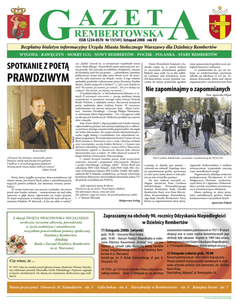 ISSN 1234-8570 Nr 11(141) listopad 2008 rok XV SPOTKANIE Z POETĄ PRAWDZIWYM Ernest Bryll „Chciejcie być skromni, zrozumiali, prości, Panujcie myślą nad słuchaczów gminem I budźcie w sercach pragnienie piękności; Niechaj pieśń wasza będzie dobrym winem.” Adam Asnyk Poetą, który mógłby powyższe słowa potraktować jak własne motto, jest Ernest Bryll, jeden z najwybitniejszych żyjących poetów polskich. Jest skromny, otwarty, poszukujący. W swojej twórczości nie poucza czytelnika, ale stawia przed nim trudne zadania – zastanowienia się nad sobą, zajrzenia w głąb duszy, odpowiedzi na ważne pytania. W stanie wojennym, w trudnych latach 80-tych stał się sumieniem Polaków. W zbiorach „A kto się odda w radość” czy „Sadza” nazwał to, co nienazwane wypełniało nasze serca. Może dlatego Ernest Bryll często nazywany jest poetą prawdy. Nie pozwala na nihilizm, obojętność, zmusza do działania, każe być po prostu ….człowiekiem. Szerokiej publiczności znany jest jako autor librett m.in. do musicali Na szkle malowane czy Kolęda- nocka. Z tego właśnie spektaklu pochodzi wykonywany przez Krystynę Prońko słynny „Psalm stojących w kolejce”: [...]Za czym kolejka ta stoi?- Po szarość, po szarość, po szarość... Na co w kolejce tej czekasz?- Na starość, na starość, na starość…” 22 października br., w Sali kolumnowej Ratusza, w ramach II jesiennych wieczorów z poezją mieliśmy okazję uczestniczyć w premierze nowego tomu wierszy Ernesta Brylla Wiośnin, z udziałem twórcy. Recytował przyjaciel poety, znakomity aktor Andrzej Ferenc. W wieczorze wykorzystano też utwory muzyczne Jean - Marie Laclairea, Antonio Vivaldiego i Georga Philipa Telemanna, w wykonaniu Marii Papuzińskiej - Uss i Grzegorza Lalek na skrzypcach barokowych. Widzowie poddali się czarowi słów i muzyki. Sam Ernest Bryll z chęcią podpisywał tomiki wierszy, odpowiadał na pytania. Jest artystą znajdującym w odbiorcy partnera, którego czasami trzeba poprowadzić, ale nigdy nie wolno lekceważyć. Na swojej stronie internetowej prowadzi ciągły dialog z czytelnikami. Jest człowiekiem ciepłym i pogodnym. W swoim internetowym CV pisze: Ernest Bryll mieszka w Warszawie wraz z żoną i dwiema córkami oraz zwierzętami, suczką Golden Retriever i 5 kotami rasy dachowo-irlandzkiej. Urodzony 1 marca 1935 w Warszawie. Dzieciństwo spędził w Komorowie Starym koło Ostrowi Mazowieckiej oraz w Gdyni. W 1956 ukończył wydział Filologii Polskiej Uniwersytetu Warszawskiego. (…)Autor licznych tomików poezji, sztuk scenicznych, oratoriów, musicali i programów telewizyjnych. Tłumacz z języka irlandzkiego, czeskiego, jidish.” Ernest Bryll jest członkiem PEN Club Poland , Irish PEN Club, SEC (Society of European Culture) SPP, ZAIKS, ZAKR. Był ambasadorem RP w Irlandii, wykładowcą na Sunny University, krytykiem filmowym i kierownikiem literackim teatru TV, ale przede wszystkim jest POETĄ. „Jeśli zaprosicie poetę do domu Otwórzcie się na oścież. Przywitajcie chlebem Nie ukrywajcie duszy, wina ani żony Nie zabierze czego nie macie. Przyszedł podarować siebie (…)” Roman Śliwonik Małgorzata Szeląg Z okazji ŚWIĘTA PRACOWNIKA SOCJALNEGO serdeczne życzenia zdrowia, powodzenia w życiu osobistym i zawodowym wszystkim pracownikom pomocy społecznej Dzielnicy Rembertów składają Rada i Zarząd Dzielnicy Rembertów m.st. Warszawy Czy wiesz, że … W 1937 roku na rondzie przed główną bramą Akademii Obrony Narodowej odsłonięto pomnik Marszałka Józefa Piłsudskiego. Popiersie zaginęło w latach czterdziestych. Do dzisiaj nie wyjaśniono okoliczności jego zniknięcia. Warto przeczytać: Otwarcie Al. Sztandarów - str. 3 Dzień Wszystkich Świętych i Zaduszki wiążą się w naszej tradycji ze zwyczajem odwiedzania grobów bliskich nam osób. Są to dni refleksji i zadumy nad kruchością życia. Od dzieciństwa uczeni jesteśmy szacunku do miejsc pochówku zgodnie tania opuszczonych grobów m.in. poległych harcerzy i żołnierzy. 31 października br., po raz kolejny, na rembertowskim cmentarzu zebrała się młodzież LI LO im. Tadeusza Kościuszki, która pod okiem organizatorów i wychowawczyni Pani Nie zapominajmy o zapomnianych Pan Czesław Sobolewski z uczniami i wychowawcą kl. II f LI LO z zasadą, że dopóki żyje pamięć – człowiek nie odszedł. Zapalając znicz na zapomnianym grobie, sprawiamy, że choć przez jeden dzień w roku płonie na nim światełko pamięci. Na tym większy szacunek zasługuje inicjatywa Pana Czesława Sobolewskiego, Przewodniczącego Komisji Rewizyjnej Rady Osiedla Rembertów Stary, oraz Pana Mieczysława Krassowskiego, Przewodniczącego Rady Osiedla Rembertów Stary, którzy są organizatorami akcji sprzą- Agnieszki Dobrowolskiej z wielkim poświęceniem wysprzątała znaczną część zaniedbanych mogił. Organizatorzy składają serdeczne podziękowania Dyrektorowi LI LO Małgorzacie Orzeszek, wychowawczyni klasy II f Agnieszce Dobrowolskiej i przede wszystkim uczestniczącej w przedsięwzięciu młodzieży. Mamy nadzieję, że akcja sprzątania zaniedbanych grobów będzie kontynuowana w przyszłych latach. Agnieszka Filipek Zapraszamy na obchody 90. rocznicy Odzyskania Niepodległości w Dzielnicy Rembertów 11 listopada 2008r. (wtorek) godz. 18.00 – Uroczysta Msza Święta godz. 19.00 – Koncert Pamięci Niepodległej w wykonaniu Orkiestry Koncertowej „Victoria” oraz solistów (Koncert w ramach cyklu Muzyczny dialog narodów Europy zorganizowanego przez Urząd Dzielnicy Rembertów m.st. Warszawy) Kościół pw. św. O. Rafała Kalinowskiego, al. gen. A. Chruściela 103 ustanowiono świętem państwowym w 1937 r. W latach okupacji oraz w czasie rządów komunistycznych jego obchody były zakazane. Dopiero w 1989 roku ustawą Sejmu przywrócono Święto Odzyskania Niepodległości, a 11 listopada ustanowiono dniem wolnym od pracy. 22 listopada (sobota) godz. 18.00 Koncert
