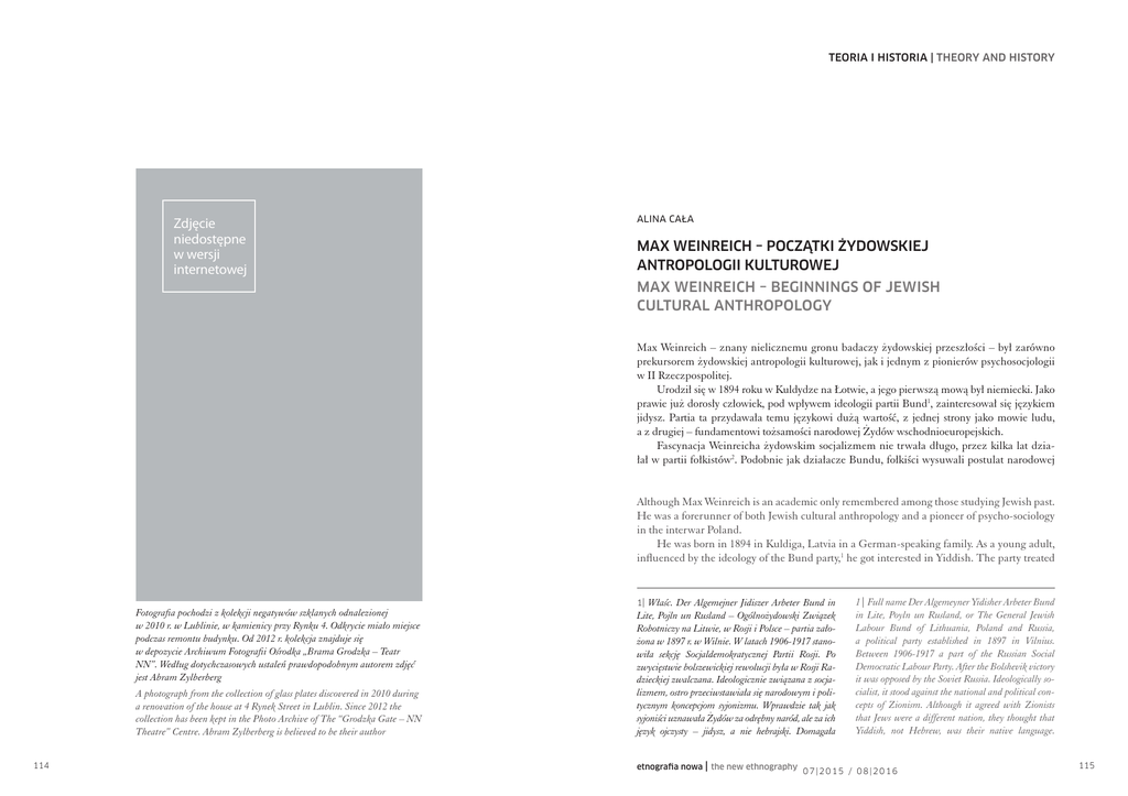 Teoria i historia | Theory and history Zdjęcie niedostępne w wersji internetowej Alina Cała Max Weinreich – początki żydowskiej antropologii kulturowej Max Weinreich – Beginnings of Jewish Cultural Anthropology Max Weinreich – znany nielicznemu gronu badaczy żydowskiej przeszłości – był zarówno prekursorem żydowskiej antropologii kulturowej, jak i jednym z pionierów psychosocjologii w II Rzeczpospolitej. Urodził się w 1894 roku w Kuldydze na Łotwie, a jego pierwszą mową był niemiecki. Jako prawie już dorosły człowiek, pod wpływem ideologii partii Bund1, zainteresował się językiem jidysz. Partia ta przydawała temu językowi dużą wartość, z jednej strony jako mowie ludu, a z drugiej – fundamentowi tożsamości narodowej Żydów wschodnioeuropejskich. Fascynacja Weinreicha żydowskim socjalizmem nie trwała długo, przez kilka lat działał w partii fołkistów2. Podobnie jak działacze Bundu, fołkiści wysuwali postulat narodowej Although Max Weinreich is an academic only remembered among those studying Jewish past. He was a forerunner of both Jewish cultural anthropology and a pioneer of psycho-sociology in the interwar Poland. He was born in 1894 in Kuldiga, Latvia in a German-speaking family. As a young adult, influenced by the ideology of the Bund party,1 he got interested in Yiddish. The party treated Fotografia pochodzi z kolekcji negatywów szklanych odnalezionej w 2010 r. w Lublinie, w kamienicy przy Rynku 4. Odkrycie miało miejsce podczas remontu budynku. Od 2012 r. kolekcja znajduje się w depozycie Archiwum Fotografii Ośrodka „Brama Grodzka – Teatr NN”. Według dotychczasowych ustaleń prawdopodobnym autorem zdjęć jest Abram Zylberberg A photograph from the collection of glass plates discovered in 2010 during a renovation of the house at 4 Rynek Street in Lublin. Since 2012 the collection has been kept in the Photo Archive of The “Grodzka Gate – NN Theatre” Centre. Abram Zylberberg is believed to be their author 114 Właśc. Der Algemejner Jidiszer Arbeter Bund in Lite, Pojln un Rusland – Ogólnożydowski Związek Robotniczy na Litwie, w Rosji i Polsce – partia założona w 1897 r. w Wilnie. W latach 1906-1917 stanowiła sekcję Socjaldemokratycznej Partii Rosji. Po zwycięstwie bolszewickiej rewolucji była w Rosji Radzieckiej zwalczana. Ideologicznie związana z socjalizmem, ostro przeciwstawiała się narodowym i politycznym koncepcjom syjonizmu. Wprawdzie tak jak syjoniści uznawała Żydów za odrębny naród, ale za ich język ojczysty – jidysz, a nie hebrajski. Domagała 1| etnografia nowa | the new ethnography 1| Full name Der Algemeyner Yidisher Arbeter Bund in Lite, Poyln un Rusland, or The General Jewish Labour Bund of Lithuania, Poland and Russia, a political party established in 1897 in Vilnius. Between 1906-1917 a part of the Russian Social Democratic Labour Party. After the Bolshevik victory it was opposed by the Soviet Russia. Ideologically socialist, it stood against the national and political concepts of Zionism. Although it agreed with Zionists that Jews were a different nation, they thought that Yiddish, not Hebrew, was their native language. 07|2015 / 08|2016 115 Max Weinreich – Beginnings of Jewish Cultural Anthropology autonomii Żydów na terenie szeroko pojętej Europy Wschodniej i podkreślali ważne, narodowotwórcze znaczenie języka jidysz. Gdy otrzymał doktorat na Uniwersytecie w Marburgu (Niemcy, Hesja), był już uznanym badaczem dziejów języka jidysz, autorem rozprawy doktorskiej oraz kilku artykułów na ten temat, publikowanych w prasie żydowskiej. Wykładał w Wileńskim Żydowskim Seminarium Nauczycielskim, był również wychowawcą młodzieży, a od 1927 roku – założycielem skautowej organizacji „Bin” [Pszczoła]. Weinreich jest też znany jako jeden ze współzałożycieli Żydowskiego Instytutu Naukowego w Wilnie (Jidiszer Wisnszaftlecher Instytut, JIWO). Placówka ta powstała w 1925 roku. Stworzona została przez grupę intelektualistów żydowskich, zainteresowanych badaniem i rozwojem kultury tworzonej w języku jidysz. Weinreich zasiadał w Komitecie Założycielskim wraz z takimi osobistościami, jak Albert Einstein, Zygmunt Freud, ekonomista Jakub Leszczyński, historycy Szymon Dubnow i Jakub Szacki czy przywódca fołkistów – Noach Pryłucki. Został dyrektorem tej placówki. JIWO posiadało filie w Berlinie (do 1933 roku), Warszawie (do 1939 roku), Buenos Aires oraz Nowym Jorku. W tym ostatnim mieście działa do dziś jako YIVO Institute for Jewish Research3. Skupieni w wileńskiej placówce naukowcy zajmowali się socjologią, etnografią, demografią oraz analizą położenia ekonomicznego Żydów w Polsce i innych krajach Europy the language with utmost importance, it was the people’s language as well as the foundation upon which the national identity of Eastern European Jews was built. Weinreich’s interest in Jewish socialism did not last long and for several years he was an active member of The Folkspartei.2 Similarly to Bund, the Folkspartei wanted autonomy of the Jews living in Eastern Europe and emphasised the importance of the Yiddish language. When he received his doctorate at Marburg University (Germany, Hessia), he already was a renowned historian of the Yiddish language and the author of a dissertation and a number of articles about Yiddish, published in Jewish press. He taught at Jewish Teacher’s Seminar in Vilnius, was a tutor and since 1927 – the leader of a scout organization “Bin” [Bee]. Weinreich is also famous for founding the Yiddish Scientific Institute in Vilnius (Yidisher Visnshaftlekher Institut, YIVO), which was created in 1925 by a group of Jewish intellectuals interested in studying and developing a Yiddish-based culture. Weinreich was a member of the Founding Committee along Albert Einstein, Sigmund Freud, Jakub Leszczyński (an economist), historians Simon Dubnow and Yankev Shatzky or Noyekh Prilutski, the le