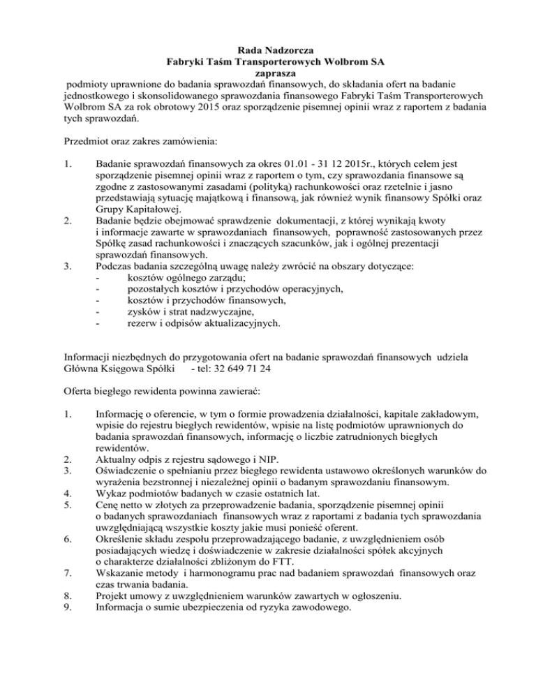 Rada Nadzorcza Fabryki Taśm Transporterowych Wolbrom SA zaprasza podmioty uprawnione do badania sprawozdań finansowych, do składania ofert na badanie jednostkowego i skonsolidowanego sprawozdania finansowego Fabryki Taśm Transporterowych Wolbrom SA za rok obrotowy 2015 oraz sporządzenie pisemnej opinii wraz z raportem z badania tych sprawozdań. Przedmiot oraz zakres zamówienia: 1. 2. 3. Badanie sprawozdań finansowych za okres 01.01 - 31 12 2015r., których celem jest sporządzenie pisemnej opinii wraz z raportem o tym, czy sprawozdania finansowe są zgodne z zastosowanymi zasadami (polityką) rachunkowości oraz rzetelnie i jasno przedstawiają sytuację majątkową i finansową, jak również wynik finansowy Spółki oraz Grupy Kapitałowej. Badanie będzie obejmować sprawdzenie dokumentacji, z której wynikają kwoty i informacje zawarte w sprawozdaniach finansowych, poprawność zastosowanych przez Spółkę zasad rachunkowości i znaczących szacunków, jak i ogólnej prezentacji sprawozdań finansowych. Podczas badania szczególną uwagę należy zwrócić na obszary dotyczące: kosztów ogólnego zarządu; pozostałych kosztów i przychodów operacyjnych, kosztów i przychodów finansowych, zysków i strat nadzwyczajne, rezerw i odpisów aktualizacyjnych. Informacji niezbędnych do przygotowania ofert na badanie sprawozdań finansowych udziela Główna Księgowa Spółki - tel: 32 649 71 24 Oferta biegłego rewidenta powinna zawierać: 1. 2. 3. 4. 5. 6. 7. 8. 9. Informację o oferencie, w tym o formie prowadzenia działalności, kapitale zakładowym, wpisie do rejestru biegłych rewidentów, wpisie na listę podmiotów uprawnionych do badania sprawozdań finansowych, informację o liczbie zatrudnionych biegłych rewidentów. Aktualny odpis z rejestru sądowego i NIP. Oświadczenie o spełnianiu przez biegłego rewidenta ustawowo określonych warunków do wyrażenia bezstronnej i niezależnej opinii o badanym sprawozdaniu finansowym. Wykaz podmiotów badanych w czasie ostatnich lat. Cenę netto w złotych za przeprowadzenie badania, sporządzenie pisemnej opinii o badanych sprawozdaniach finansowych wraz z raportami z badania tych sprawozdania uwzględniającą wszystkie koszty jakie musi ponieść oferent. Określenie składu zespołu przeprowadzającego badanie, z uwzględnieniem osób posiadających wiedzę i doświadczenie w zakresie działalności spółek akcyjnych o charakterze działalności zbliżonym do FTT. Wskazanie metody i harmonogramu prac nad badaniem sprawozdań finansowych oraz czas trwania badania. Projekt umowy z uwzględnieniem warunków zawartych w ogłoszeniu. Informacja o sumie ubezpieczenia od ryzyka zawodowego. Preferencje oceny ofert: 1. 2. Cena za przeprowadzenie badania. Doświadczenie w badaniu sprawozdań finansowych jednostkowych i skonsolidowanych spółek prawa handlowego. Termin i miejsce składania ofert: Ofertę należy złożyć w zamkniętej kopercie opatrzonej adresem zwrotnym wraz z adnotacją „Oferta na badanie sprawozdania finansowego za 2015r.” do dnia 10 października. 2015 roku do godz. 15.00 w sekretariacie Spółki lub przesłać pocztą na adres Spółki (decyduje data wpływu). Oferty złożone po upływie określonego terminu ich przyjmowania nie będą rozpatrywane (liczy się data wpływu oferty do Spółki). Wyniki postępowania zostaną podane do wiadomości zainteresowanych w terminie do 31 października 2015 roku. Dodatkowe informacje: termin przeprowadzenia badania sprawozdań finansowych oraz przedłożenia opinii i raportów ustala się na 08 kwietnia 2016 r.; Rada Nadzorcza zastrzega sobie prawo do swobodnego wyboru wykonawcy, przedłużenia terminu składnia ofert, negocjacji warunków umowy oraz odstąpienia od wyboru bez podania przyczyn i bez ponoszenia jakichkolwiek skutków prawnych lub finansowych. Rada Nadzorcza FTT Wolbrom SA