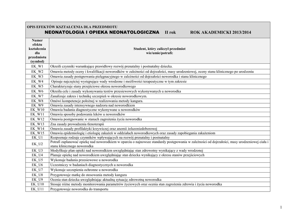 OPIS EFEKTÓW KSZTAŁCENIA DLA PRZEDMIOTU NEONATOLOGIA I OPIEKA NEONATOLOGICZNA Numer efektu kształcenia dla przedmiotu (symbol) EK_W1 EK_W2 EK_W3 EK_W4 EK_W5 EK_W6 EK_W7 EK_W8 EK_W9 EK_W10 EK_W11 EK_W12 EK_W13 EK_W14 EK_W15 EK_U1 EK_U2 EK_U3 EK_U4 EK_U5 EK_U6 EK_U7 EK_U8 EK_U9 EK_U10 EK_U11 II rok ROK AKADEMICKI 2013/2014 Student, który zaliczył przedmiot wie/umie/potrafi: Określi czynniki warunkujące prawidłowy rozwój prenatalny i postnatalny dziecka. Omawia metody oceny i kwalifikacji noworodków w zależności od dojrzałości, masy urodzeniowej, oceny stanu klinicznego po urodzeniu Omawia zasady postępowania pielęgnacyjnego w zależności od dojrzałości noworodka i stanu klinicznego Opisuje najczęściej występujące wady wrodzone i możliwości terapeutyczne w tym zakresie Charakteryzuje stany przejściowe okresu noworodkowego Określa cele i zasady wykonywania testów przesiewowych wykonywanych u noworodka Zanalizuje zakres i technikę szczepień w okresie noworodkowym. Omówi kompetencje położnej w realizowaniu metody kangura. Omawia zasady intensywnego nadzoru nad noworodkiem Omawia badania diagnostyczne wykonywane u noworodków Omawia sposoby podawania leków u noworodków Omawia postępowanie w stanach zagrożenia życia noworodka Zna zasady prowadzenia tlenoterapii Omawia zasady profilaktyki krzywiczej oraz anemii żelazoniedoborowej Omawia epidemiologię i etiologię zakażeń w oddziałach noworodkowych oraz zasady zapobiegania zakażeniom Rozpoznaje rodzaje czynników wpływających na rozwój prenatalny i postnatalny Potrafi zaplanować opiekę nad noworodkiem w oparciu o najnowsze standardy postępowania w zależności od dojrzałości, masy urodzeniowej ciała i stanu klinicznego noworodka Modyfikuje plan opieki nad noworodkiem uwzględniając stan zdrowotny wynikający z wady wrodzonej Planuje opiekę nad noworodkiem uwzględniając stan dziecka wynikający z okresu stanów przejściowych Wykonuje badania przesiewowe u noworodka Uczestniczy w badaniach diagnostycznych u noworodka Wykonuje szczepienia ochronne u noworodka Przygotowuje matkę do stosowania metody kangura Ocenia stan dziecka uwzględniając aktualną sytuację zdrowotną noworodka Stosuje różne metody monitorowania parametrów życiowych oraz ocenia stan zagrożenia zdrowia i życia noworodka Przygotowuje noworodka do transportu 1 EK_U12 Modyfikuje sposoby postępowania zapobiegającego zakażeniom w oddziałach noworodkowych EK_U13 Przygotowuje matkę i noworodka do karmienia piersią EK_U14 Stosuje różne metody karmienia naturalnego i sztucznego EK_K1 Przejawia otwartość na najnowszą wiedzę z zakresu opieki nad dzieckiem w neonatologii EK_K2 Komunikuje się z rodzicami udzielając im wsparcia emocjonalnego w trudnej sytuacji wynikającej ze stanu zdrowia dziecka EK_K3 Wykazuje świadomość własnej odpowiedzialności za wykonywanie zadań zawodowych EK_K4 Uwrażliwia rodziców na możliwość wystąpienia problemów zdrowotnych wynikających ze stanu przejściowego noworodka EK_K5 Dokonuje wyboru właściwych zasad etycznych w podejmowanych działaniach zależnych od sytuacji zdrowotnej dziecka EK_K6 Kształtuje pozytywny stosunek matki/ rodziców wobec problemów zdrowotnych ich dziecka EK_K7 Kształtuje pozytywne postawy prozdrowotne u rodziców dzieci objętych opieką neonatologiczną ZALECANA LITERATURA NEONATOLOGIA I OPIEKA NEONATOLOGICZNA rok akademicki 2013/2013 PODSTAWOWA 1. Bałanda A.: Opieka nad noworodkiem. PZWL Warszawa 2009. 2. Bartusek M., Wylęgała E.: Wybrane aspekty pielęgniarstwa epidemiologicznego. Od teorii do praktyki. ŚAM Katowice 2006. 3. Bień A.M. (red): Opieka nad kobietą ciężarną. PZWL Warszawa 2009. 4. Borkowski W.: Opieka pielęgniarska nad noworodkiem. Medycyna Praktyczna Kraków 2007 5. Czyżewska M.: Neonatologia. Podręcznik dla studentów Wydziału Zdrowia Publicznego. AM Wrocław 2007. 6. Freesner A. Raff. B.: Pielęgniarstwo w położnictwie. PZWL Warszawa 1980. 7. Kirpalani H.: Podręcznik neonatologii. Medipage Warszawa 2009. 8. Łepecka-Klusek C.: Pielęgniarstwo we współczesnym położnictwie i ginekologii. Wyd. Czelej Lublin 2003. 9. Łozińska D. Twarowska I.: Neonatologia. PZWL Warszawa 1993 10. Makara-Studzińska M., Iwanowicz-Palus G.: Psychologia w położnictwie i ginekologii. PZWL Warszawa 2009. 11. Opala T.: Ginekologia. Podręcznika dla położnych, pielęgniarek i fizjoterapeutów. PZWL Warszawa 2006 12. Pilewska – Kozak A.: Opieka nad wcześniakiem. PZWL Warszawa 2009. 13. Pisarski T.: Położnictwo i ginekologia. PZWL. Warszawa 2002. 14. Pschyrembel W., Dudenhausen J. Położnictwo praktyczne i operacje położnicze. PZWL Warszawa 2002. 15. Steciwko A., Pirogowicz I.: Dziecko i jego środowisko. Noworodek przedwcześnie urodzony – trudności i satysfakcje. Continuo, Wrocław 2008. 16. Szczapa J.: Podstawy neonatologii. PZWL 2008. 17. Wojnarowska B.: Edukacja zdrowotna. PWN Warszawa 2007. UZUPEŁNIAJĄCA 1. Agrawal P.: Odkrywam macierzyństwo. Wydanie Autorki Wrocław 2007. 2. Dobrzańska A., Ryżko J.: Pediatria. Urban i Partner Wrocław 2005. 3. Chołuj I.: Urodzić razem i naturalnie. Źródła Życia, Mszczonów 2008. 4. Kirschnick O.: Pielęgniarstwo. Urban&Partner Wrocław 2001. 2