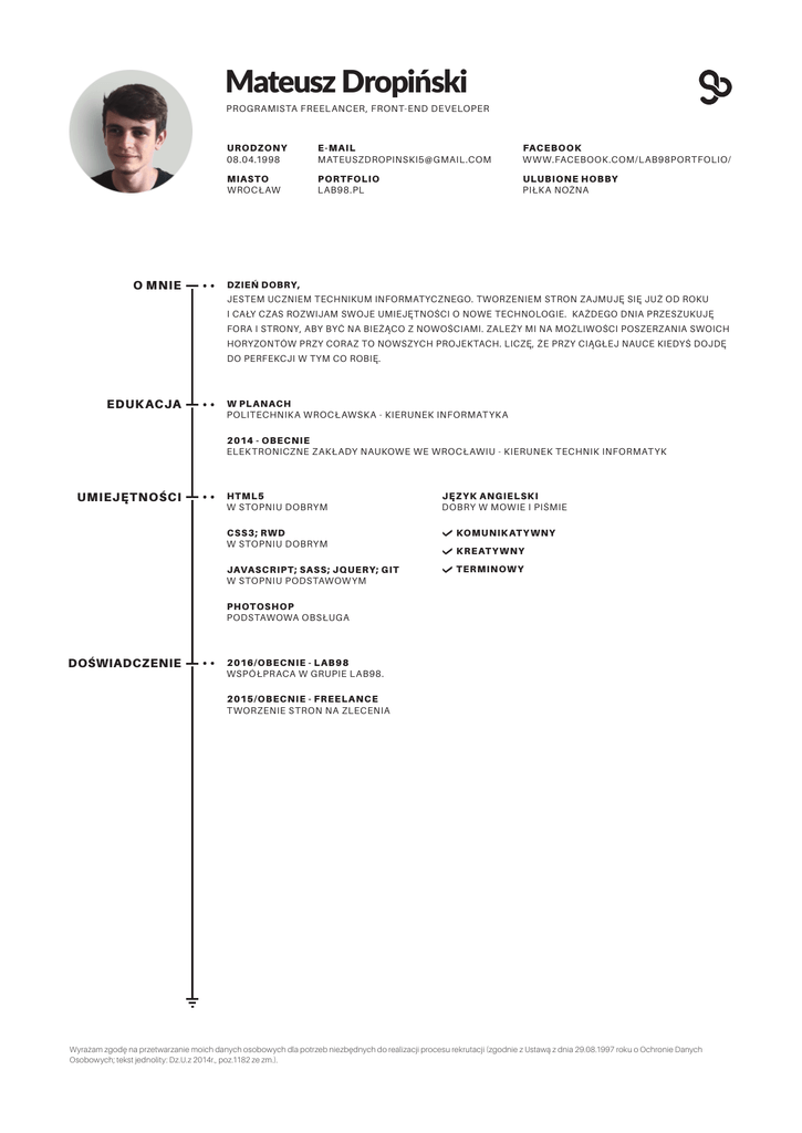 Mateusz Dropiński PROGRAMISTA FREELANCER , FRONT-END DEVELOPER O MNIE URODZONY 08.04.1998 E-MAIL MATEUSZDROPINSKI5@GMAIL .COM FACEBOOK W W W.FACEBOOK .COM/LAB98PORTFOLIO/ MIASTO WROCŁAW PORTFOLIO LAB98.PL ULUBIONE HOBBY PIŁK A NOŻNA DZIEŃ DOBRY, JESTEM UCZNIEM TECHNIKUM INFORMATYCZNEGO. TWORZENIEM STRON ZAJMUJĘ SIĘ JUŻ OD ROKU I CAŁY CZAS ROZWIJAM SWOJE UMIEJĘTNOŚCI O NOWE TECHNOLOGIE. KAŻDEGO DNIA PRZESZUKUJĘ FORA I STRONY, ABY BYĆ NA BIEŻĄCO Z NOWOŚCIAMI. ZALEŻY MI NA MOŻLIWOŚCI POSZERZANIA SWOICH HORYZONTÓW PRZY CORAZ TO NOWSZYCH PROJEKTACH. LICZĘ, ŻE PRZY CIĄGŁEJ NAUCE KIEDYŚ DOJDĘ DO PERFEKCJI W TYM CO ROBIĘ. EDUKACJA W PL ANACH POLITECHNIK A WROCŁAWSK A - KIERUNEK INFORMAT YK A 2014 - OBECNIE ELEK TRONICZNE ZAKŁADY NAUKOWE WE WROCŁAWIU - KIERUNEK TECHNIK INFORMAT YK UMIEJĘTNOŚCI HTML5 W STOPNIU DOBRYM JĘZYK ANGIELSKI DOBRY W MOWIE I PIŚMIE CSS3; RWD W STOPNIU DOBRYM KOMUNIK AT Y WNY JAVASCRIP T; SASS; JQUERY; GIT W STOPNIU PODSTAWOW YM KREAT Y WNY TERMINOW Y PHOTOSHOP PODSTAWOWA OBSŁUGA DOŚWIADCZENIE 2016/OBECNIE - L AB98 WSPÓŁPRACA W GRUPIE LAB98. 2015/OBECNIE - FREEL ANCE T WORZENIE STRON NA ZLECENIA Wyrażam zgodę na przetwarzanie moich danych osobowych dla potrzeb niezbędnych do realizacji procesu rekrutacji (zgodnie z Ustawą z dnia 29.08.1997 roku o Ochronie Danych Osobowych; tekst jednolity: Dz.U.z 2014r., poz.1182 ze zm.).