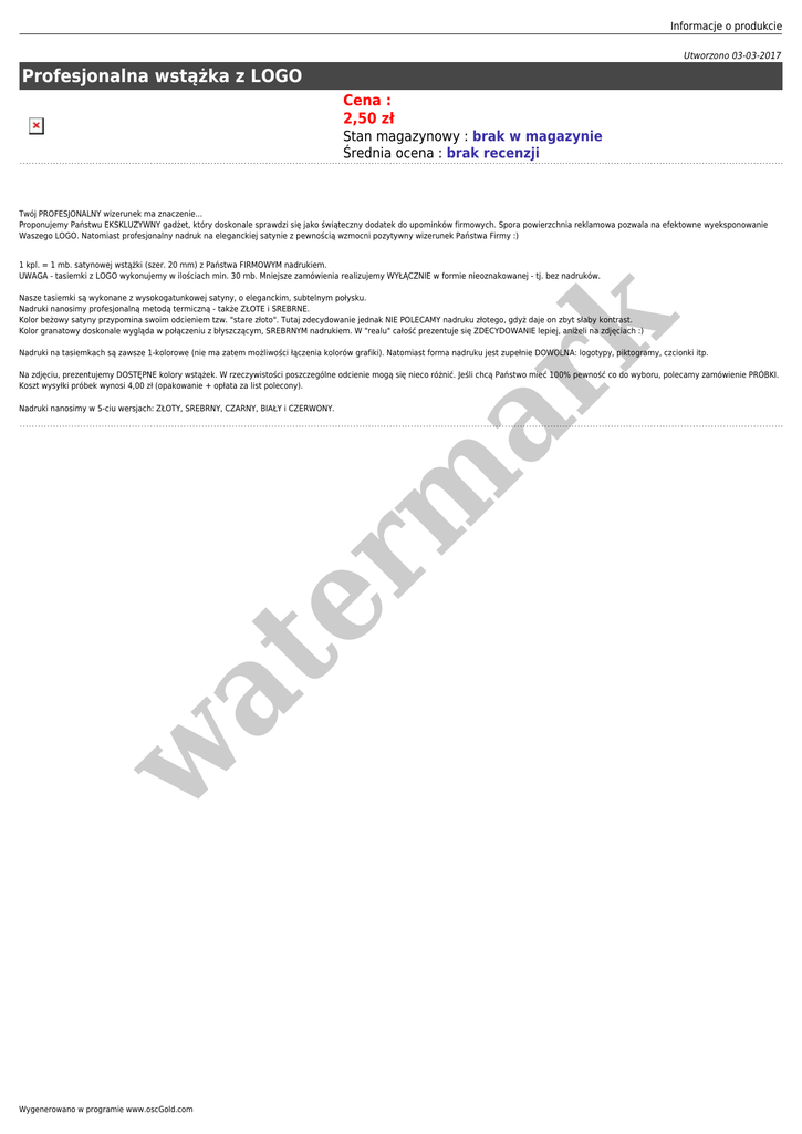Informacje o produkcie Utworzono 03-03-2017 Profesjonalna wstążka z LOGO Cena : 2,50 zł Stan magazynowy : brak w magazynie Średnia ocena : brak recenzji Twój PROFESJONALNY wizerunek ma znaczenie... Proponujemy Państwu EKSKLUZYWNY gadżet, który doskonale sprawdzi się jako świąteczny dodatek do upominków firmowych. Spora powierzchnia reklamowa pozwala na efektowne wyeksponowanie Waszego LOGO. Natomiast profesjonalny nadruk na eleganckiej satynie z pewnością wzmocni pozytywny wizerunek Państwa Firmy :) 1 kpl. = 1 mb. satynowej wstążki (szer. 20 mm) z Państwa FIRMOWYM nadrukiem. UWAGA - tasiemki z LOGO wykonujemy w ilościach min. 30 mb. Mniejsze zamówienia realizujemy WYŁĄCZNIE w formie nieoznakowanej - tj. bez nadruków. er m ar k Nasze tasiemki są wykonane z wysokogatunkowej satyny, o eleganckim, subtelnym połysku. Nadruki nanosimy profesjonalną metodą termiczną - także ZŁOTE i SREBRNE. Kolor beżowy satyny przypomina swoim odcieniem tzw. "stare złoto". Tutaj zdecydowanie jednak NIE POLECAMY nadruku złotego, gdyż daje on zbyt słaby kontrast. Kolor granatowy doskonale wygląda w połączeniu z błyszczącym, SREBRNYM nadrukiem. W "realu" całość prezentuje się ZDECYDOWANIE lepiej, aniżeli na zdjęciach :) Nadruki na tasiemkach są zawsze 1-kolorowe (nie ma zatem możliwości łączenia kolorów grafiki). Natomiast forma nadruku jest zupełnie DOWOLNA: logotypy, piktogramy, czcionki itp. Na zdjęciu, prezentujemy DOSTĘPNE kolory wstążek. W rzeczywistości poszczególne odcienie mogą się nieco różnić. Jeśli chcą Państwo mieć 100% pewność co do wyboru, polecamy zamówienie PRÓBKI. Koszt wysyłki próbek wynosi 4,00 zł (opakowanie + opłata za list polecony). w at Nadruki nanosimy w 5-ciu wersjach: ZŁOTY, SREBRNY, CZARNY, BIAŁY i CZERWONY. Wygenerowano w programie www.oscGold.com