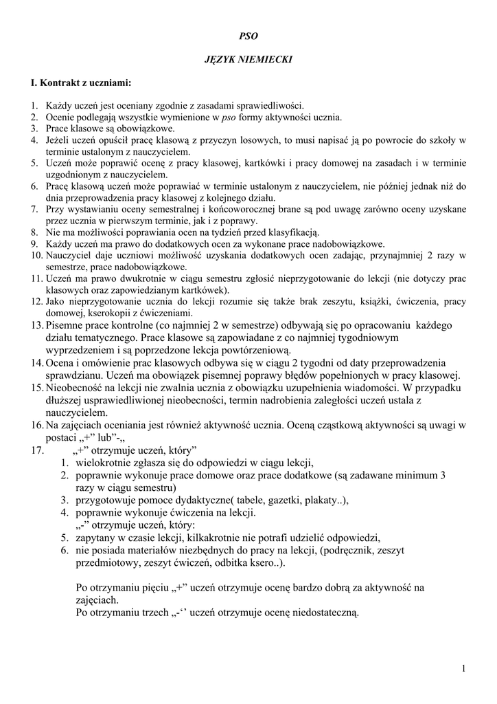 PSO JĘZYK NIEMIECKI I. Kontrakt z uczniami: 1. 2. 3. 4. Każdy uczeń jest oceniany zgodnie z zasadami sprawiedliwości. Ocenie podlegają wszystkie wymienione w pso formy aktywności ucznia. Prace klasowe są obowiązkowe. Jeżeli uczeń opuścił pracę klasową z przyczyn losowych, to musi napisać ją po powrocie do szkoły w terminie ustalonym z nauczycielem. 5. Uczeń może poprawić ocenę z pracy klasowej, kartkówki i pracy domowej na zasadach i w terminie uzgodnionym z nauczycielem. 6. Pracę klasową uczeń może poprawiać w terminie ustalonym z nauczycielem, nie później jednak niż do dnia przeprowadzenia pracy klasowej z kolejnego działu. 7. Przy wystawianiu oceny semestralnej i końcoworocznej brane są pod uwagę zarówno oceny uzyskane przez ucznia w pierwszym terminie, jak i z poprawy. 8. Nie ma możliwości poprawiania ocen na tydzień przed klasyfikacją. 9. Każdy uczeń ma prawo do dodatkowych ocen za wykonane prace nadobowiązkowe. 10. Nauczyciel daje uczniowi możliwość uzyskania dodatkowych ocen zadając, przynajmniej 2 razy w semestrze, prace nadobowiązkowe. 11. Uczeń ma prawo dwukrotnie w ciągu semestru zgłosić nieprzygotowanie do lekcji (nie dotyczy prac klasowych oraz zapowiedzianym kartkówek). 12. Jako nieprzygotowanie ucznia do lekcji rozumie się także brak zeszytu, książki, ćwiczenia, pracy domowej, kserokopii z ćwiczeniami. 13. Pisemne prace kontrolne (co najmniej 2 w semestrze) odbywają się po opracowaniu każdego działu tematycznego. Prace klasowe są zapowiadane z co najmniej tygodniowym wyprzedzeniem i są poprzedzone lekcja powtórzeniową. 14. Ocena i omówienie prac klasowych odbywa się w ciągu 2 tygodni od daty przeprowadzenia sprawdzianu. Uczeń ma obowiązek pisemnej poprawy błędów popełnionych w pracy klasowej. 15. Nieobecność na lekcji nie zwalnia ucznia z obowiązku uzupełnienia wiadomości. W przypadku dłuższej usprawiedliwionej nieobecności, termin nadrobienia zaległości uczeń ustala z nauczycielem. 16. Na zajęciach oceniania jest również aktywność ucznia. Oceną cząstkową aktywności są uwagi w postaci „+” lub”-„ 17. „+” otrzymuje uczeń, który” 1. wielokrotnie zgłasza się do odpowiedzi w ciągu lekcji, 2. poprawnie wykonuje prace domowe oraz prace dodatkowe (są zadawane minimum 3 razy w ciągu semestru) 3. przygotowuje pomoce dydaktyczne( tabele, gazetki, plakaty..), 4. poprawnie wykonuje ćwiczenia na lekcji. „-” otrzymuje uczeń, który: 5. zapytany w czasie lekcji, kilkakrotnie nie potrafi udzielić odpowiedzi, 6. nie posiada materiałów niezbędnych do pracy na lekcji, (podręcznik, zeszyt przedmiotowy, zeszyt ćwiczeń, odbitka ksero..). Po otrzymaniu pięciu „+” uczeń otrzymuje ocenę bardzo dobrą za aktywność na zajęciach. Po otrzymaniu trzech „-‘’ uczeń otrzymuje ocenę niedostateczną. 1 II. Obszary aktywności podlegające ocenianiu: 1. Ocenie podlegają: o prace kontrolne o odpowiedzi ustne o prace domowe o kartkówki o aktywność na lekcji o przygotowanie i realizacja projektu o prace wykonane podczas zajęć: plakaty, makiety, gazetki itp.. 2. Podstawowym kryterium oceny jest zdolność komunikacji w j. niemieckim. 3. Pozostałe kryteria oceny z wypowiedzi ustnych i pisemnych to: o o o poprawność wypowiedzi (fonetyczna, gramatyczna) płynność wypowiedzi umiejętność doboru środków wypowiedzi III. Formy aktywności Formy aktywności Liczba ocen w semestrze ( minimum) Prace klasowe 2 Kartkówki 2 Mówienie 1 Praca w grupach 1 Aktywność na lekcji i w domu 1 (pięć plusów = bdb) Praca metodą projektu 1 Prace domowe 1 IV. Kryteria oceniania Praca pisemna: Poniżej 44%- ocena niedostateczna 45%- 59%- ocena dopuszczająca 60%- 74%- ocena dostateczna 75%- 89%- ocena dobra 90%- 100%- ocena bardzo dobra powyżej 100%- ocena celująca V. Sposób ustalania oceny semestralnej i końcoworocznej - nie ma możliwości poprawy ocen na tydzień przed terminem klasyfikacji - przy wystawianiu oceny na koniec semestru/roku, brane są pod uwagę zarówno oceny uzyskane w pierwszym terminie, jak i z poprawy - Przy ustalaniu oceny semestralnej nauczyciel bierze pod uwagę stopnie ucznia z poszczególnych obszarów aktywności według następującej kolejności: 2 • • • • • • • • • • • prace klasowe sprawdziany odpowiedzi prace domowe prace dodatkowe aktywność na lekcji Ocenę celującą otrzymuje uczeń, który spełnia wymagania na ocenę bardzo dobrą, uzyskuje oceny celujące z prac klasowych, sprawdzianów i prac domowych, systematycznie wykonuje prace nadobowiązkowe polecenia nauczyciela wypełnia zawsze systematycznie i sumiennie, prezentując wzorowy stosunek do przedmiotu, uczestniczy i zdobywa nagrody w konkursach przedmiotowych w szkole lub poza szkołą oraz wykazuje się umiejętnościami ponadprogramowymi VI. Informowanie uczniów i rodziców o wymaganiach i postępach ucznia a. nauczyciel - uczeń • nauczyciel przekazuje uczniowi komentarz do każdej wystawionej oceny; • uczeń ma możliwość otrzymywania dodatkowych wyjaśnień i uzasadnień do wystawionej oceny; b. nauczyciel - rodzic • podczas wywiadówek, indywidualnych konsultacji rodzic może uzyskać informacje o postępach w nauce dziecka; VII. Wymagania na poszczególne oceny 3