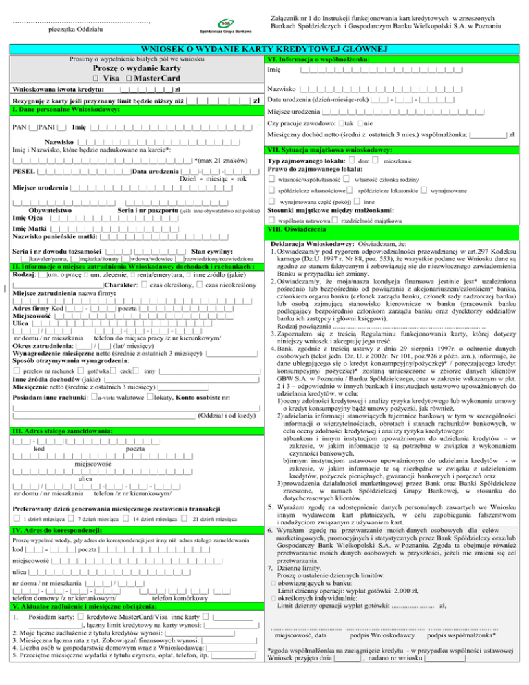 Załącznik nr 1 do Instrukcji funkcjonowania kart kredytowych w zrzeszonych Bankach Spółdzielczych i Gospodarczym Banku Wielkopolski S.A. w Poznaniu ............................................................., pieczątka Oddziału WNIOSEK O WYDANIE KARTY KREDYTOWEJ GŁÓWNEJ Prosimy o wypełnienie białych pól we wniosku VI. Informacja o współmałżonku: Proszę o wydanie karty Visa MasterCard Wnioskowana kwota kredytu: Imię |__|__|__|__|__|__| zł |__|__|__|__|__|__|__|__|__|__|__|__|__|__|__|__|__|__|__| Nazwisko |__|__|__|__|__|__|__|__|__|__|__|__|__|__|__|__|__|__|__| Rezygnuję z karty jeśli przyznany limit będzie niższy niż |__|__|__|__|__|__| I. Dane personalne Wnioskodawcy: zł Data urodzenia (dzień-miesiąc-rok) |__|__| - |__|__| - |__|__|__|__| PAN |__|PANI |__| Imię |__|__|__|__|__|__|__|__|__|__|__|__|__|__|__|__|__|__|__| Miejsce urodzenia |__|__|__|__|__|__|__|__|__|__|__|__|__|__|__|__|__|__|__| Czy pracuje zawodowo: tak nie Miesięczny dochód netto (średni z ostatnich 3 mies.) współmałżonka: |__________| zł Nazwisko |__|__|__|__|__|__|__|__|__|__|__|__|__|__|__|__|__|__|__| Imię i Nazwisko, które będzie nadrukowane na karcie*: |__|__|__|__|__|__|__|__|__|__|__|__|__|__|__|__|__|__|__|__|__| *(max 21 znaków) PESEL |__|__|__|__|__|__|__|__|__|__|__|Data urodzenia |__|__|-|__|__| -|__|__|__|__| Dzień - miesiąc - rok Miejsce urodzenia |__|__|__|__|__|__|__|__|__|__|__|__|__|__|__|__|__|__|__| |__|__|__|__|__|__|__|__|__|__|__|__| |__|__|__|__|__|__|__|__|__|__|__|__| Obywatelstwo Seria i nr paszportu (jeśli inne obywatelstwo niż polskie) Imię Ojca |__|__|__|__|__|__|__|__|__|__|__|__|__|__|__| Imię Matki |__|__|__|__|__|__|__|__|__|__|__|__|__|__|__| Nazwisko panieńskie matki: |__|__|__|__|__|__|__|__|__|__|__|__|__|__|__| VII. Sytuacja majątkowa wnioskodawcy: Typ zajmowanego lokalu: dom Prawo do zajmowanego lokalu: własność/współwłasność mieszkanie własność członka rodziny spółdzielcze własnościowe wynajmowana część (pokój) spółdzielcze lokatorskie wynajmowane inne Stosunki majątkowe między małżonkami: wspólnota ustawowa rozdzielność majątkowa VIII. Oświadczenia Deklaracja Wnioskodawcy: Oświadczam, że: 1. Oświadczam/y pod rygorem odpowiedzialności przewidzianej w art.297 Kodeksu karnego (Dz.U. 1997 r. Nr 88, poz. 553), że wszystkie podane we Wniosku dane są zgodne ze stanem faktycznym i zobowiązuję się do niezwłocznego zawiadomienia Banku w przypadku ich zmiany. 2. Oświadczam/y, że moja/nasza kondycja finansowa jest/nie jest* uzależniona |_________________________|Charakter: czas określony, czas nieokreślony pośrednio lub bezpośrednio od powiązania z akcjonariuszem/członkiem* banku, Miejsce zatrudnienia nazwa firmy: członkiem organu banku (członek zarządu banku, członek rady nadzorczej banku) |__|__|__|__|__|__|__|__|__|__|__|__|__|__|__|__|__|__|__|__|__|__|__|__|__|__|__|__| lub osobą zajmującą stanowisko kierownicze w banku (pracownik banku Adres firmy Kod |__|__| - |__|__|__| poczta |__|__|__|__|__|__|__|__|__|__|__| podlegający bezpośrednio członkom zarządu banku oraz dyrektorzy oddziałów Miejscowość |__|__|__|__|__|__|__|__|__|__|__|__|__|__|__|__|__|__|__|__|__| banku ich zastępcy i główni księgowi). Ulica |__|__|__|__|__|__|__|__|__|__|__|__|__|__|__|__|__|__|__|__|__| Rodzaj powiązania ...................................................................................... |__|__|__| / |__|__|__| |__|__|__| -|__|__| - |__|__| - |__|__|__| 3. Zapoznałem się z treścią Regulaminu funkcjonowania karty, której dotyczy nr domu / nr mieszkania telefon do miejsca pracy /z nr kierunkowym/ niniejszy wniosek i akceptuję jego treść. Okres zatrudnienia: |____| / |___| (lat/ miesięcy) 4. Bank, zgodnie z treścią ustawy z dnia 29 sierpnia 1997r. o ochronie danych Wynagrodzenie miesięczne netto (średnie z ostatnich 3 miesięcy) |______________| osobowych (tekst jedn. Dz. U. z 2002r. Nr 101, poz.926 z późn. zm.), informuje, że Sposób otrzymywania wynagrodzenia: dane ubiegającego się o kredyt konsumpcyjny/pożyczkę)* / poręczającego kredyt przelew na rachunek gotówka czek inny |____________________________| konsumpcyjny/ pożyczkę)* zostaną umieszczone w zbiorze danych klientów GBW S.A. w Poznaniu / Banku Spółdzielczego, oraz w zakresie wskazanym w pkt. Inne źródła dochodów (jakie) |___________________________________________| 2 i 3 – odpowiednio w innych bankach i instytucjach ustawowo upoważnionych do Miesięcznie netto (średnie z ostatnich 3 miesięcy) |______________| udzielania kredytów, w celu: Posiadam inne rachunki: a-vista walutowe lokaty, Konto osobiste nr: 1) oceny zdolności kredytowej i analizy ryzyka kredytowego lub wykonania umowy |_____________________________________________________________________| o kredyt konsumpcyjny bądź umowy pożyczki, jak również, |___________________________________________________| (Oddział i od kiedy) 2) udzielania informacji stanowiących tajemnice bankową w tym w szczególności informacji o wierzytelnościach, obrotach i stanach rachunków bankowych, w III. Adres stałego zameldowania: celu oceny zdolności kredytowej i analizy ryzyka kredytowego: a) bankom i innym instytucjom upoważnionym do udzielania kredytów – w |__|__| - |__|__|__| |__|__|__|__|__|__|__|__|__|__|__| zakresie, w jakim informacje te są potrzebne w związku z wykonaniem kod poczta czynności bankowych, |__|__|__|__|__|__|__|__|__|__|__|__|__|__|__|__|__|__|__|__|__| b) innym instytucjom ustawowo upoważnionym do udzielania kredytów - w miejscowość zakresie, w jakim informacje te są niezbędne w związku z udzieleniem |__|__|__|__|__|__|__|__|__|__|__|__|__|__|__|__|__|__|__|__|__| kredytów, pożyczek pieniężnych, gwarancji bankowych i poręczeń oraz ulica 3) prowadzenia działalności marketingowej przez Bank oraz Banki Spółdzielcze |__|__|__| / |__|__|__| |__|__|__| -|__|__| - |__|__| - |__|__|__| zrzeszone, w